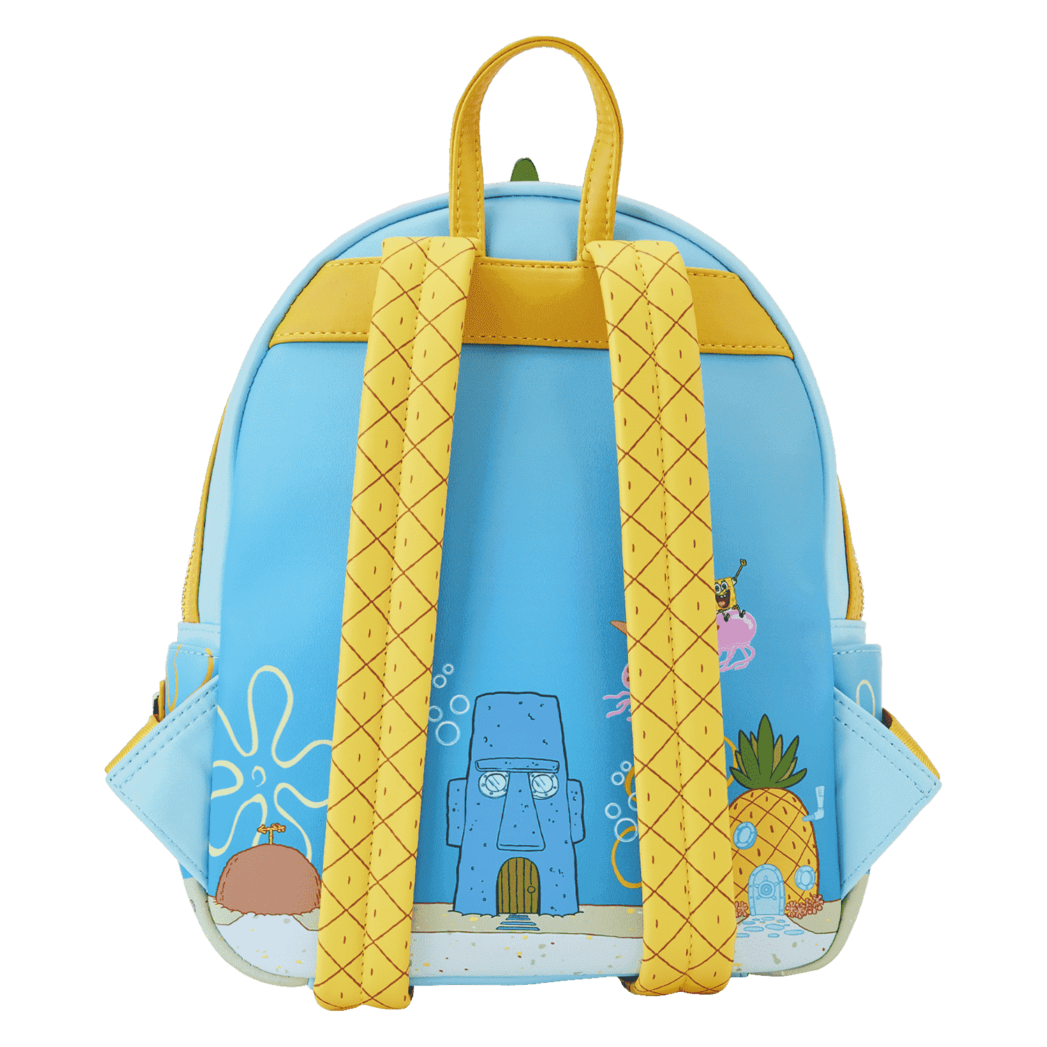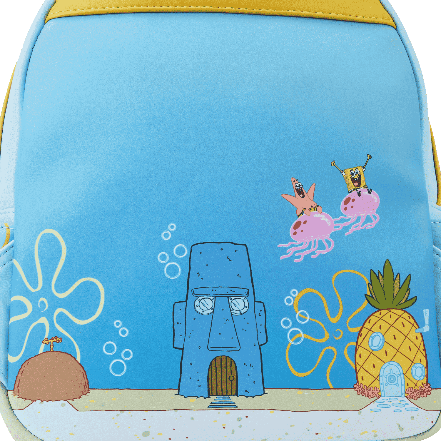 Ahhh, another beautiful day in Bikini Bottom. Tour the Loungefly SpongeBob SquarePants Pineapple House Mini Backpack, where a tropical abode takes shape on the bag’s front zipper pocket. Open the front door to visit SpongeBob as he waits to welcome you inside. Gary the snail joins the fun as an enamel zipper charm, and other beloved Bikini Bottom citizens appear on the side pockets. Turn the bag around to see SpongeBob and Patrick take a jellyfish ride through their neighborhood. Whether you’re grabbing a bite at the Krusty Krab or hanging with your friends at Goo Lagoon, this mini backpack will keep your treasures safe through any nautical nonsense.