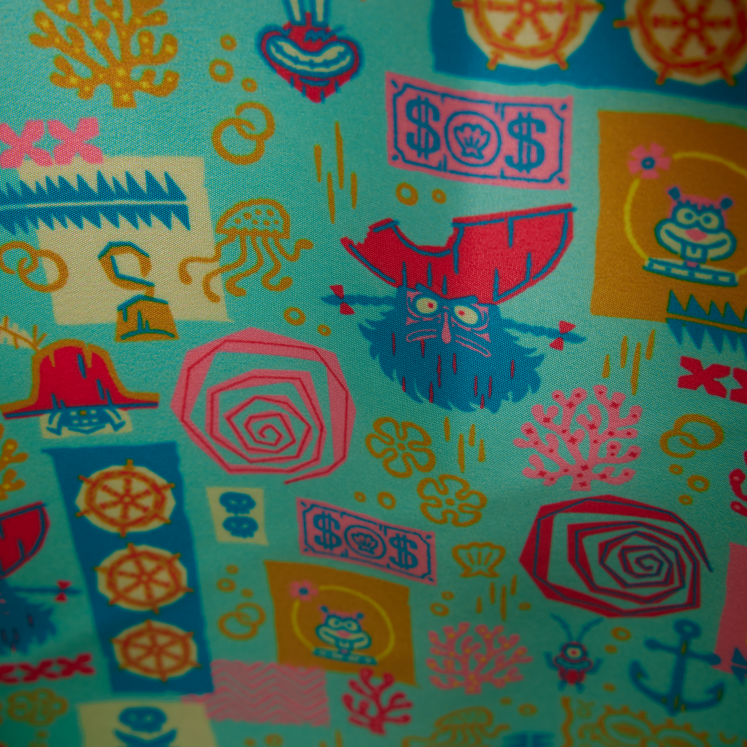 This crossbody bag features a 3D embroidered Jolly Roger symbol, but instead of a usual skull and crossbones, it's a sponge skull and crossbones! You'll find embroidered symbols surrounding it, like anchors, coral, and jellyfish! Turn the bag around to find the image of a compass. To really embody that under-the-sea vibe, there's a 3D bamboo handle!