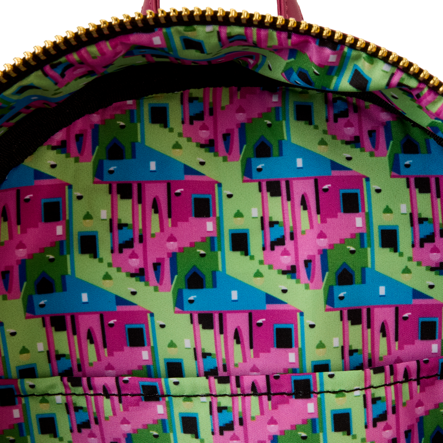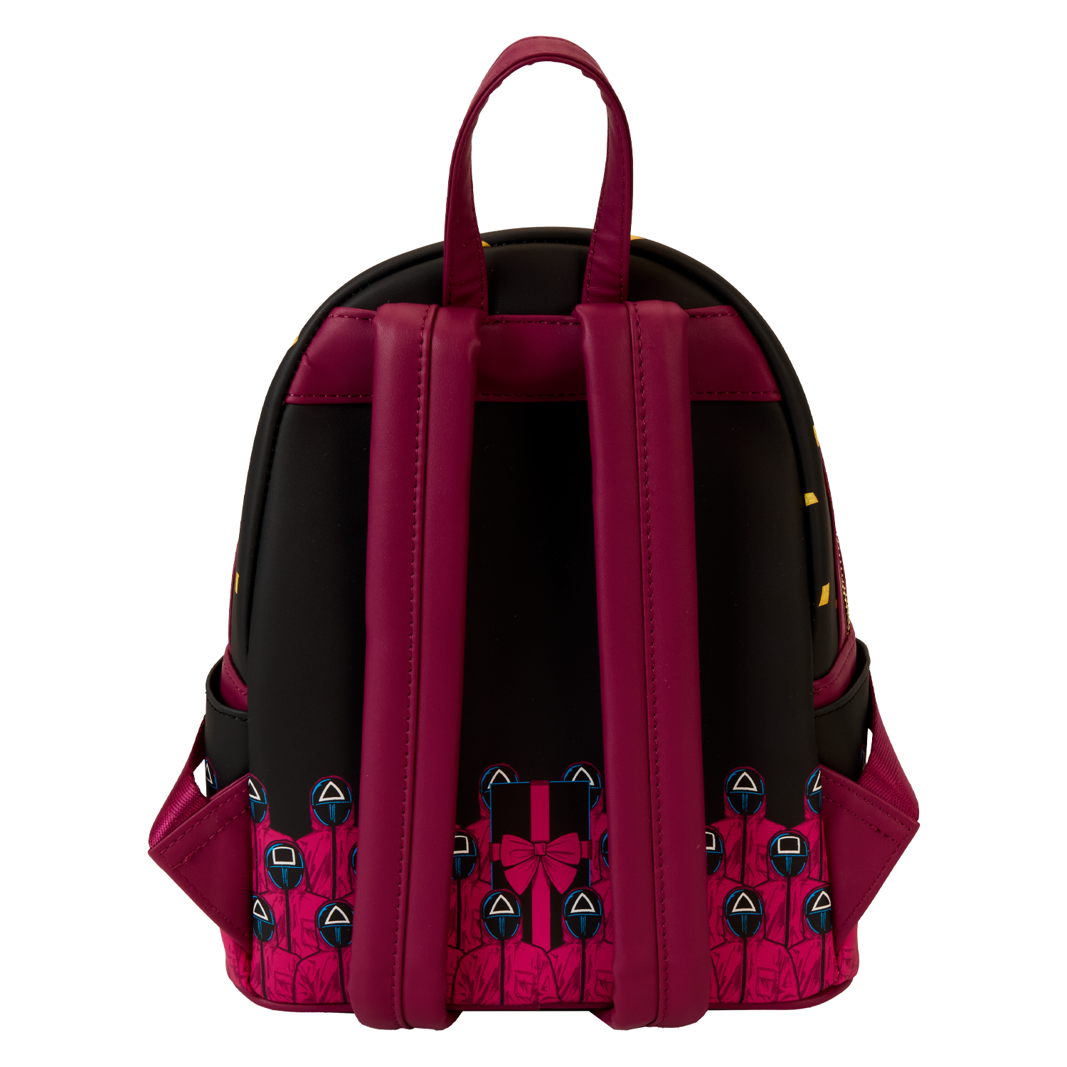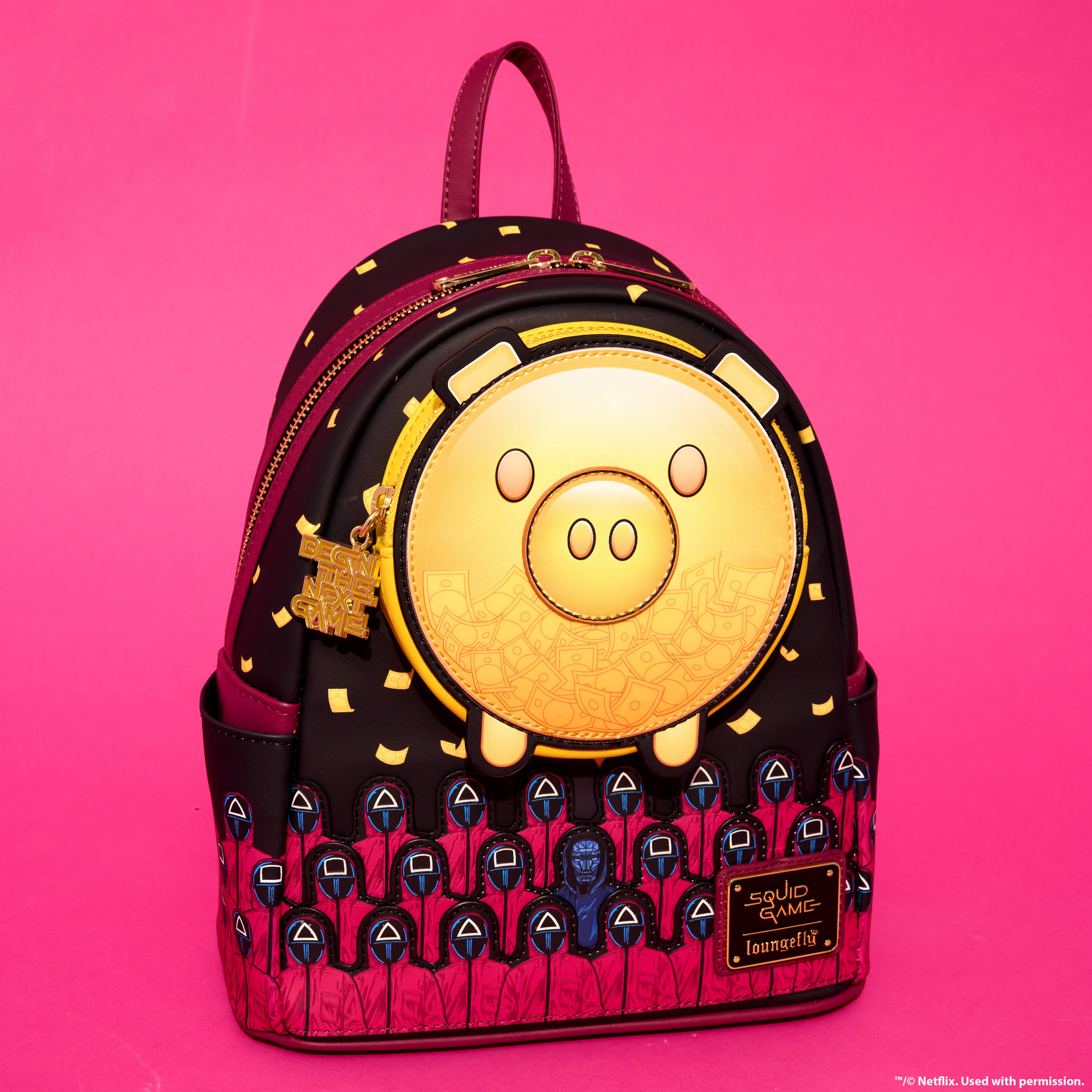 Walk away with the prize. Create a winning look with our Squid Game mini backpack. Relive iconic moments from the Netflix series with this fashionable accessory. The front features a golden, translucent piggy bank. The piggy bank’s face, which doubles as a figural circular pocket, has clear PVC material, adding a realistic shine. Squid Game Masked Soldiers await below as printed bills float down from above. Among them, you’ll be able to spot Front Man. In the dark, shapes on the soldiers’ masks glow. Flip the backpack around, and you’ll see an encore of the guards as a print with a wrapped “gift box” sticking up among them. Pack your daily essentials and take on any challenge in style.