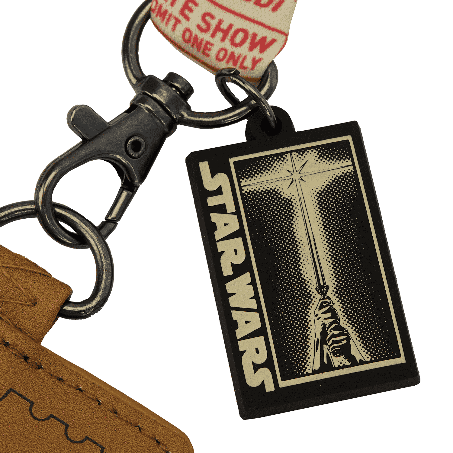 Your ticket to a fashionably stellar world premiere keepsake is not a galaxy away. Blast off to fun adventures with our Loungefly Star Wars™ Return of the Jedi™ World Premiere Ticket Lanyard with Card Holder. The card holder is cut into the shape of a Return of the Jedi 1983 “world premiere” ticket. A rubber charm of a Return of the Jedi movie poster also comes with the lanyard. The woven strap features a colorful pattern of various styles of ticket stubs for the movie. It’s the perfect accessory for keeping your favorite movie memories close—and displaying your favorite pins.