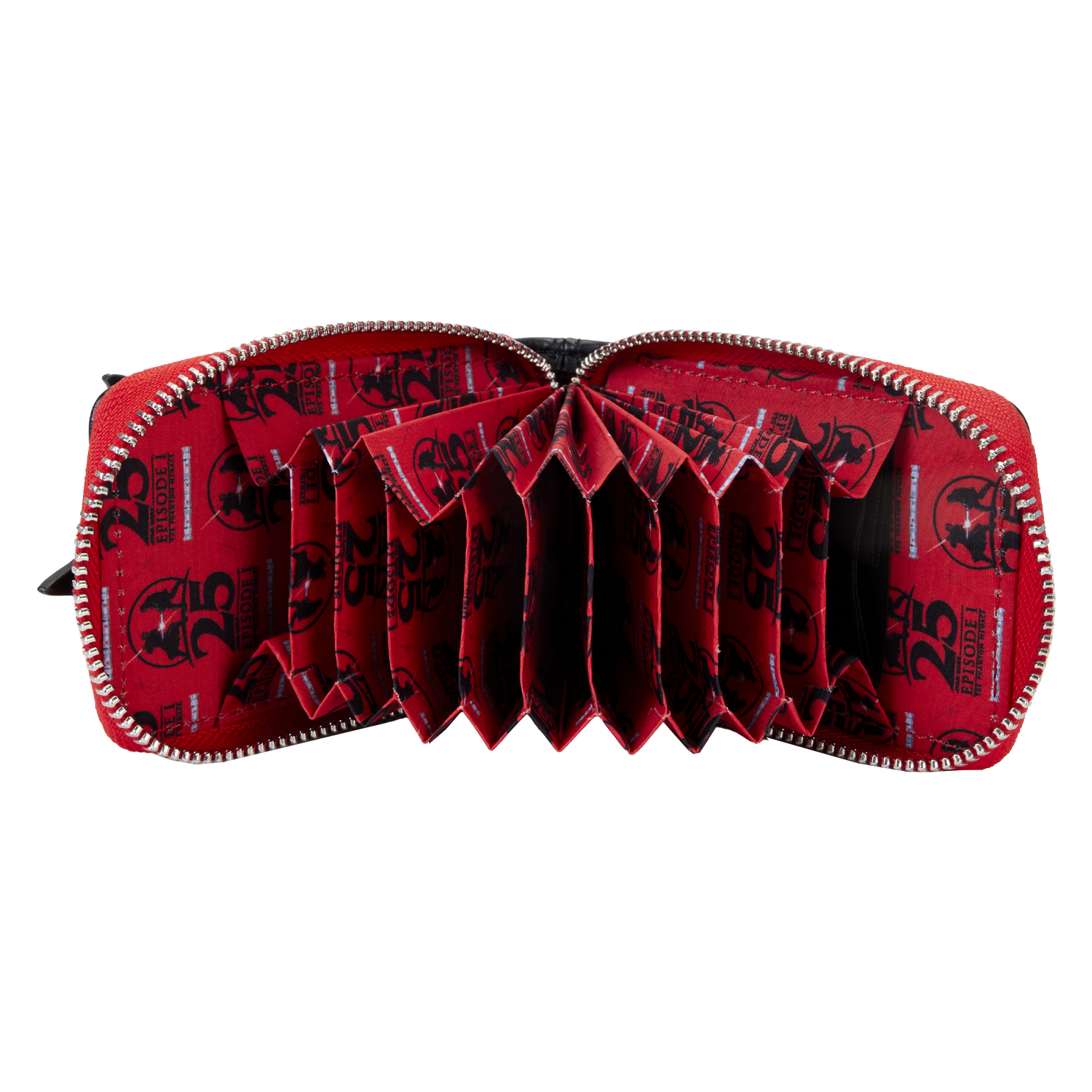 The Loungefly STAR WARS Phantom Menace 25th Anniversary Darth Maul Accordion Wallet is made of vegan leather (polyurethane). Wallet zips closed with shiny silver hardware and includes plenty of pockets for holding cards. Additional features include applique, debossed, glow-in-the-dark, and printed details. Take note of the coordinating inside lining.