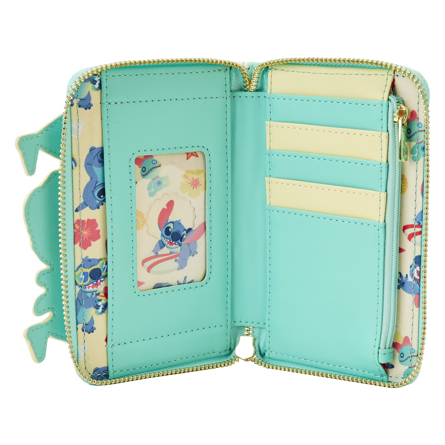 The Loungefly Disney Stitch Sandcastle Beach Surprise Zip-Around Wallet is made of vegan leather (polyurethane). Wallet zips closed with shiny gold-colored metal hardware. Additional features include applique, embossed, and printed details. Take note of the coordinating inside lining.