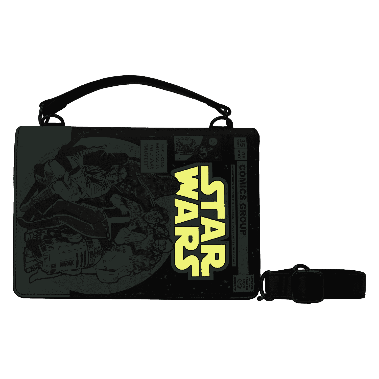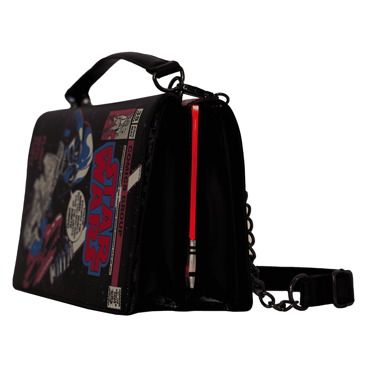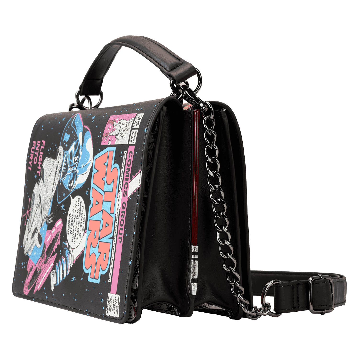 On one side, Luke Skywalker™ holds a lightsaber as he joins Princess Leia™, Han Solo™, Chewbacca™, C-3PO™, and R2-D2™. On the other, Darth Vader™ faces off against the Millennium Falcon™. Turn down the lights to activate the glow-in-the-dark details on the titles of each cover and lift the panels to reveal coordinating comic book images underneath. On the sides of the bag, LED lightsabers illuminate your next steps. Whether you’re feeling like a Jedi master or want to embrace your inner baddie, this fashionable piece will have you turning heads across the galaxy.