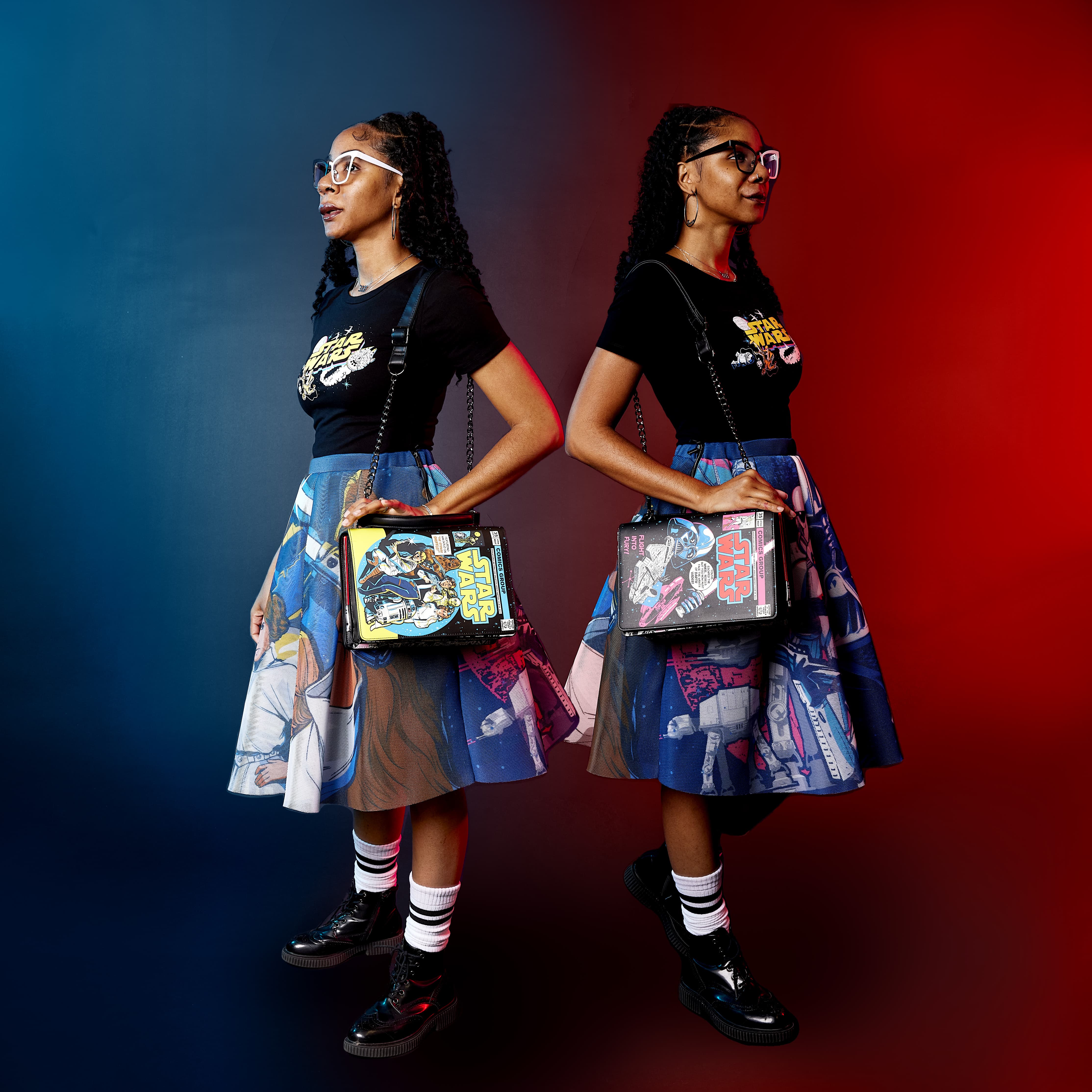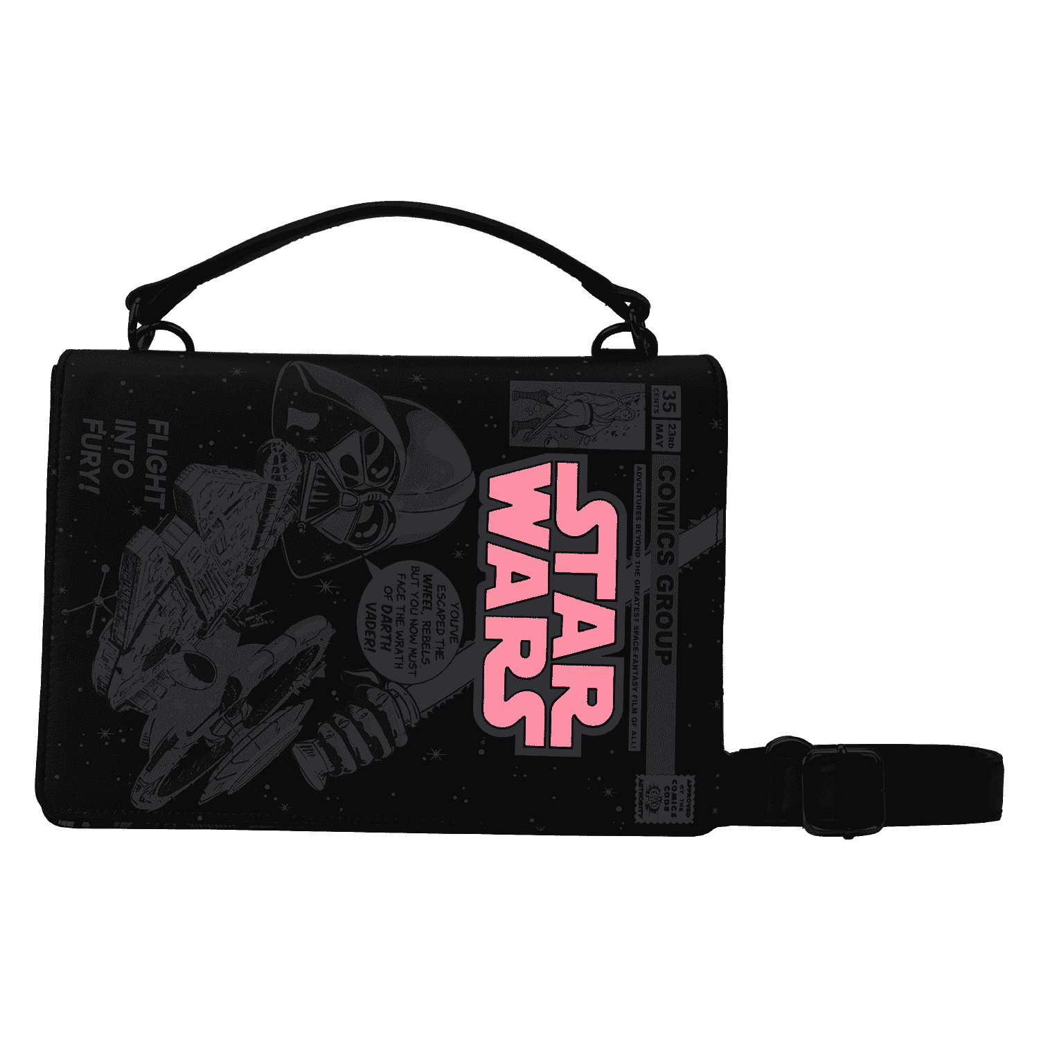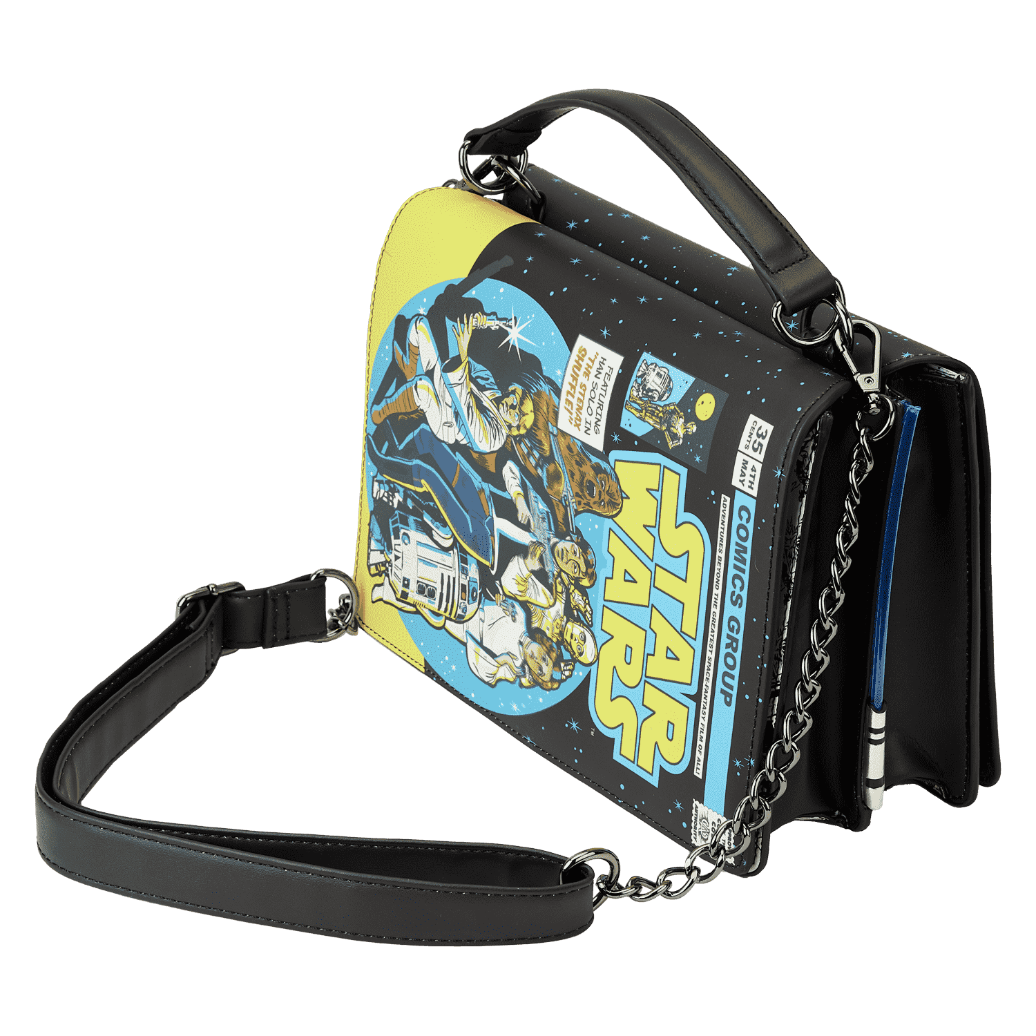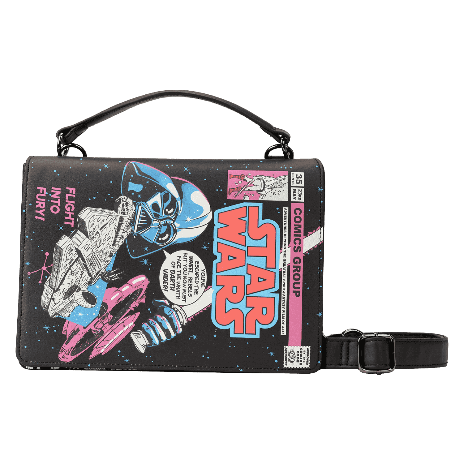 On one side, Luke Skywalker™ holds a lightsaber as he joins Princess Leia™, Han Solo™, Chewbacca™, C-3PO™, and R2-D2™. On the other, Darth Vader™ faces off against the Millennium Falcon™. Turn down the lights to activate the glow-in-the-dark details on the titles of each cover and lift the panels to reveal coordinating comic book images underneath. On the sides of the bag, LED lightsabers illuminate your next steps. Whether you’re feeling like a Jedi master or want to embrace your inner baddie, this fashionable piece will have you turning heads across the galaxy.