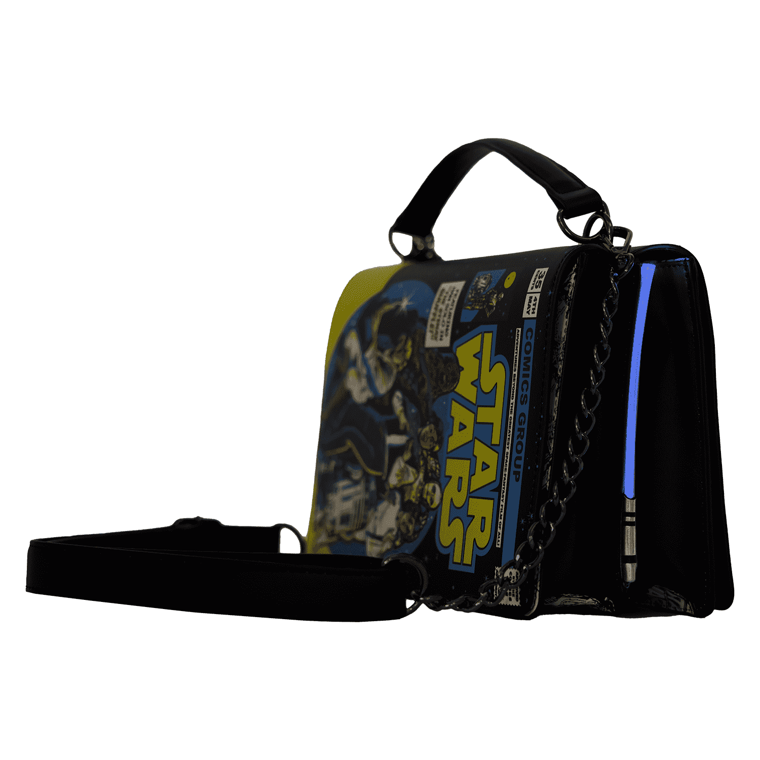 Why should one path of the force have all the fun? With the Stitch Shoppe by Loungefly Dark Side Vs. Light Side Comic Book Light Up Crossbody Bag, you can change up your look – and your alliance – on a whim. This reversible bag features vintage comic book-style artwork on either side, giving a trendy twist to a retro design.