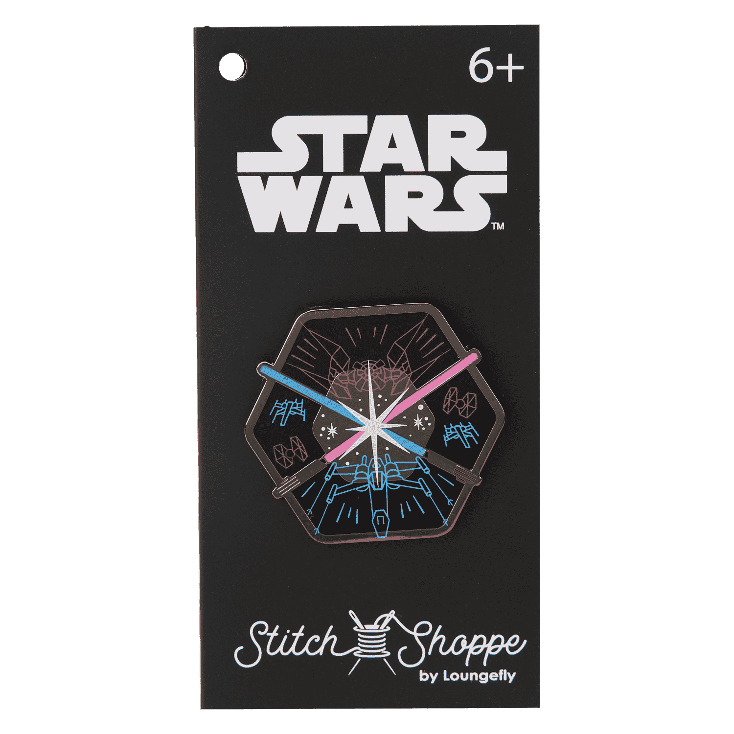 Each bag also comes with an enamel pin featuring light side and dark side motifs, which is approximately 1.5 in (3.8 cm) tall. This pin is only available with this Stitch Shoppe by Loungefly collection!