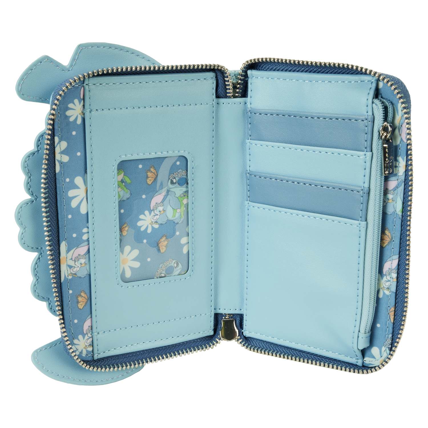 New beginnings are in bloom! Embrace a season of fresh starts with the Loungefly Lilo & Stitch Springtime Stitch Cosplay Zip Around Wallet. On the front, the loveable alien wears a crown of daisies as embroidered details highlight his facial features. Look closely and you’ll see a butterfly perched on his nose! On the back, a frog friend wears a flower crown. Open the wallet to find four slots for holding cards and clear slot for holding ID. This wallet has plenty of room to carry your belongings and makes an adorable companion to any outing with friends.