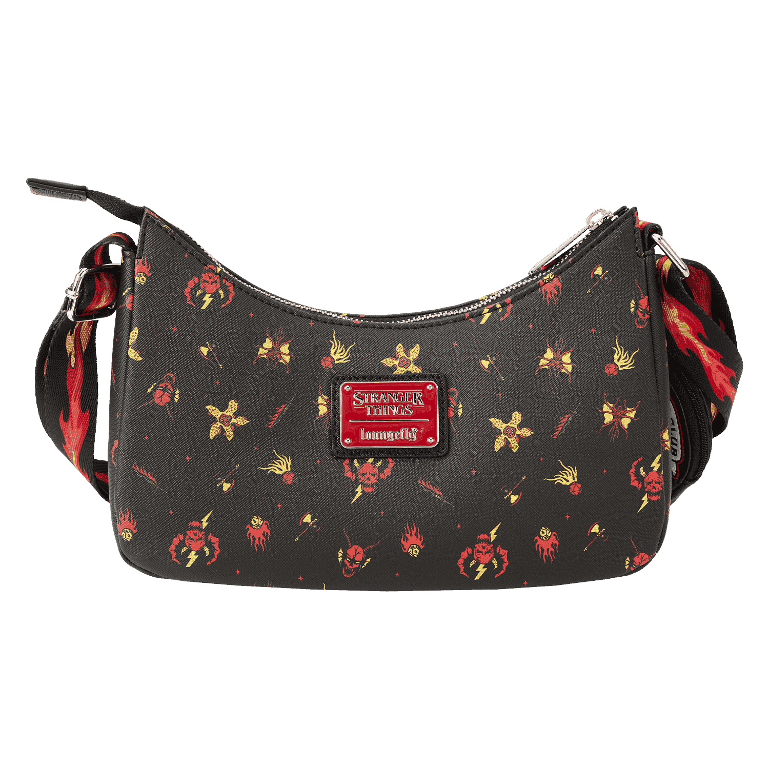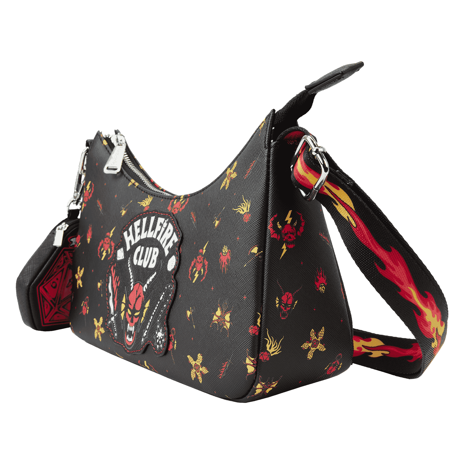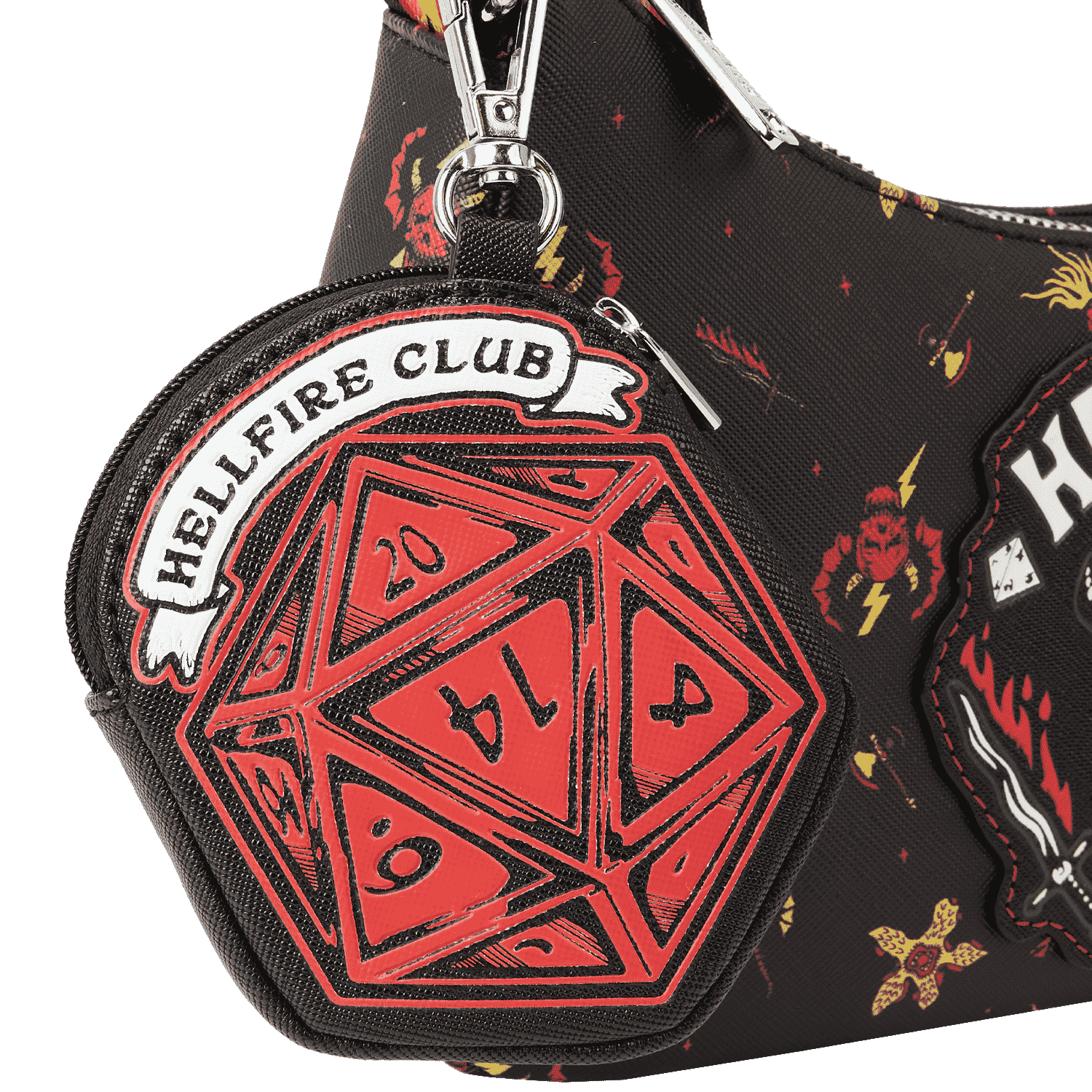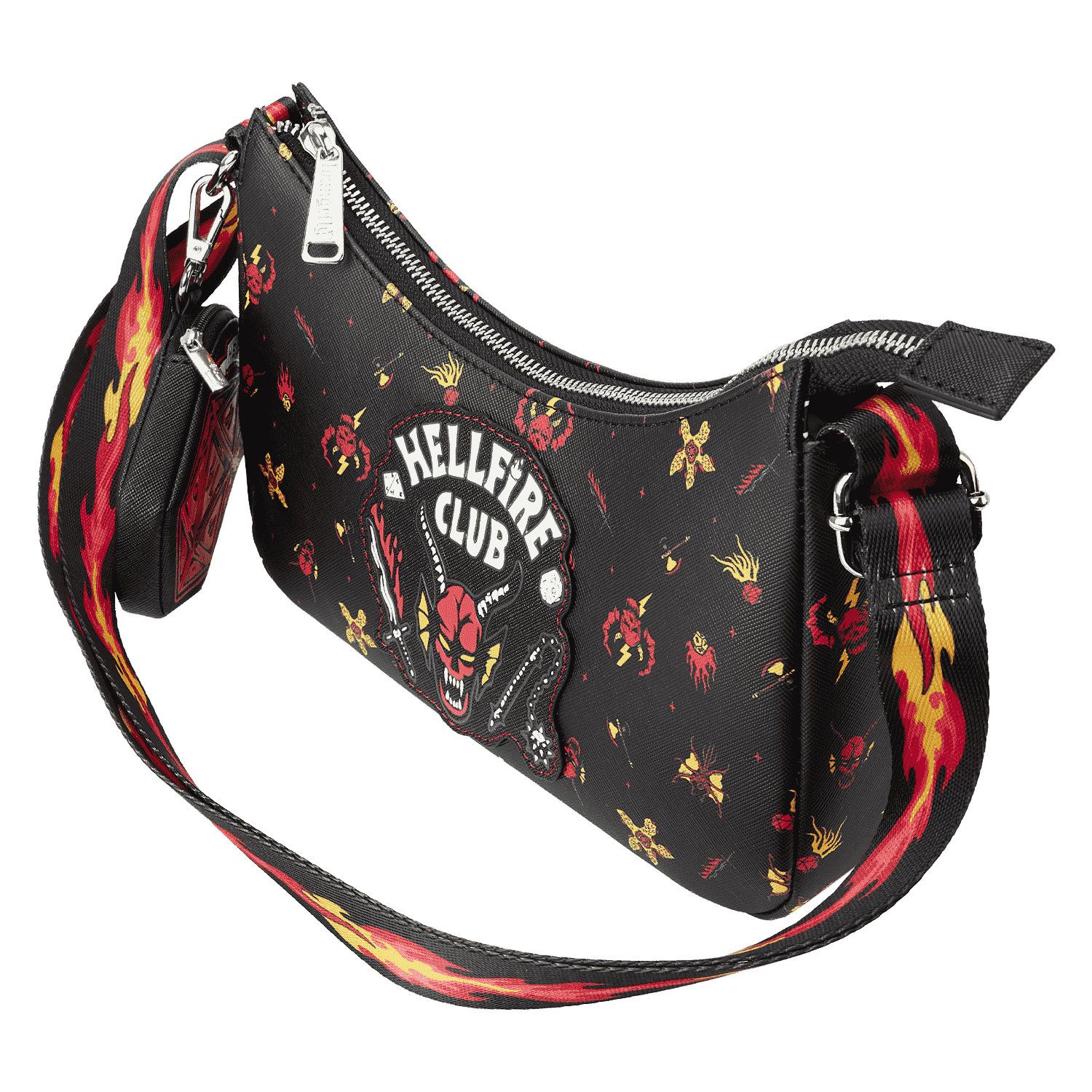 Head off to the next Hellfire Club meeting in style. Bring along our Loungefly Netflix Stranger Things Hellfire Club Crossbody Bag. This classic Loungefly “baguette” bag carries the Hellfire Club logo, which glows in the dark! The logo repeats as a motif in an all-over pattern across the bag. Flames shoot across the straps, and a detachable coin bag, featuring the winning roll of the dice, creates extra room for storing smaller items. Take on Vecna—or your day—in effortless fashion.