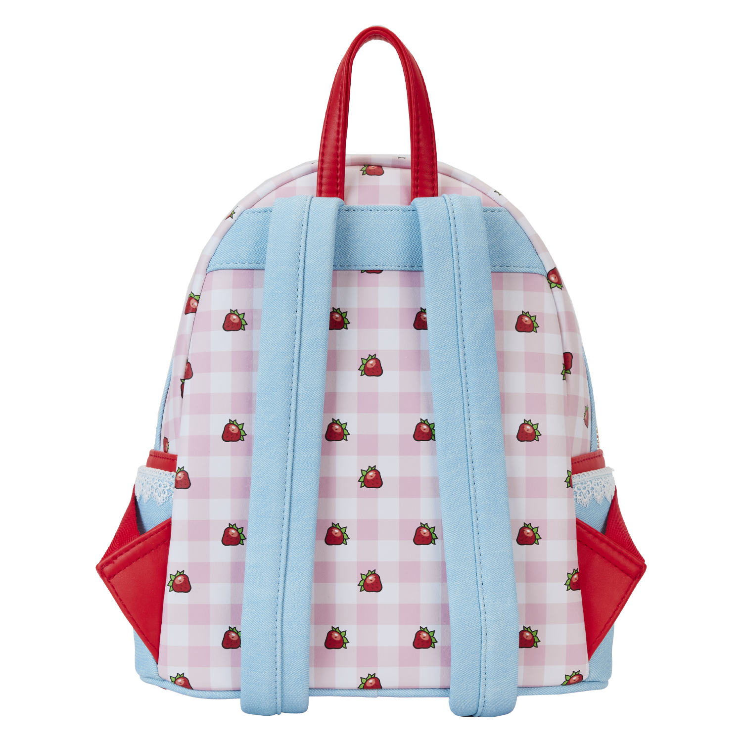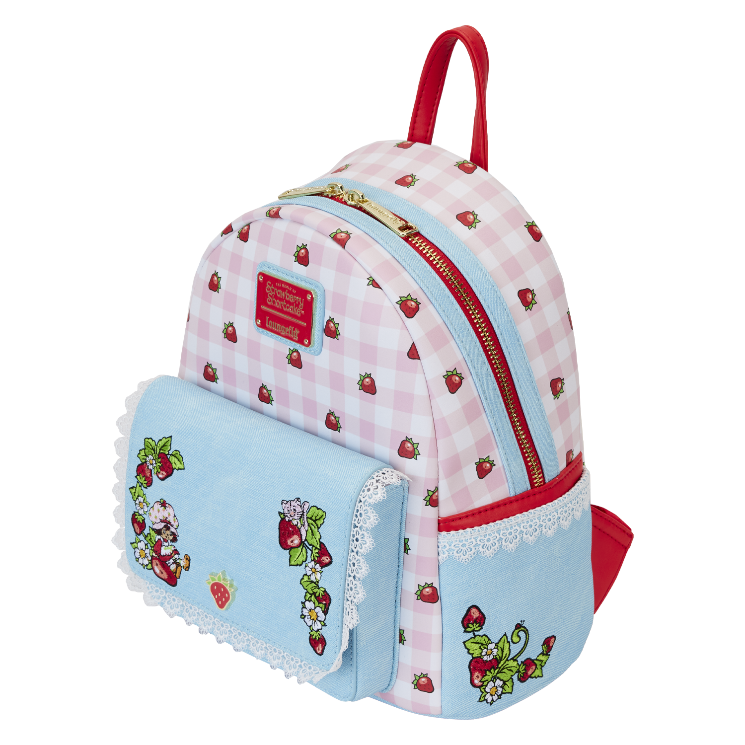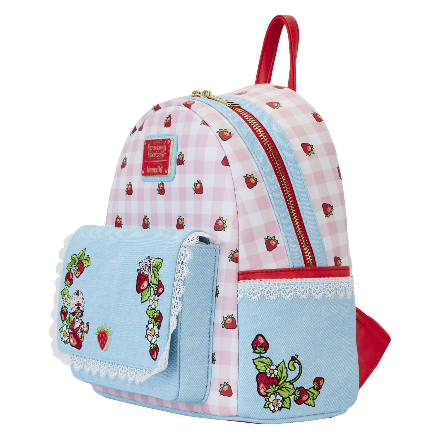 Stroll through Strawberryland™ looking berry sweet! Our Loungefly Strawberry Shortcake Denim Pocket Mini Backpack is ready for some fun. A mixture of materials adds textural accents—and this backpack is strawberry-scented! On the front pocket, which features material made to look like denim, Strawberry Shortcake and Custard appear in embroidered detail. A metal rivet enamel strawberry, in the center, allows you to open the flap and discover Strawberry Shortcake and Custard in a new scene. Scalloped lace edges add a charming touch, and these denim and lace details continue on the side pockets, where you’ll also discover strawberries growing among vines and flowers. On the back, top, and front of this accessory, a delightful pink and white gingham pattern appears, along with bright red strawberries. Secure just what you need for the day in this handy backpack and celebrate Strawberry Shortcake’s 45th anniversary in a berry fashionable way.