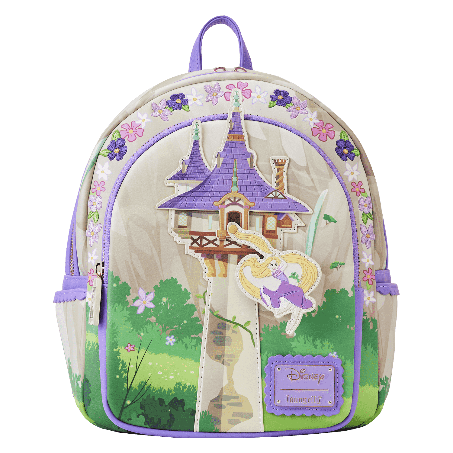 The best day ever is in full swing! Our Loungefly Disney Tangled Rapunzel Swinging from the Tower Mini Backpack is perfect for a quick getaway, in style. On the front, Rapunzel escapes the confines of the tower, swinging down by her glorious hair—and she moves on a rivet! The applique spires of the tower rise up over the top, and the entire scene is bordered by embroidered flowers above. A silicone rubber charm of a “wanted” poster of Flynn Rider completes the look on the front. Even the side pockets are part of the big picture. Beautiful artwork of green grass appears on the pockets, and on the left pocket, you’ll also find Rapunzel’s magic flower. On the back, Rapunzel makes an encore appearance, lying down in the fields of green grass, and she’s holding Pascal. Flynn Rider leans against a tree in the background. Put your favorite day plans into action with this brilliant accessory.