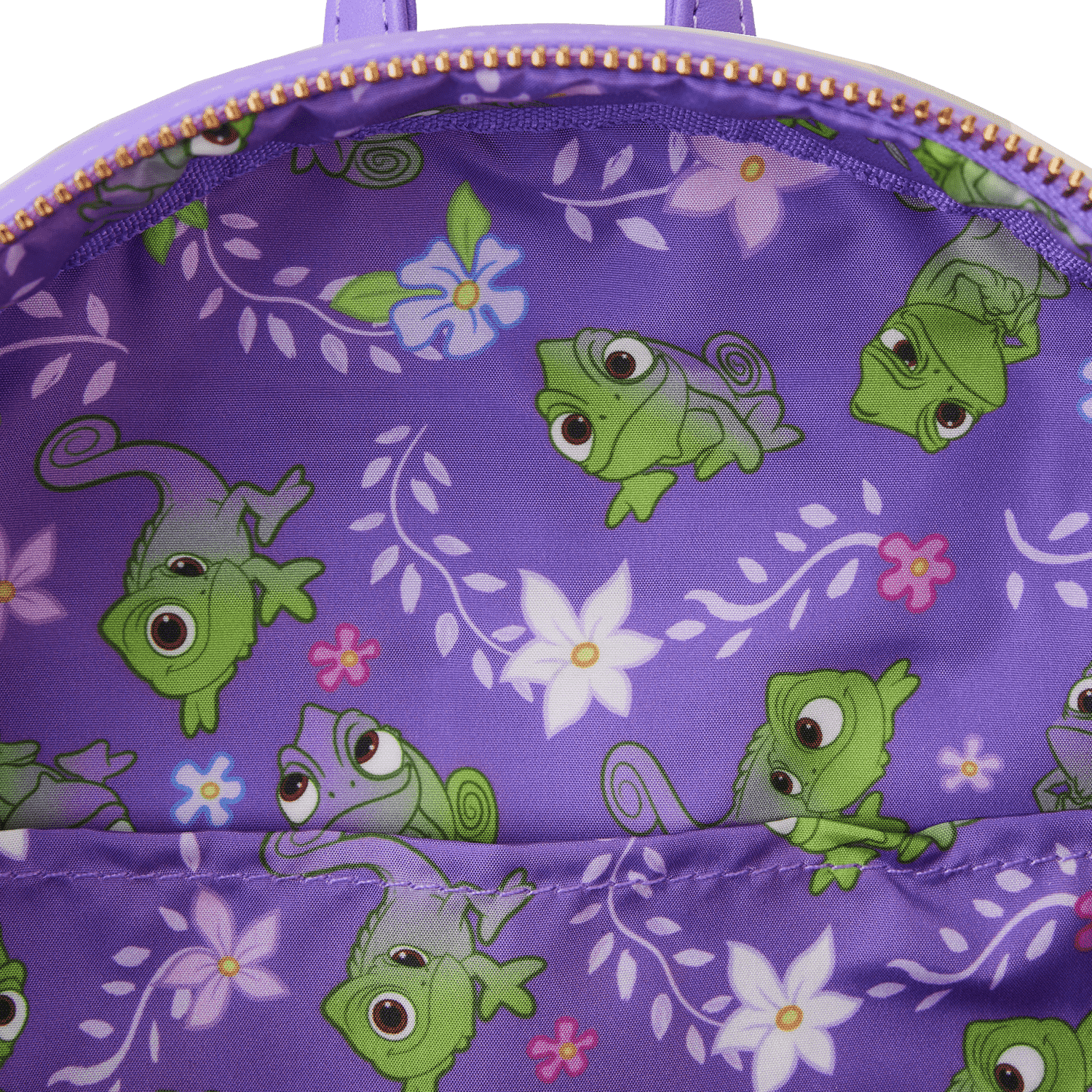 The Loungefly Disney Tangled Rapunzel Swinging from the Tower Mini Backpack is made of vegan leather (polyurethane) and has rose gold-colored metal hardware. Bag has adjustable shoulder straps, side pockets, a rivet for movable details, and a silicone charm. Additional features include applique, printed, debossed, and embroidered details. Take note of the coordinating inside lining.