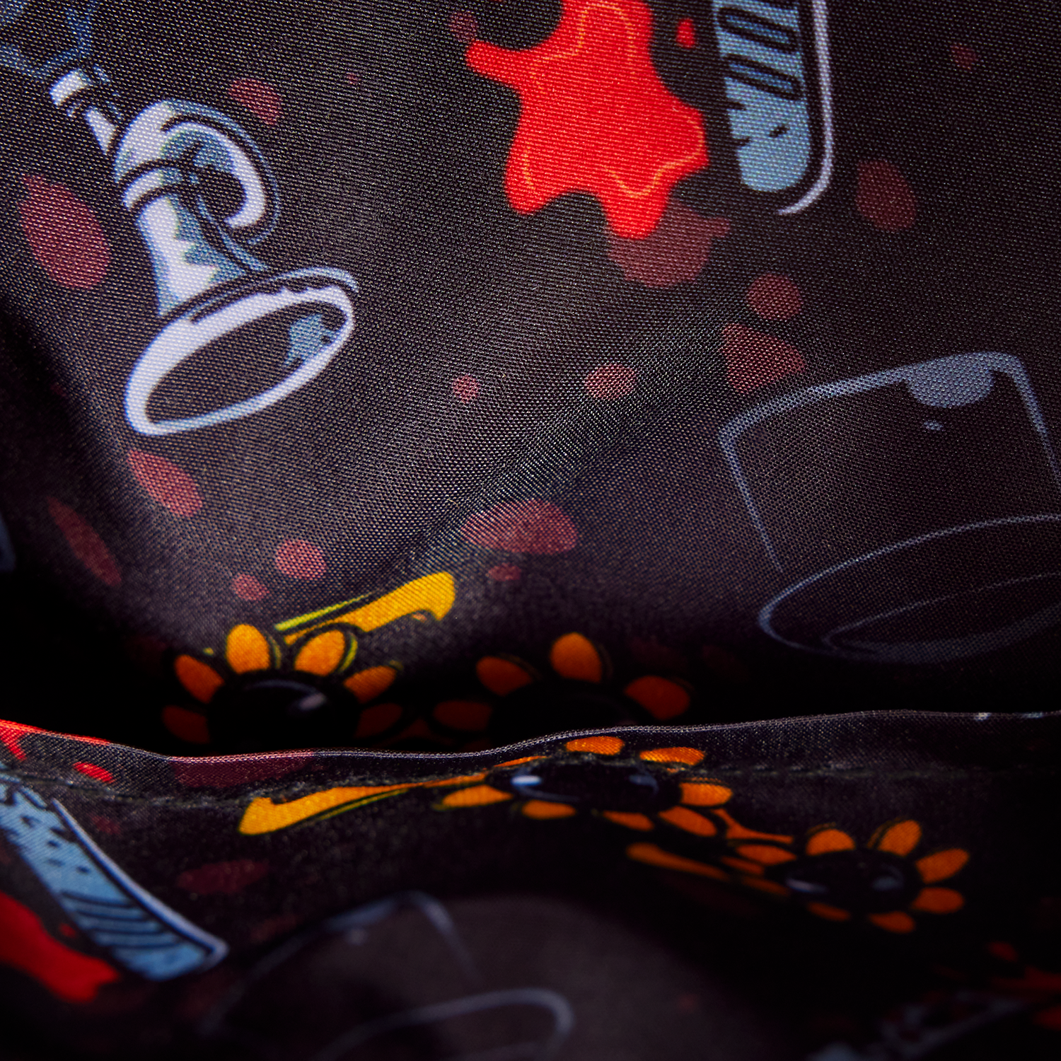 Art comes to life in applique, embossed, and embroidered detail. He wears sunflower sunglasses that glow in the dark, has real ruffles on his collar and the side pockets, and a pom-pom as part of his ensemble. He even wears a small applique top hat! Turn the bag around to find bloody designs dripping down the straps!