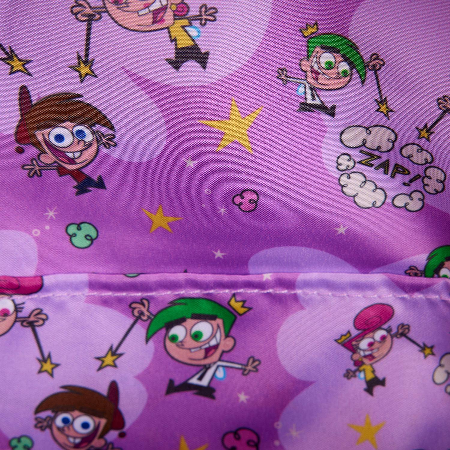 This mini backpack features three pockets – one features Wanda, one features Cosmo, and one features Timmy! Behind them is an illustration of Timmy's house and front yard, featuring Vicky! The side pockets and straps feature Cosmo and Wanda in different forms, like a cloud and sun, and mirror and hairbrush! Plus, for an extra cool detail, the stars on their wands glow in the dark!