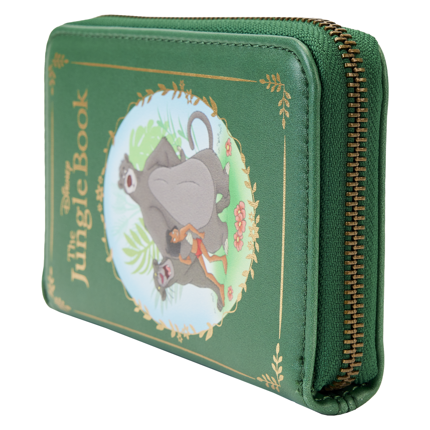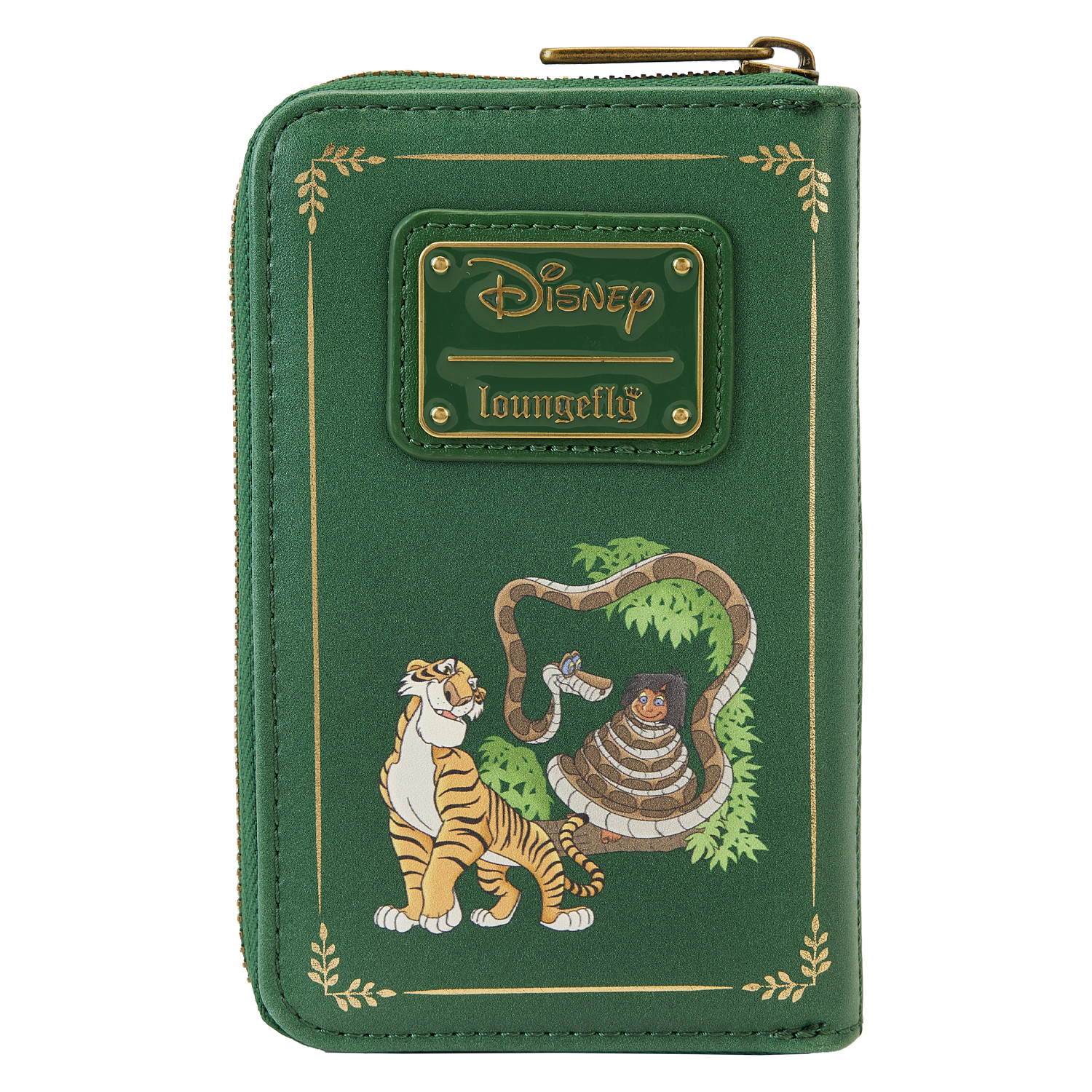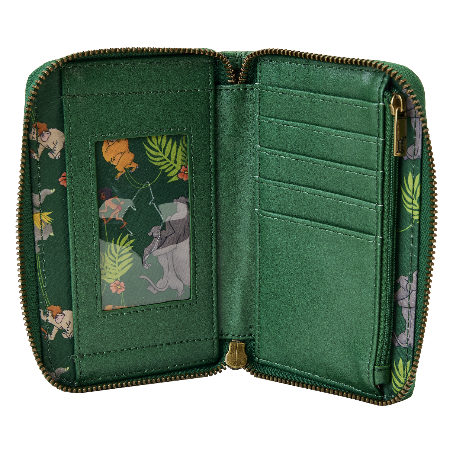 The Loungefly Disney The Jungle Book Zip Around Wallet is made of vegan leather (polyurethane). Wallet zips closed, has sturdy brass hardware, and features debossed, gold-foil, and printed details. Take note of the coordinating pattern of the inside lining fabric.
