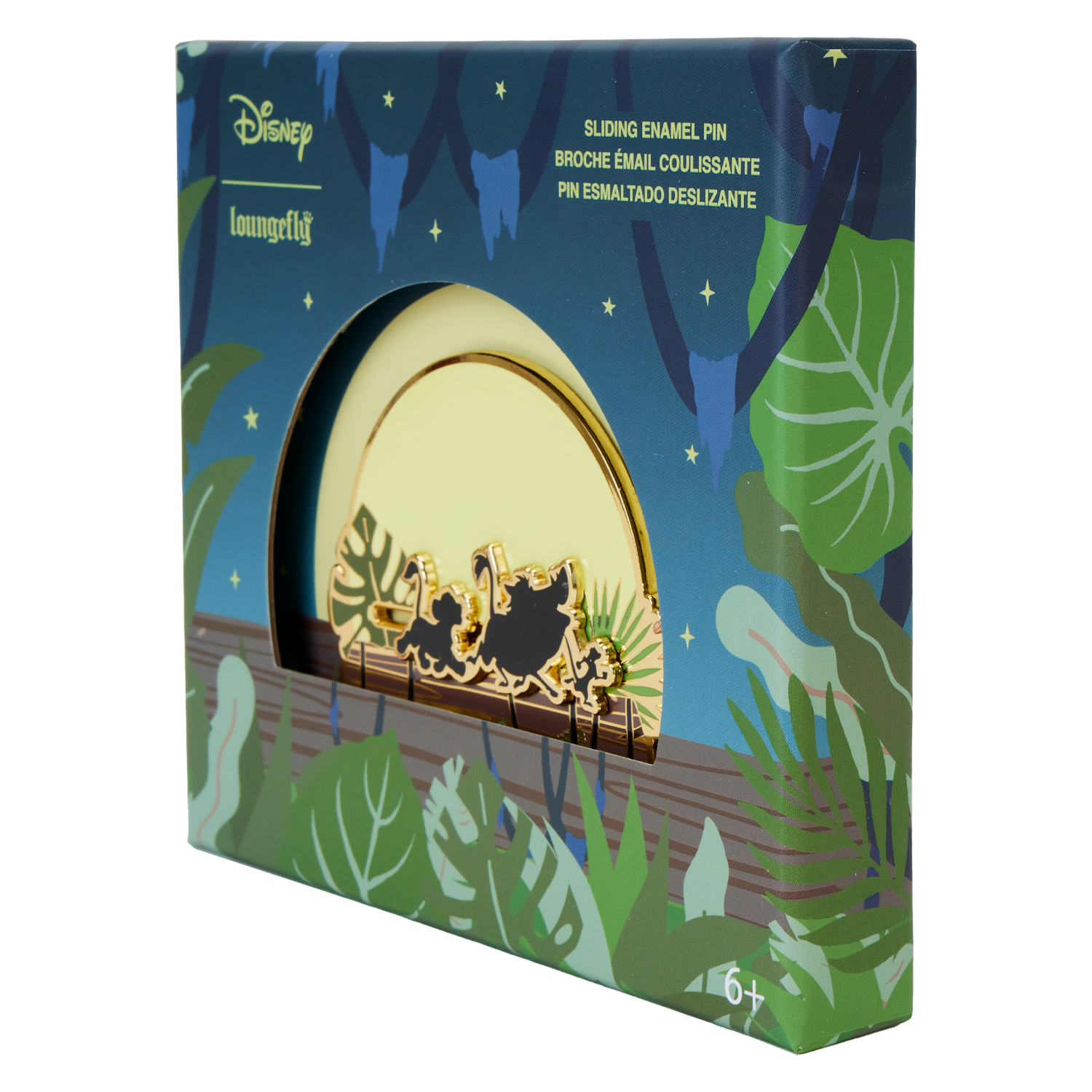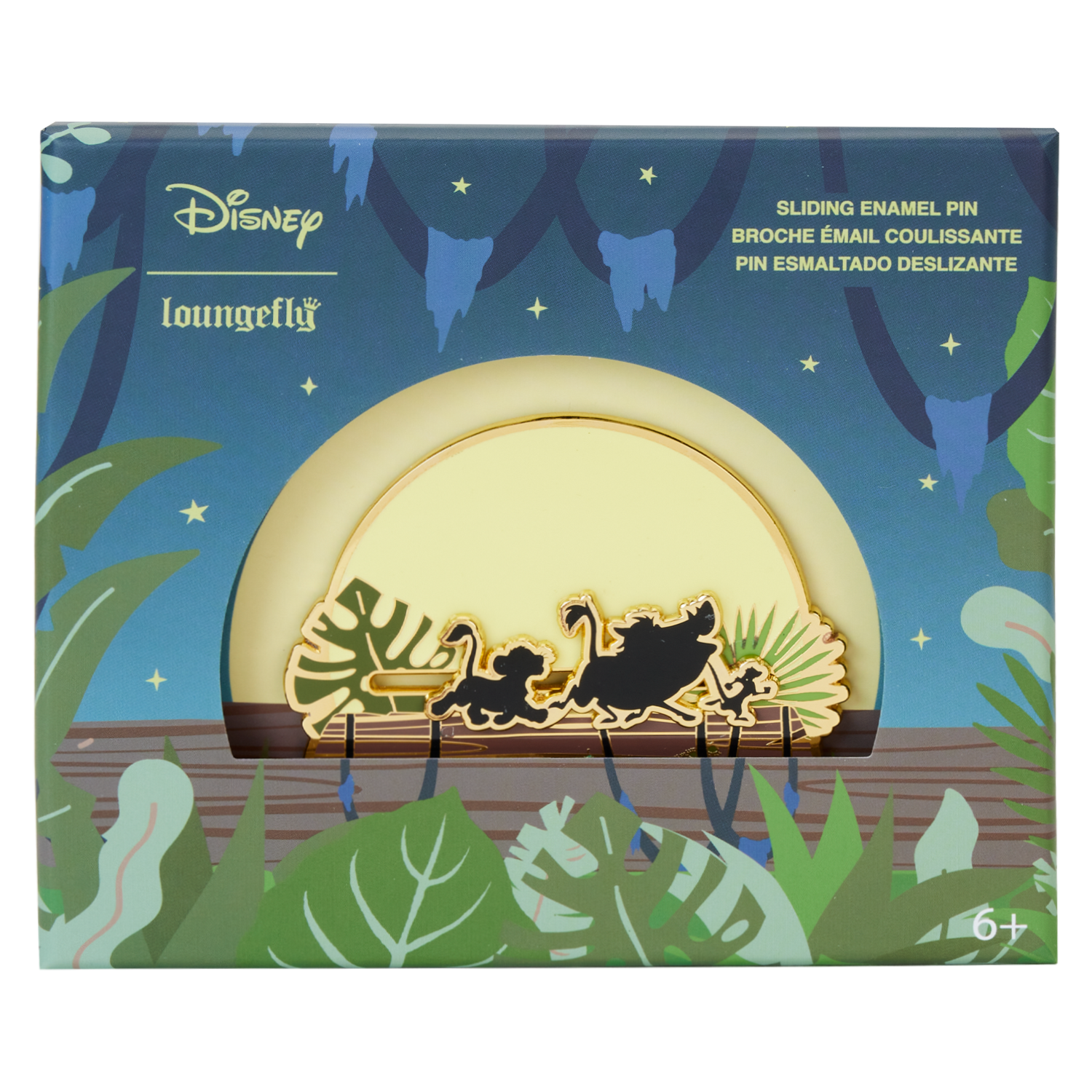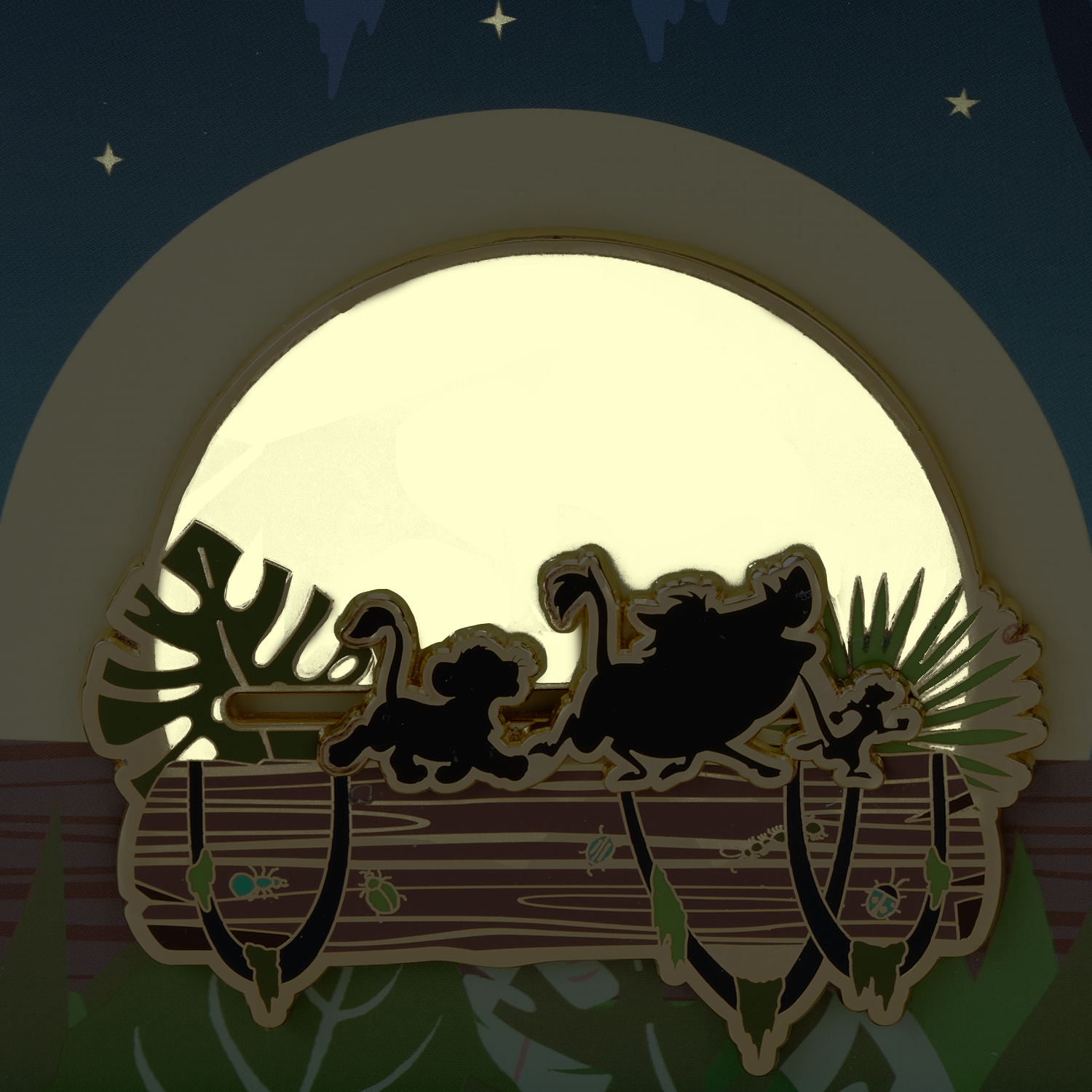 Kick back and let your worry-free lifestyle run wild! The Loungefly Lion King 30th Anniversary Hakuna Matata 3” Collector Box Pin brings a chill new look to your everyday vibe. On this enamel pin, a full moon rises as Timon, Pumbaa, and Simba walk across the log. Turn down the lights to see the moon glow in the dark, and slide the trio across the log to set the scene in motion! This pin makes a carefree addition to any outfit or bag and will keep you looking cool and relaxed for the rest of your days.