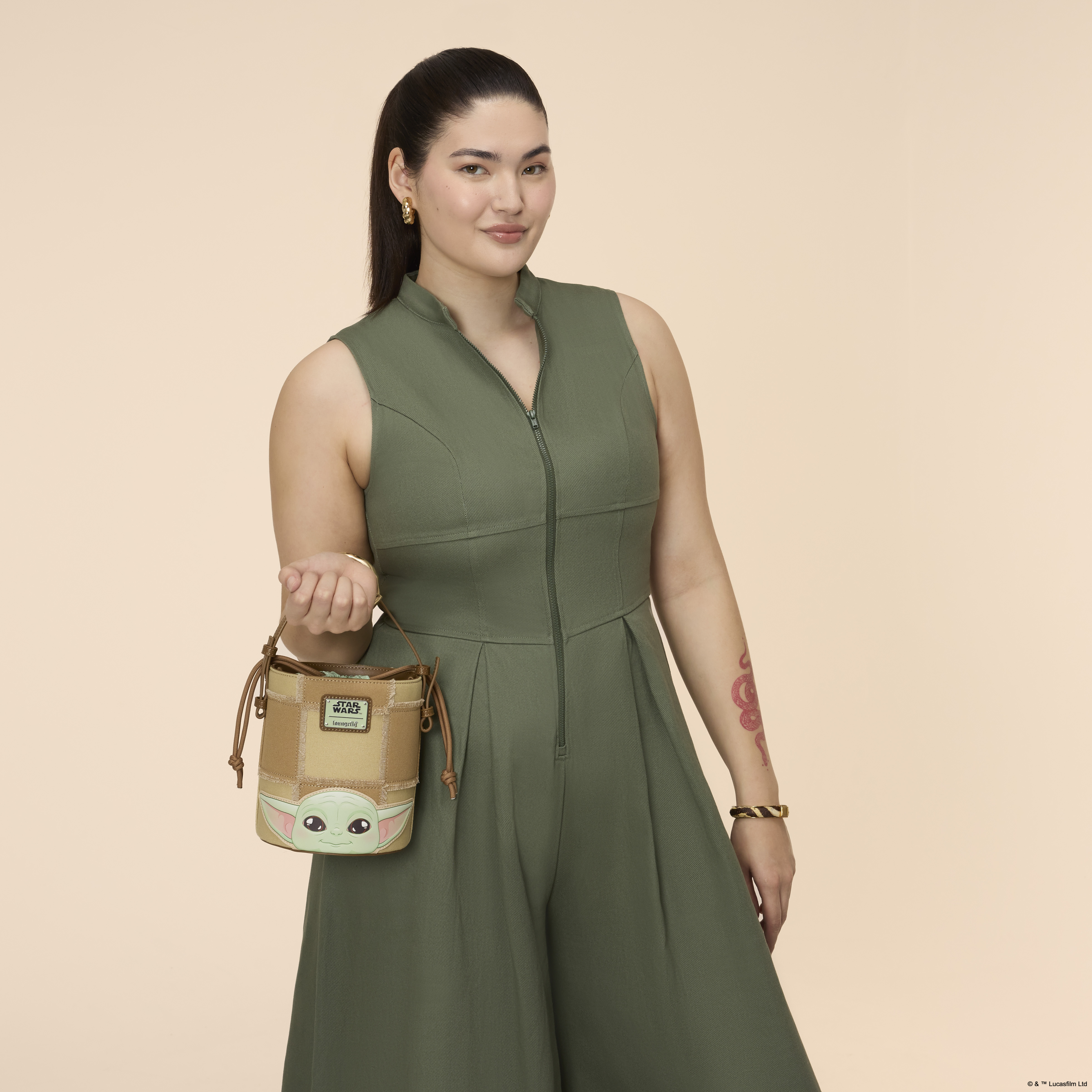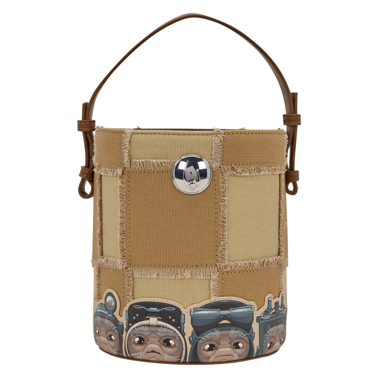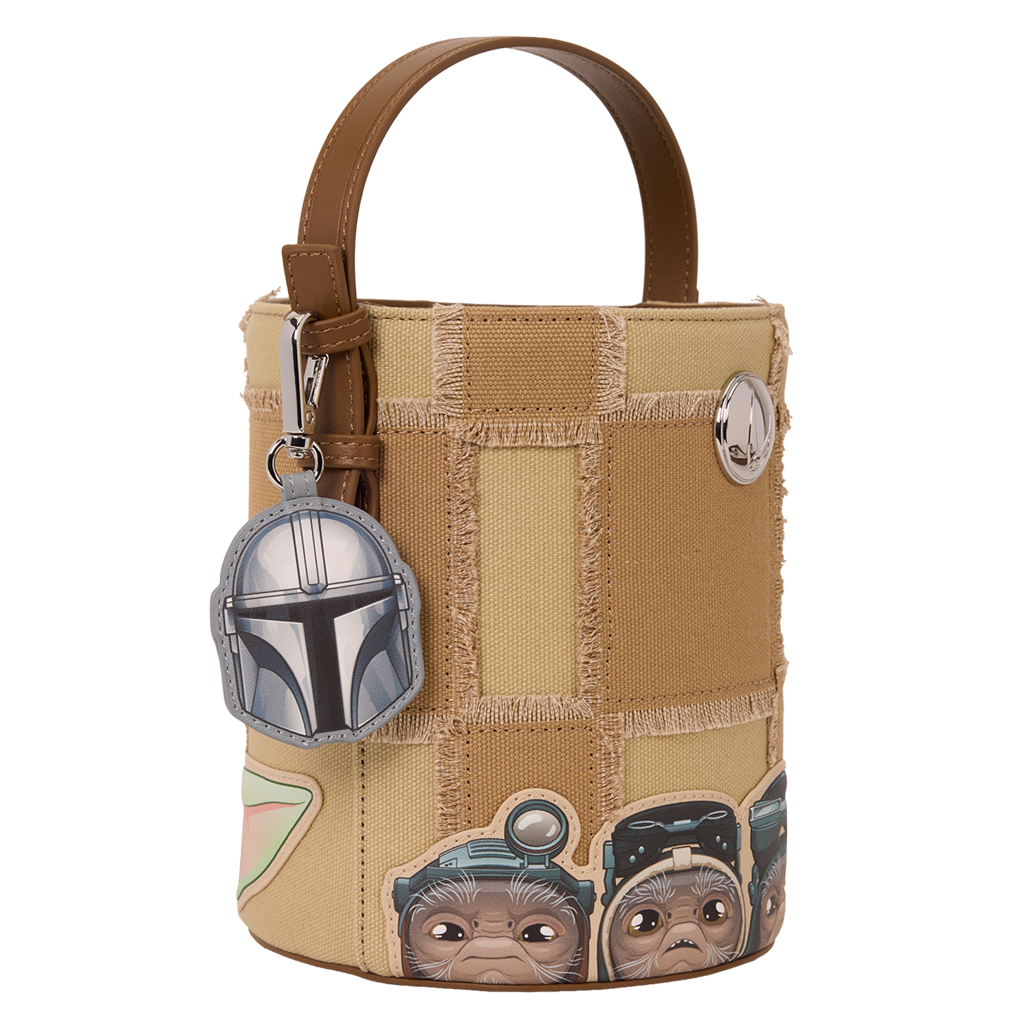 This bucket crossbody bag features a beige checkered pattern. On one side, you'll find Grogu at the bottom, smiling out from the bag. On the other side, you'll find several Anzellans standing together. This is a really fun statement piece to show off your love for the STAR WARS™ universe!