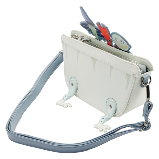 Oogie Boogie has sent his finest trick-or-treaters to carry out his dastardly plans. Stay on his good side, or he may send his mischievous henchmen after you! The Loungefly Nightmare Before Christmas Lock, Shock, and Barrel Bathtub Crossbody Bag features Oogie’s trio of underlings as they take a ride in a mechanical bathtub. Wearing costume masks that glow in the dark, Shock, Lock, and Barrel move up and down as the tub carries them away. An enamel bear trap zipper charm dangles over the side, providing easy access to all your tricks. The feet of the tub move back and forth to really set trouble in motion! This creepy crawly accessory adds some frightful fun to any outfit and will keep your belongings safe on any journey.