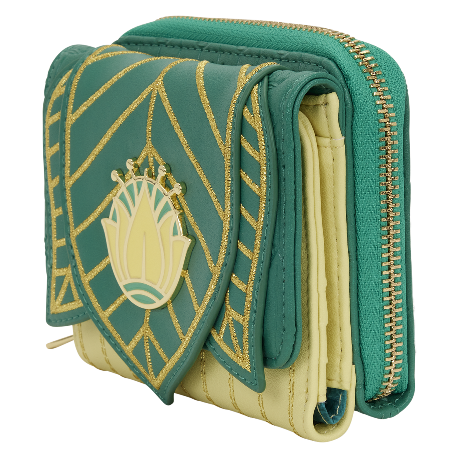 The design on the wallet looks like Tiana's green dress. You’ll find metallic gold embroidery, debossing, and an enamel fill rivet in the shape of her crown. Inside, there are four card slots and one clear ID slot. Take a close look at the inside flap and you'll find Princess Tiana's signature!
