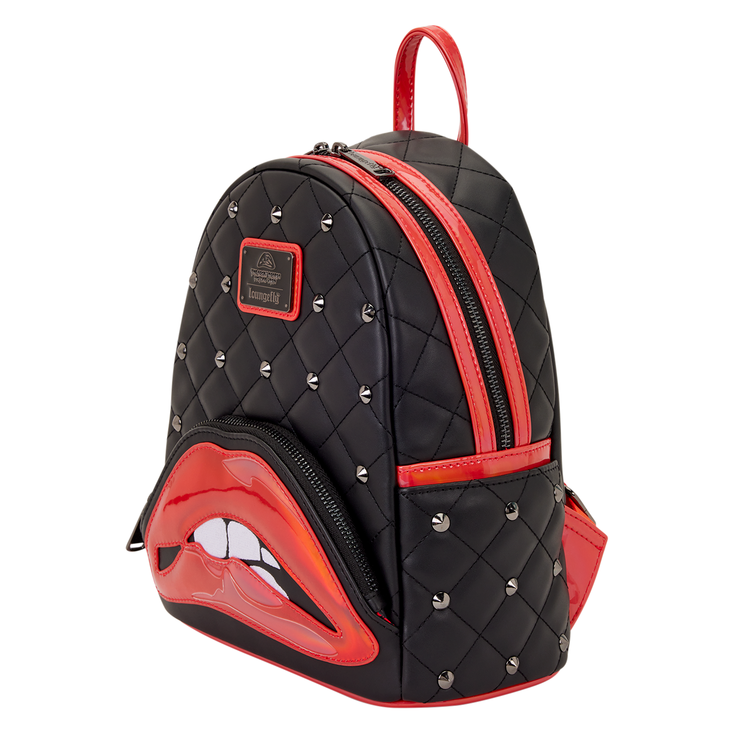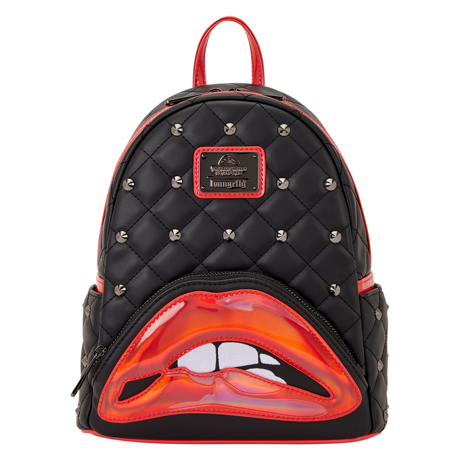 This mini backpack is an absolute staple for spooky season! After all, it's Rocky Horror Picture Show season! This bag features black quilted material with stud cones. The front pocket is a puffed applique in the shape of the iconic lips from the beginning sequence.