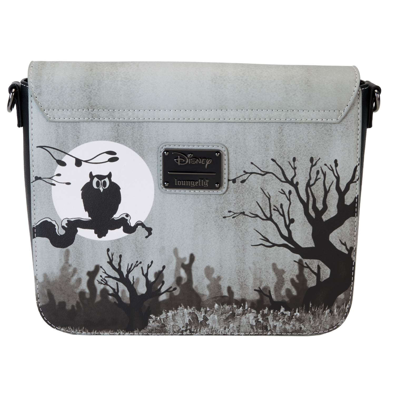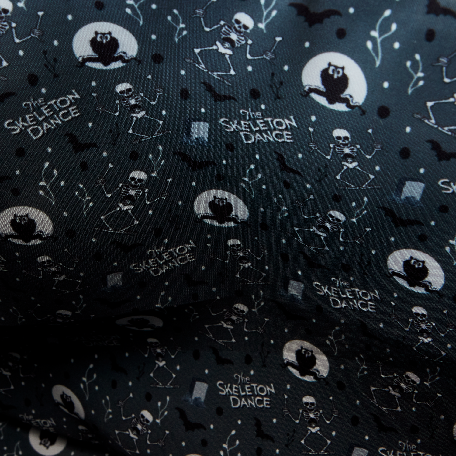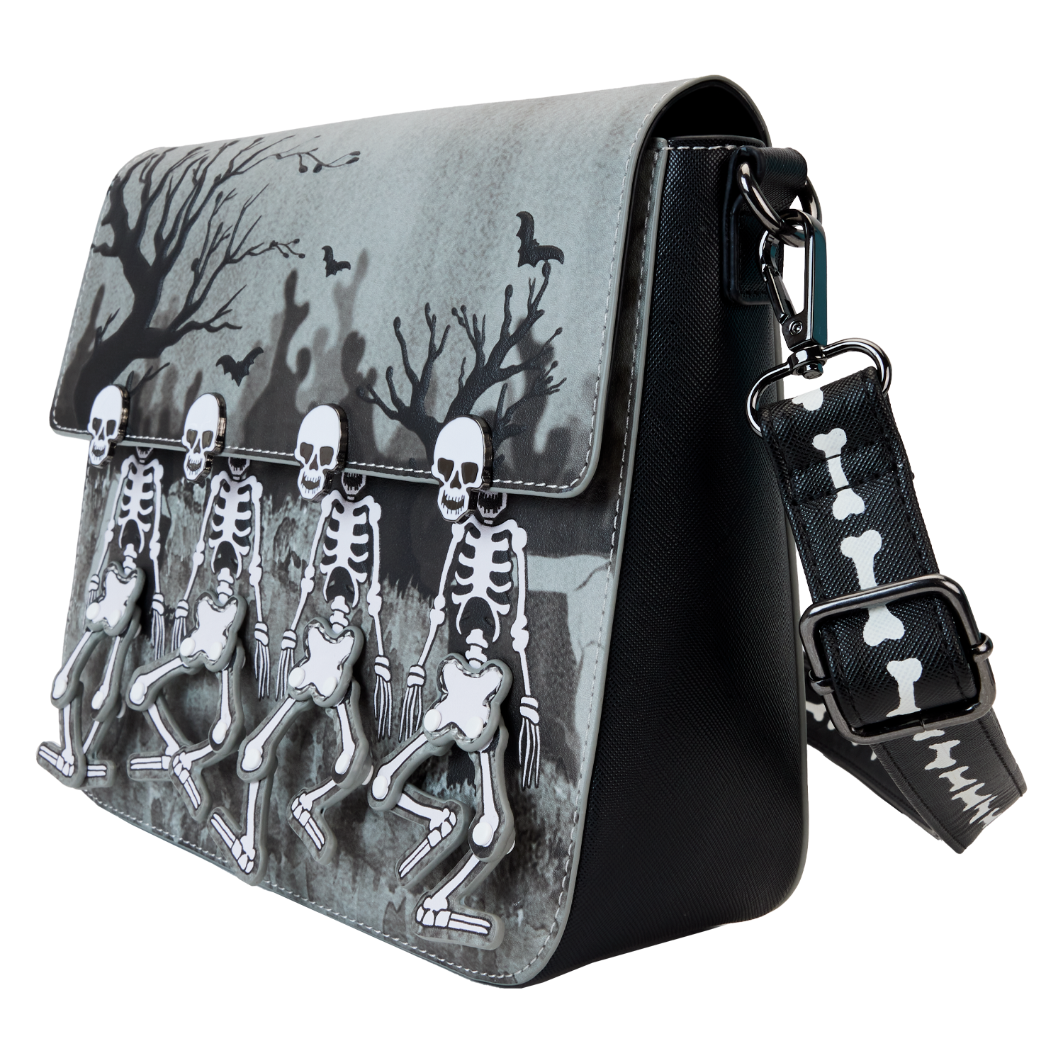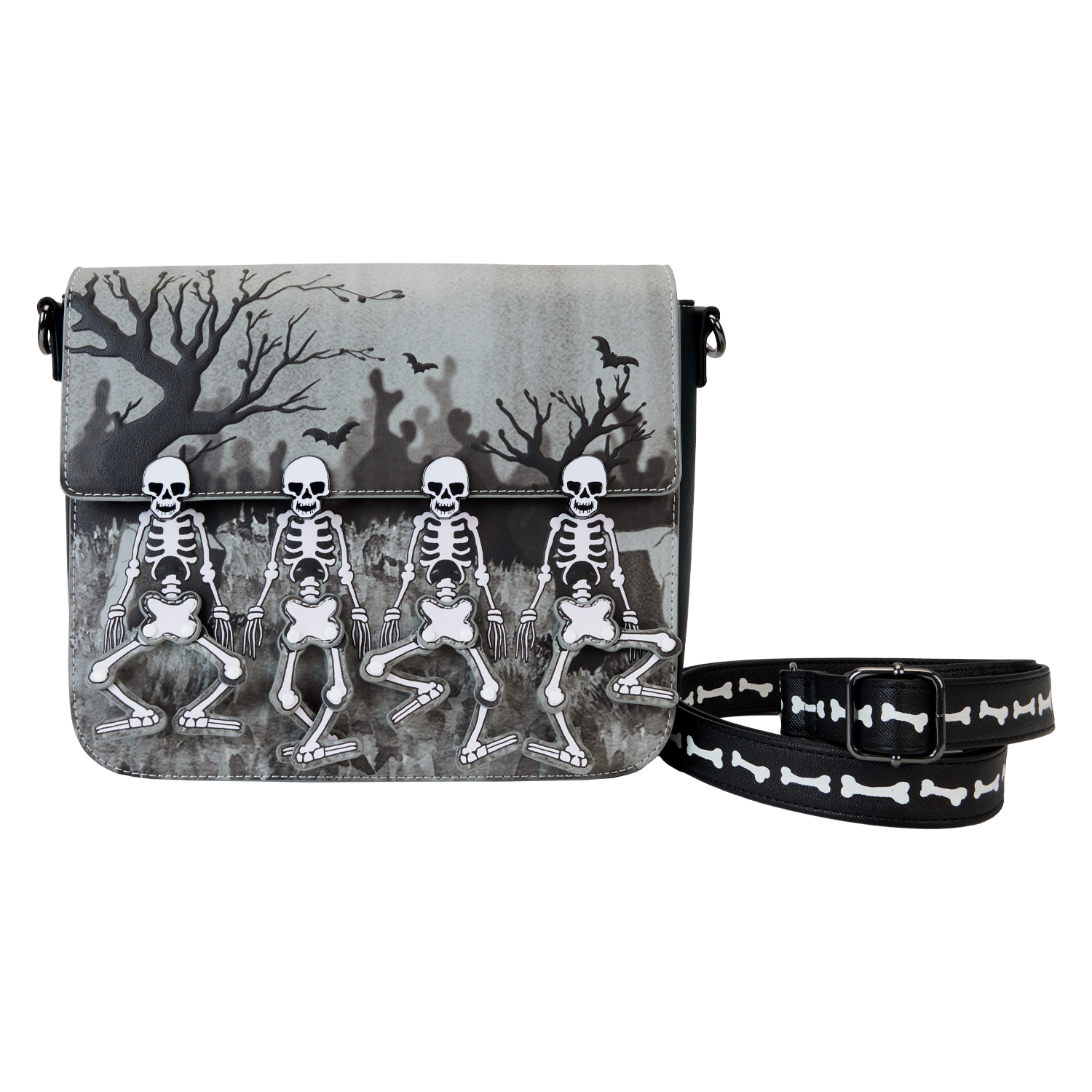 Wander into the graveyard after dark and you may find yourself in the middle of a macabre musical melody! A group of skeletons create a chorus line on the front of this crossbody bag, where riveted joints allow their dance to come to life. Lift the top flap to reveal the title of this classic short film, and turn down the lights to see the design’s glow-in-the-dark details! This accessory makes a bone-chilling addition to any outfit and is the perfect collection piece for fans of vintage Disney media.