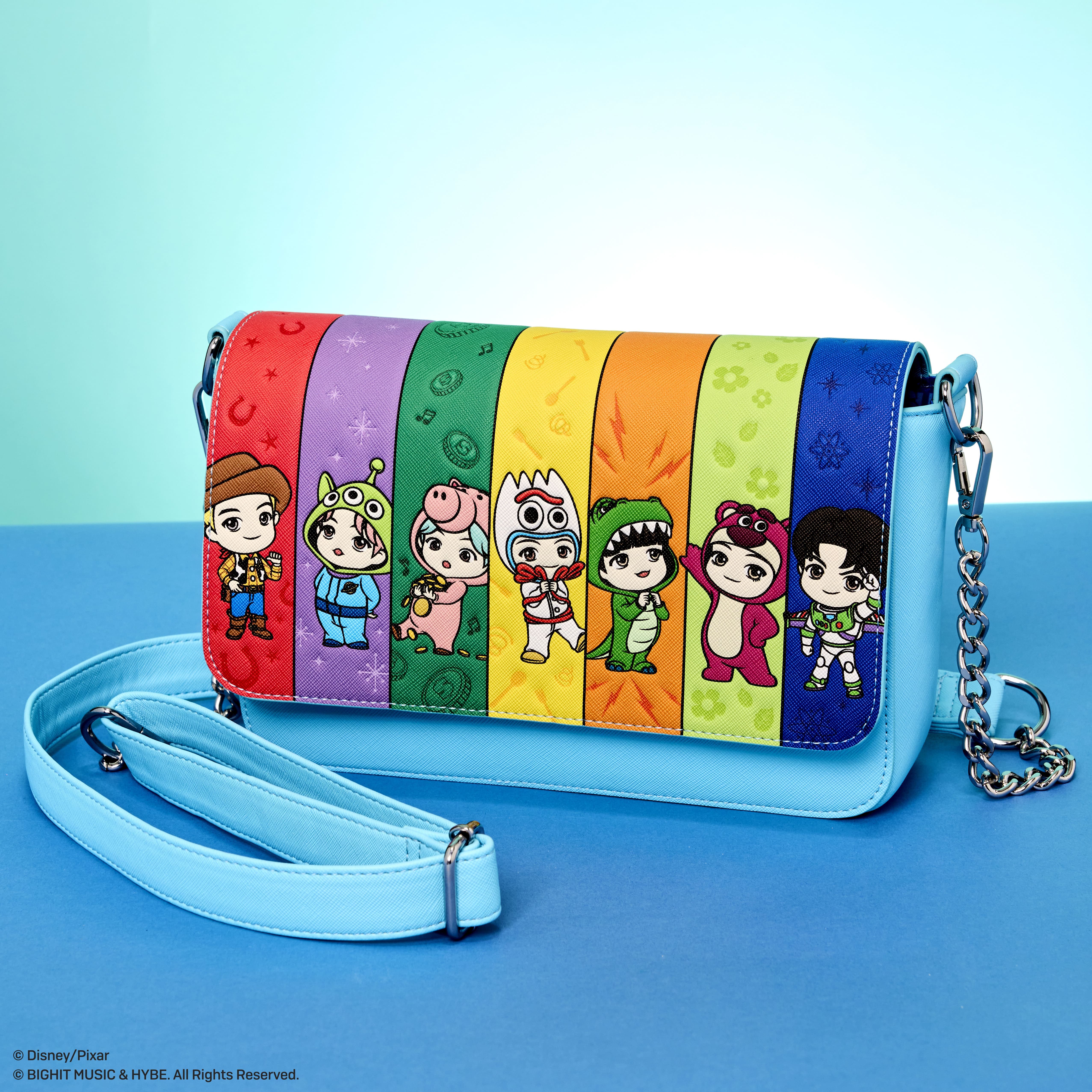 Ready to play up your look, BTS fans? This TinyTAN BTS crossbody bag features the band members dressed as characters from Disney Pixar’s Toy Story. On the front flap, you’ll find printed images of the following band members: RM dressed as Disney Pixar’s Woody, Jin as the Alien, Suga as Hamm, j-hope dressed as Forky, Jimin as Rex, V dressed as Lotso, and Jung Kook as Buzz Lightyear. Color-blocking panels behind each band member--and debossed images of accessories associated with each Disney Pixar character--add extra-fun details. Pack just what you need and secure your daily essentials in style