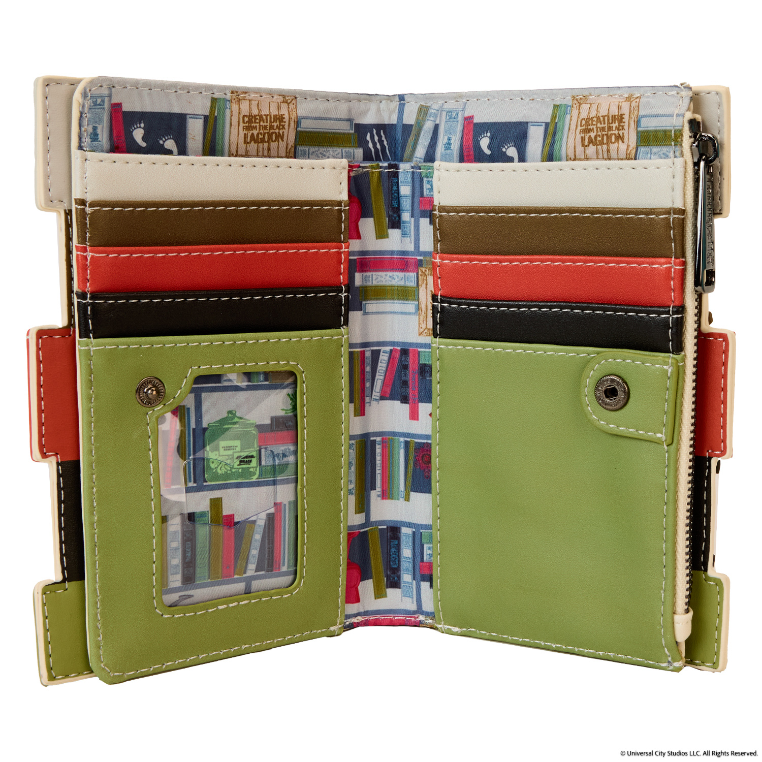 Haunt the library, bookstore, or next horror author signing in style! Bring along our exclusive Universal Monsters Book Collection Wallet. This accessory features a gorgeous collection of “tomes” lined up as if on an invisible shelf. The “spines” include silver foil details and lettering for classic books like The Mummy, The Wolfman, Dracula, Frankenstein, and Creature from the Black Lagoon. And in the dark, the lettering glows! On the other side, the “pages” appear. Secure important cards, your ID, and other small valuables for the day within the “pages” of this collection. Wherever you carry this fashionable accessory, memorable classics will never ghost you.