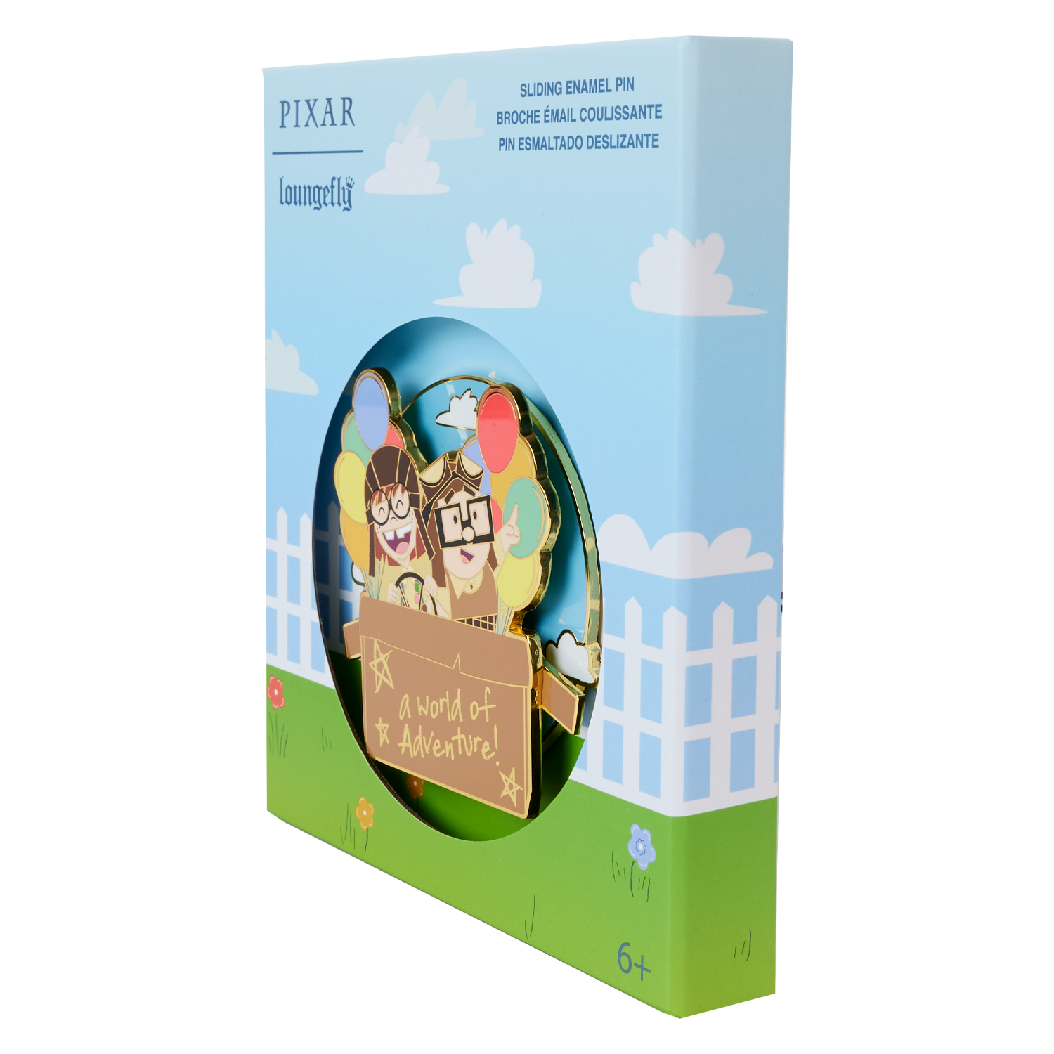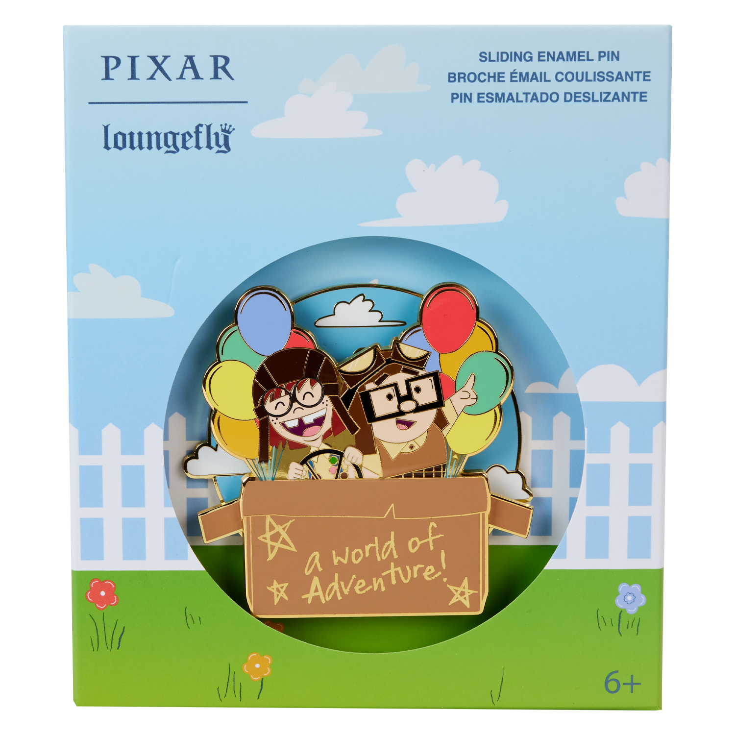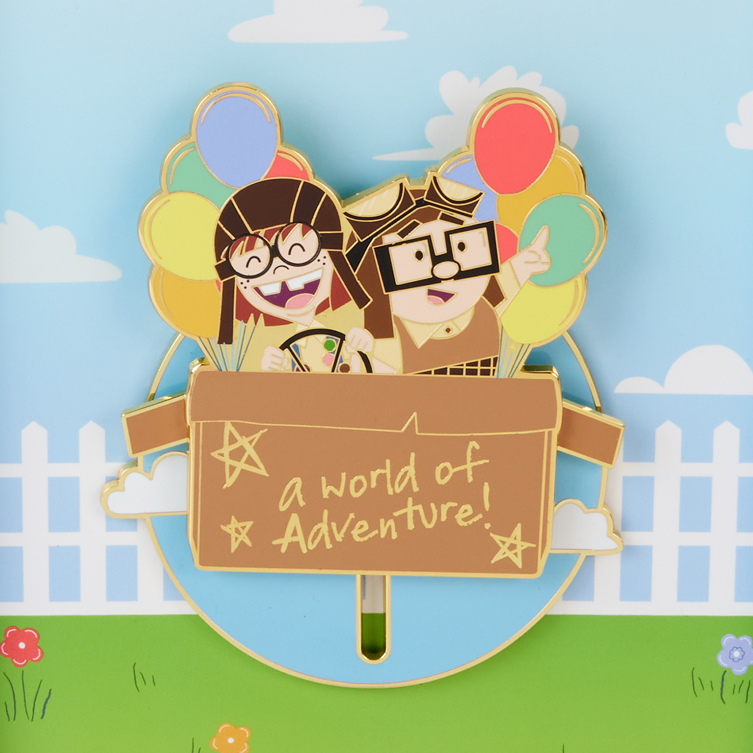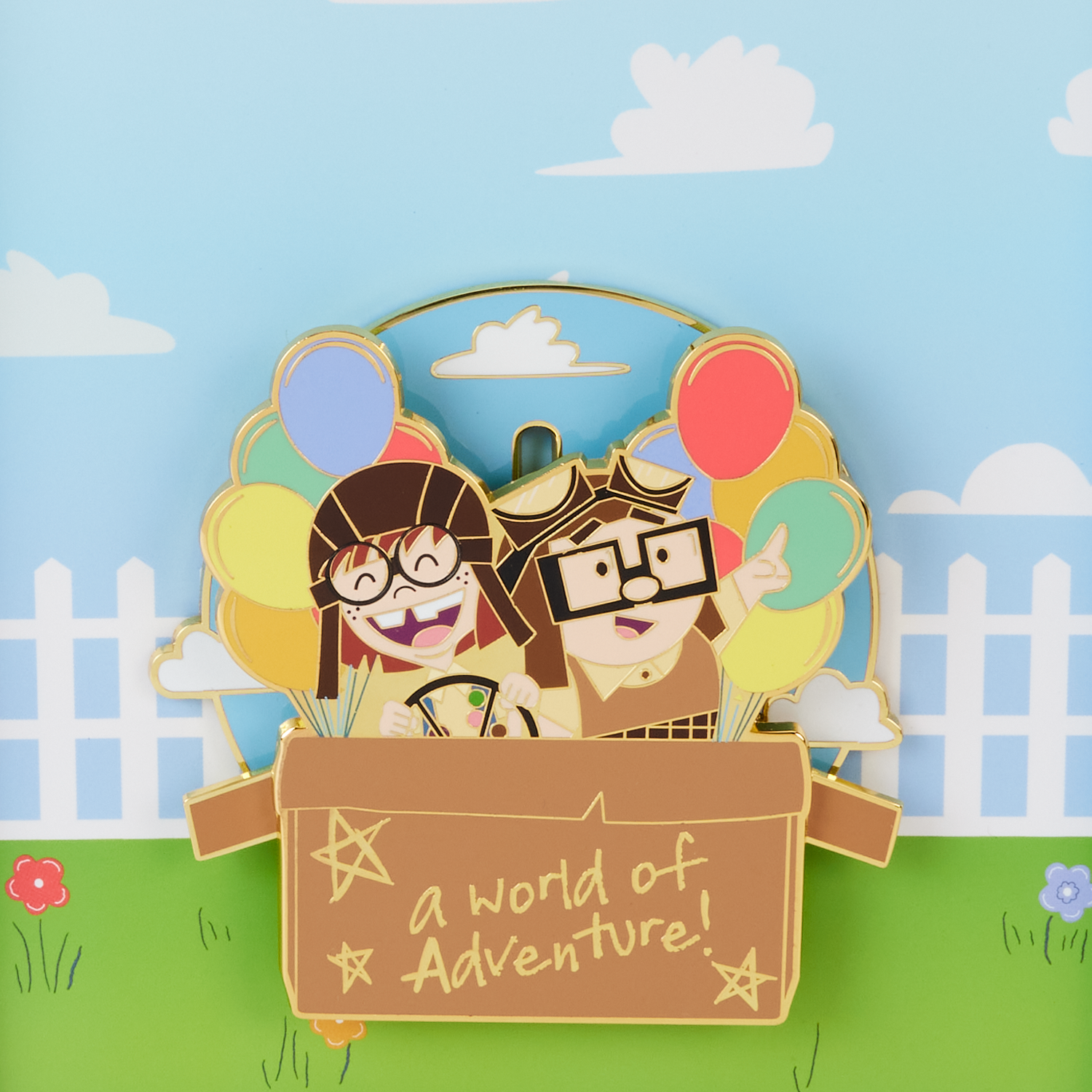 Up, up, and away! Let your imagination take flight with the Loungefly Disney-Pixar Up 15th Anniversary Spirit of Adventure Moving 3” Collector Box Pin. This enamel pin shows a young Ellie and Carl as they pilot a homemade aircraft. Hand-drawn doodles are scribbled on their cardboard box along with the phrase, “a world of adventure!” Colorful balloons trail behind them, lifting them high into a cloudy sky. Move the box up and down to set the scene in motion! This pin makes a heartwarming addition to any outfit or bag and is perfect for fans looking to keep their favorite characters close.