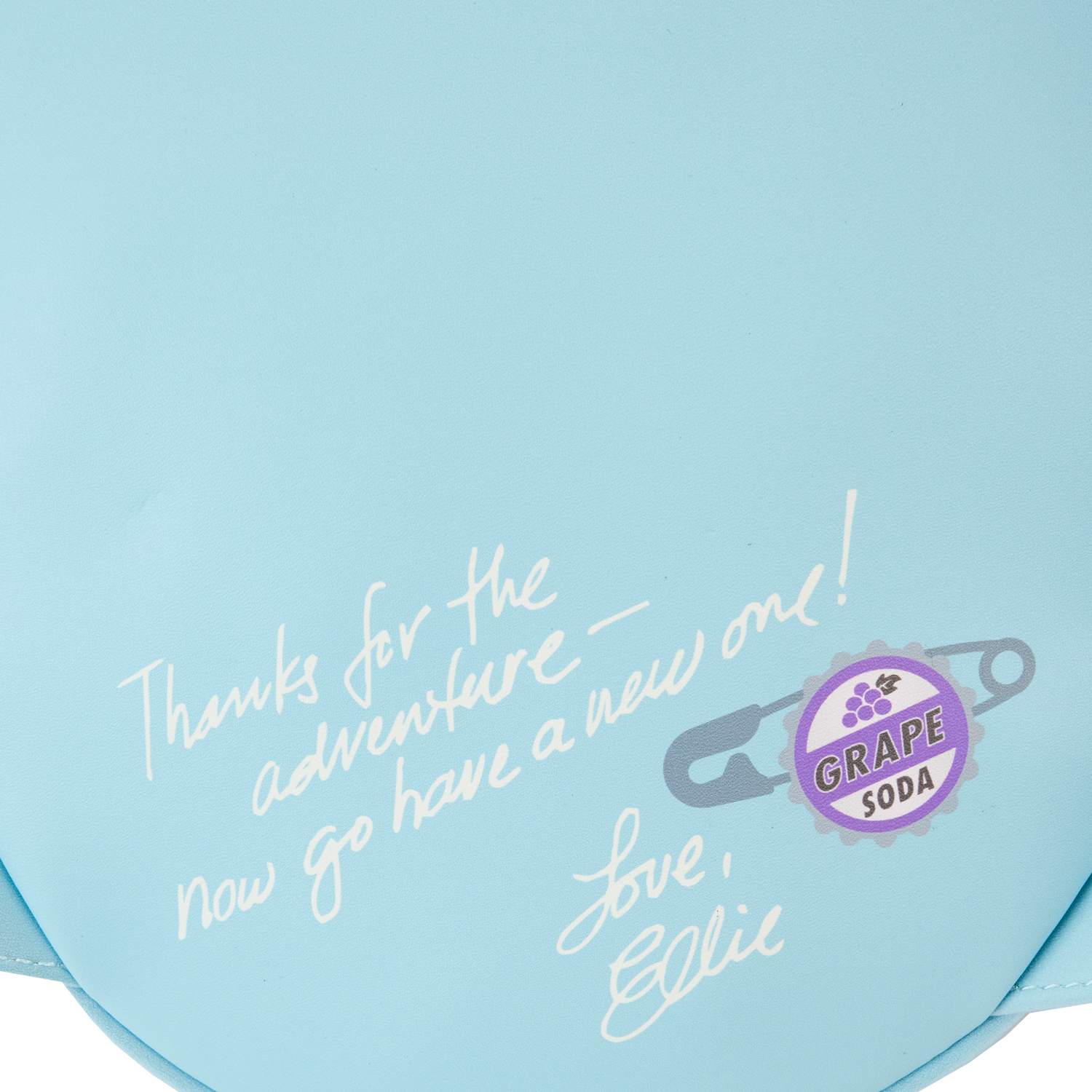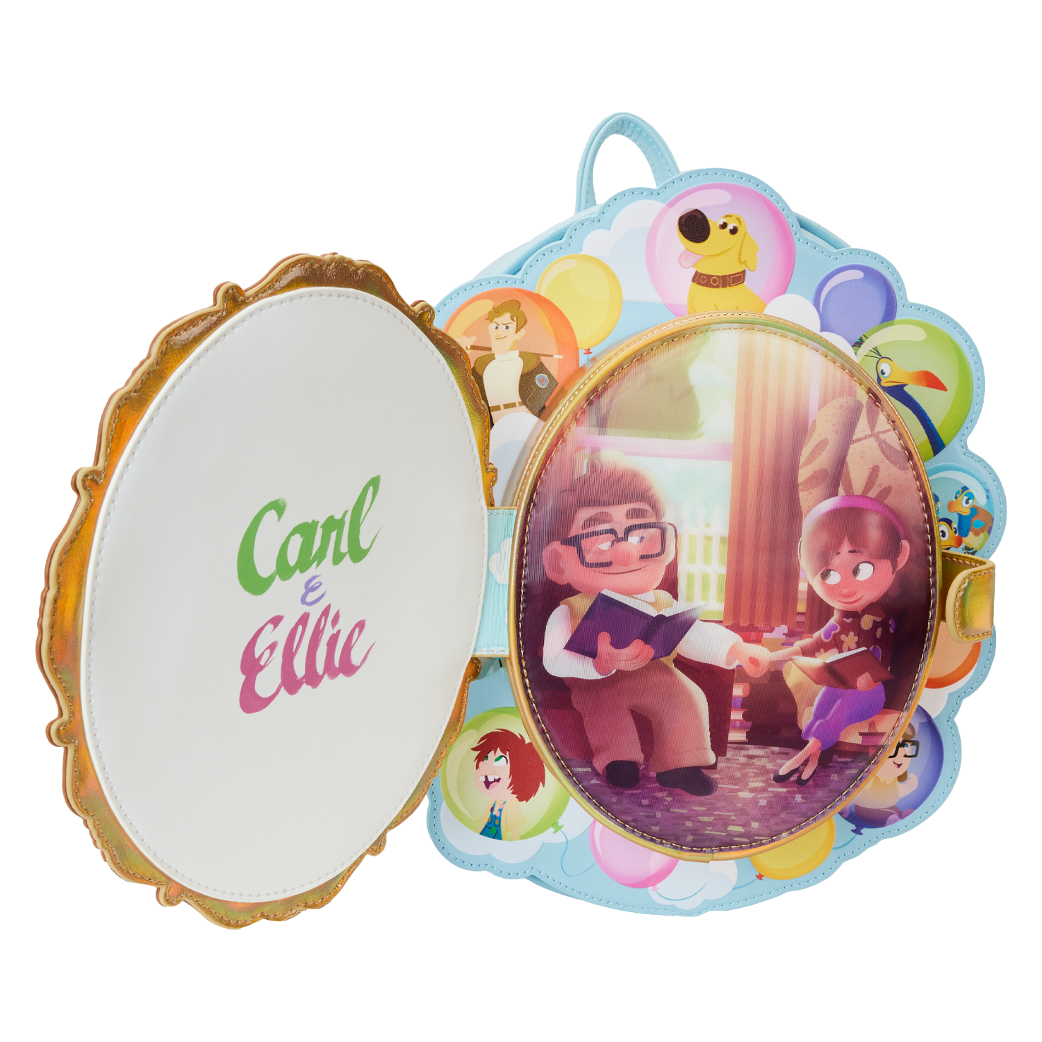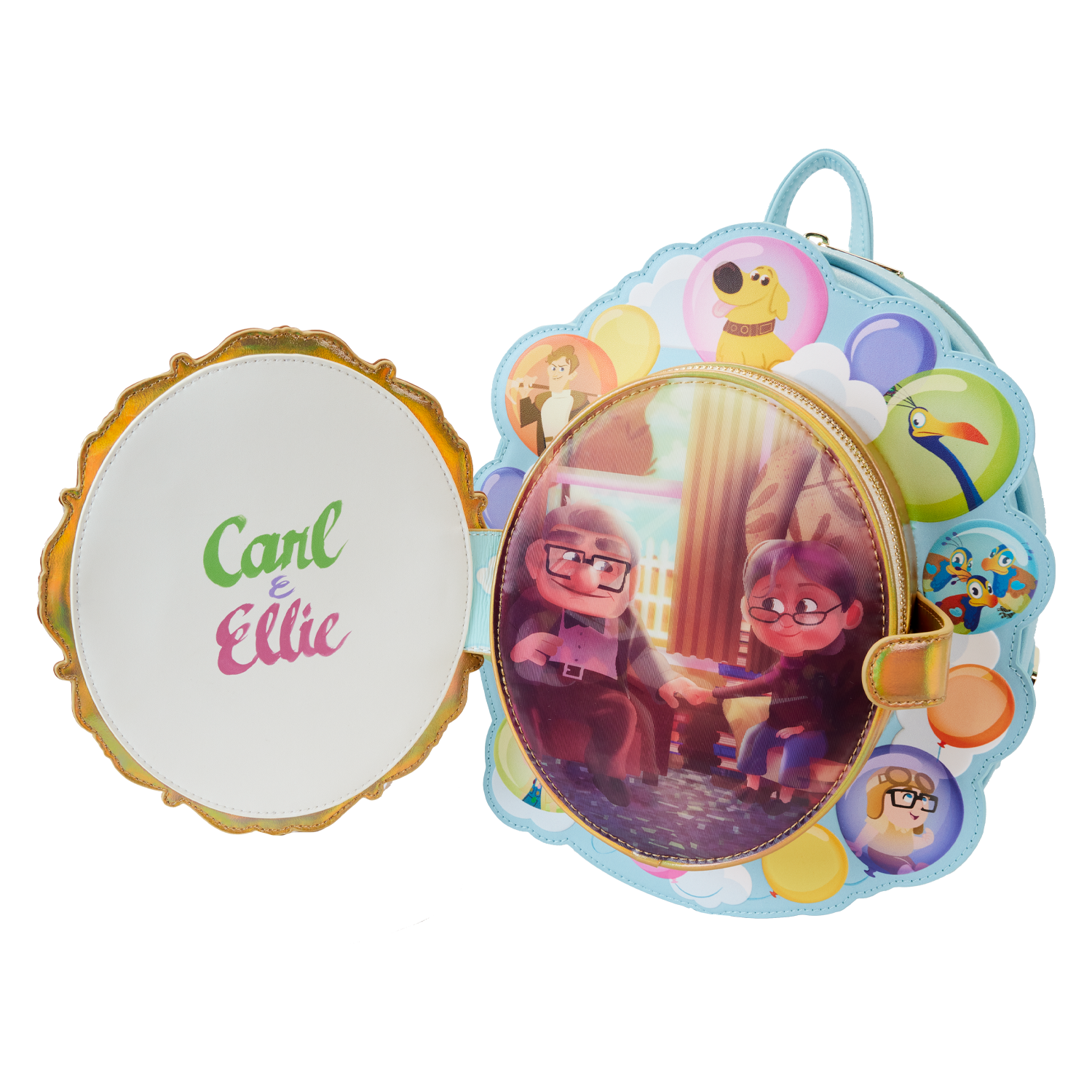 Life is one big adventure! Celebrate the story of a beloved animated classic with the Exclusive Loungefly Disney-Pixar Up 15th Anniversary Carl and Ellie Cameo Mini Backpack. On the front zipper pocket, a gilded frame shows a picture of Carl and Ellie’s house at Paradise Falls. Open the frame to reveal photos of Carl and Ellie, which use lenticular details to highlight the passage of time. Clouds and balloons form a border around the zipper pocket, displaying portraits of Russel, Charles Muntz, Dug, Kevin with her babies, and a young Ellie and Carl. A grape soda pin appears near Ellie’s note on the back of the bag. This mini backpack makes a heartwarming addition to any outfit and is perfect for fans looking to keep their favorite characters close.
