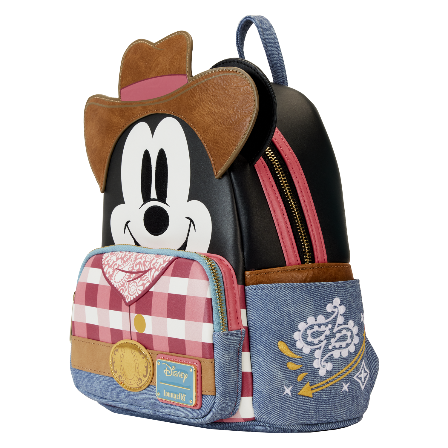 The Loungefly Western Mickey Mouse Cosplay Mini Backpack is made of vegan leather (polyurethane). Bag has adjustable shoulder straps and shiny gold hardware. Additional features include applique, embroidered, denim, molded metal, and printed details. Take note of the coordinating inside lining.