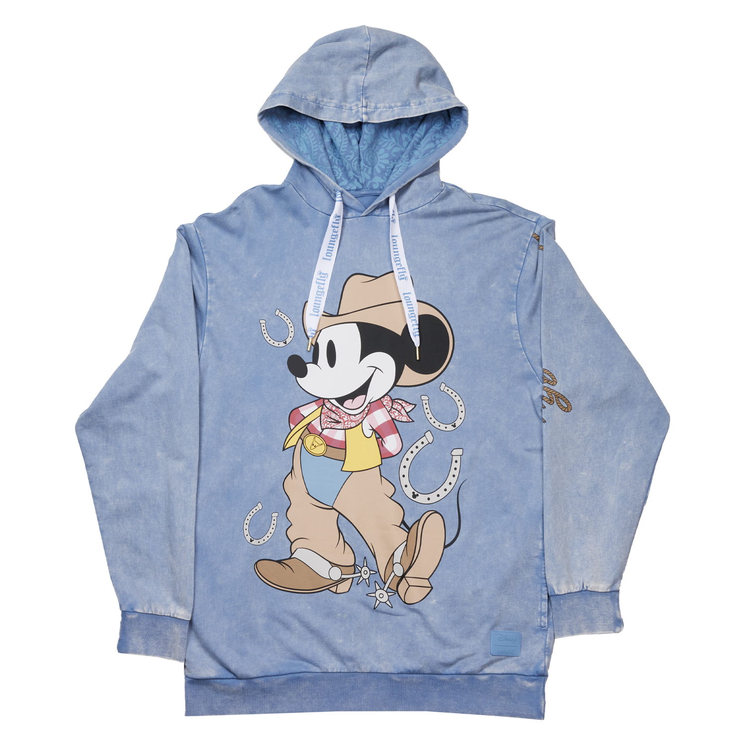 The Loungefly Western Mickey Unisex Hoodie is made of French Terry cotton (60% cotton, 40% polyester). Extra-large lanyard-style drawcords add versatility in wear and fit and are perfect for displaying your favorite pins. Cuffs and waistband are 95% cotton and 5% Spandex.