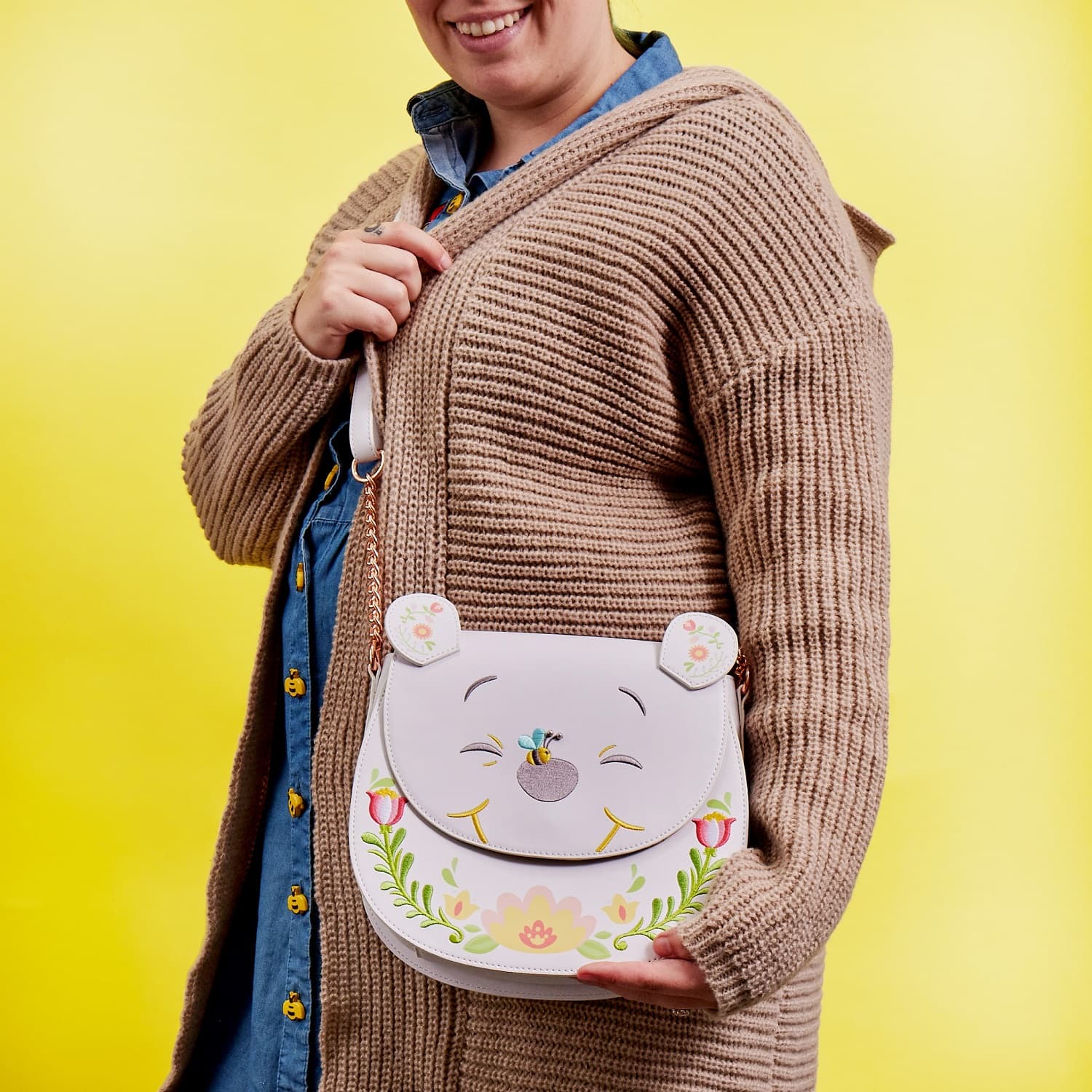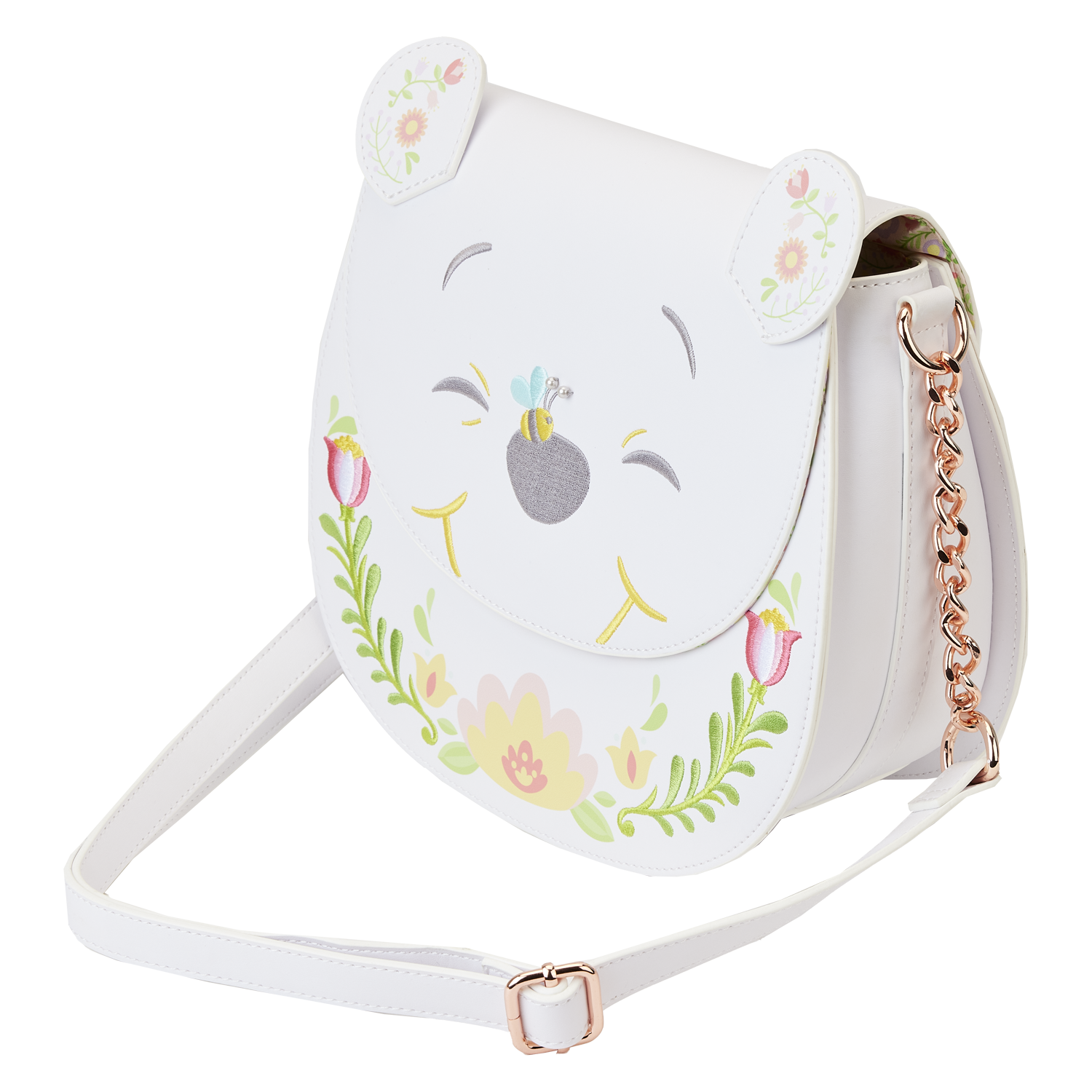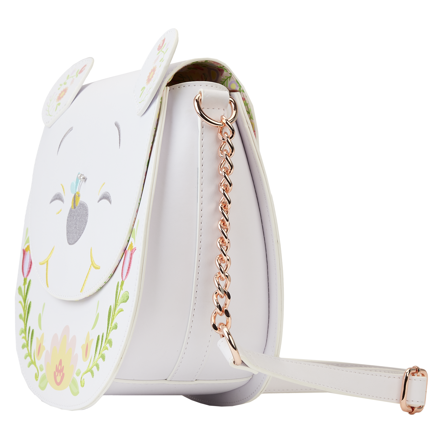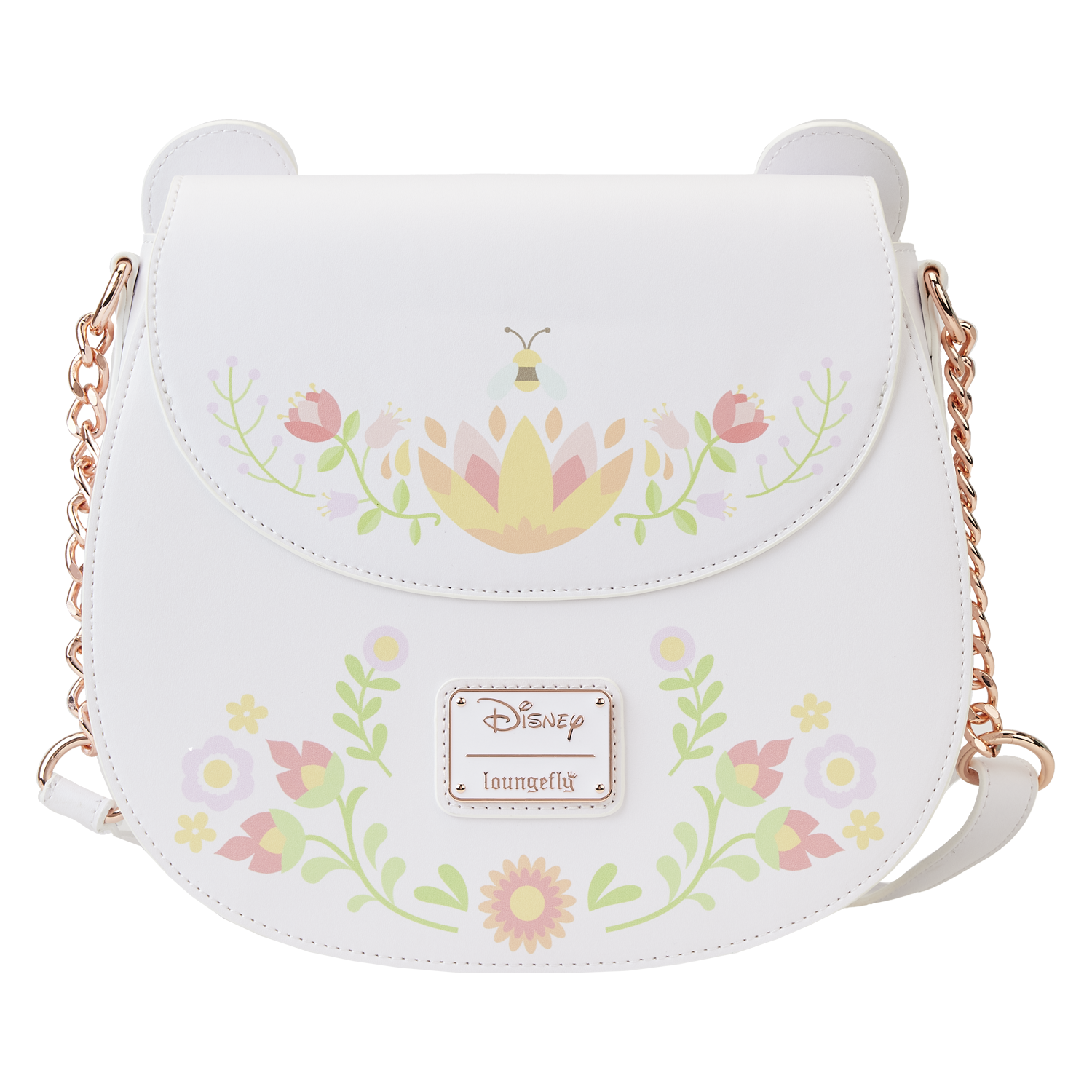 The Loungefly Disney Winnie the Pooh Cosplay Folk Floral Crossbody Bag is made of vegan leather (polyurethane). Bag has adjustable (detachable) shoulder strap and rose gold-colored metal chain and hardware. Additional features include applique, embroidered, beaded, and printed details. Take note of the coordinating inside lining.