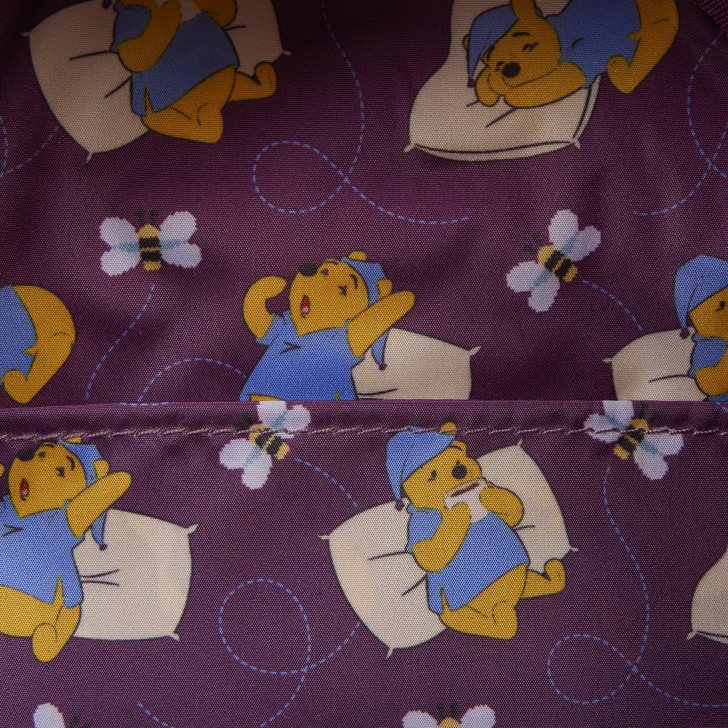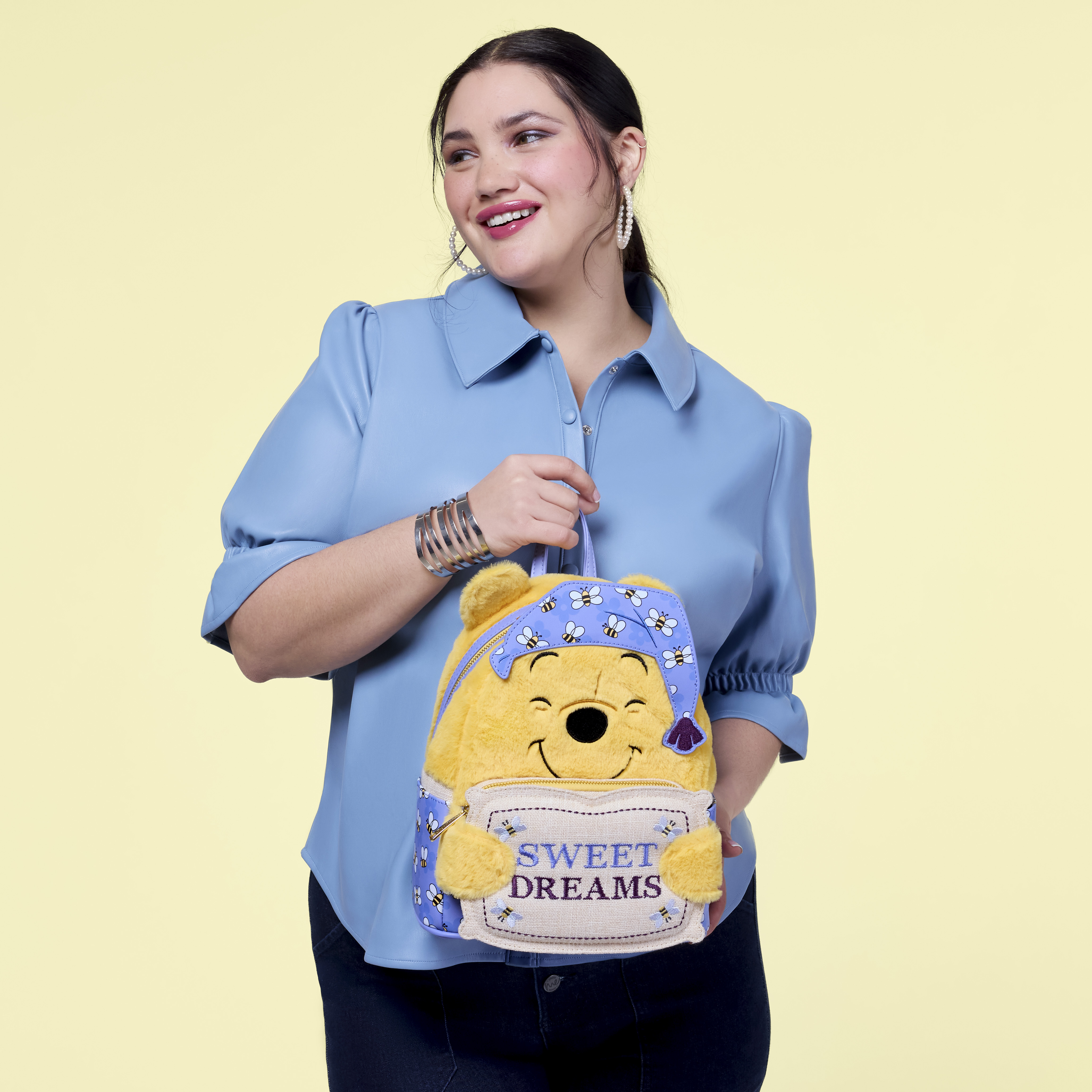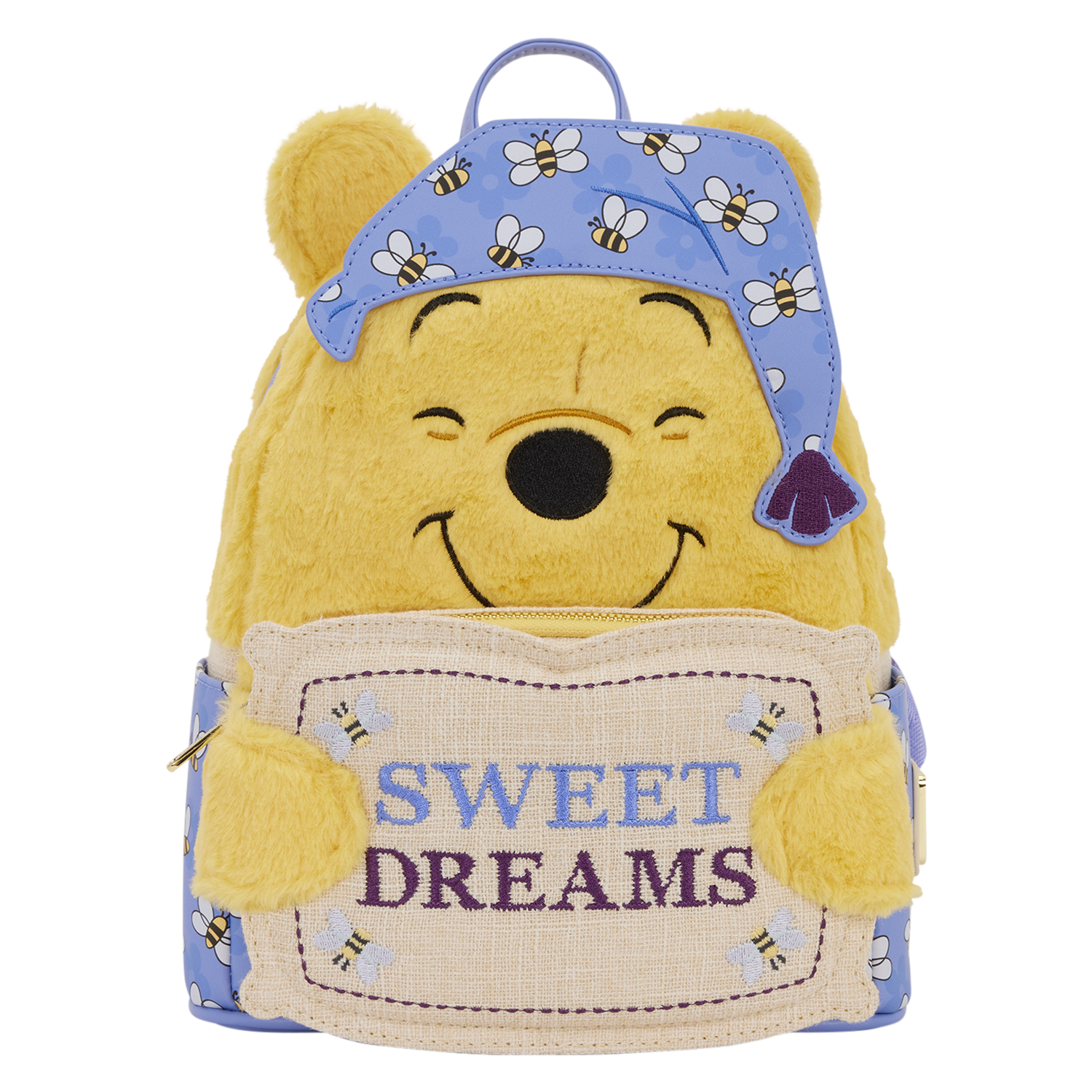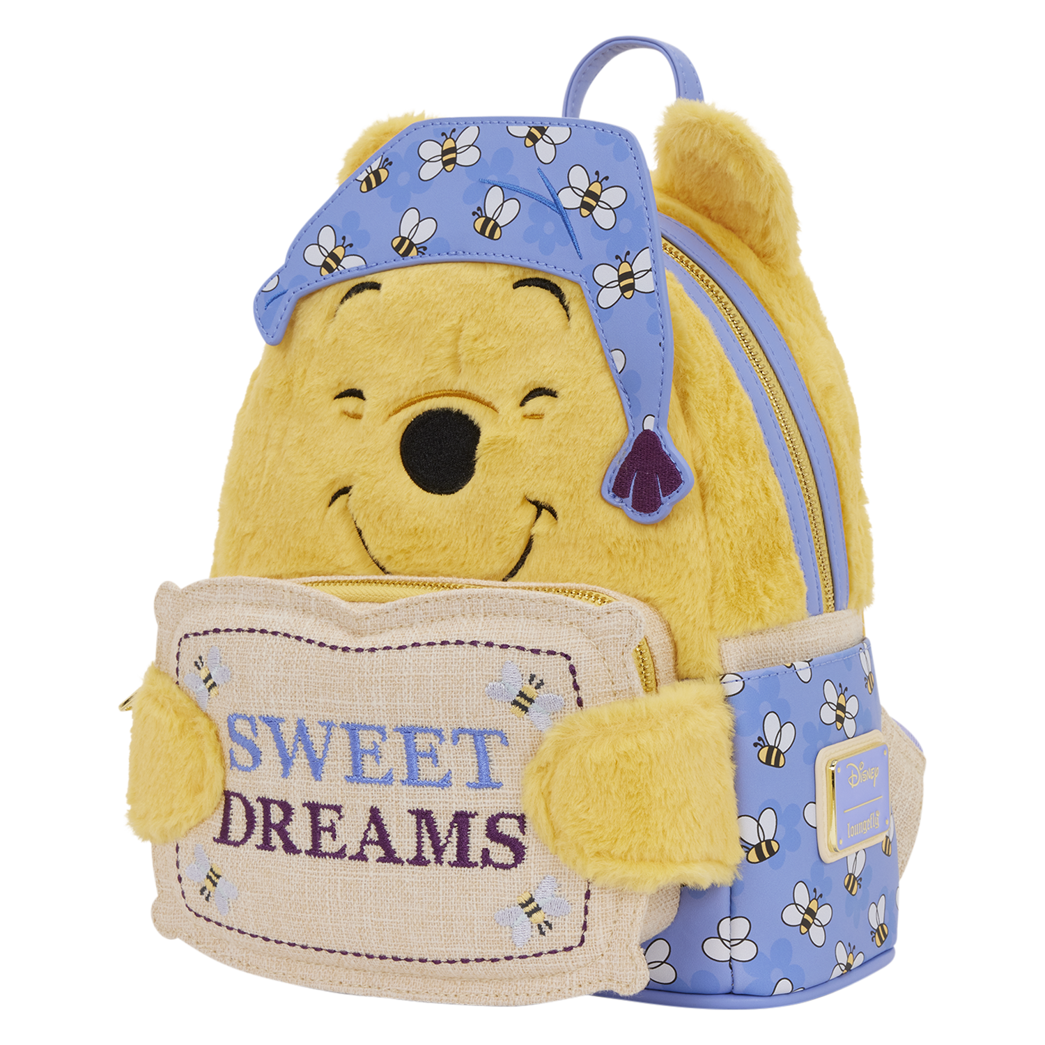 This adorable mini backpack is inspired by Winnie the Pooh. He's plush and has embroidered facial details. He's dressed in comfy pajamas with bees all over them. Pooh hugs a pillow that says, "Sweet Dreams" and doubles as the front pocket. You'll find the same pattern of his pajamas on the straps, too! This is an adorable exclusive to show off one of your favorite Disney characters.
