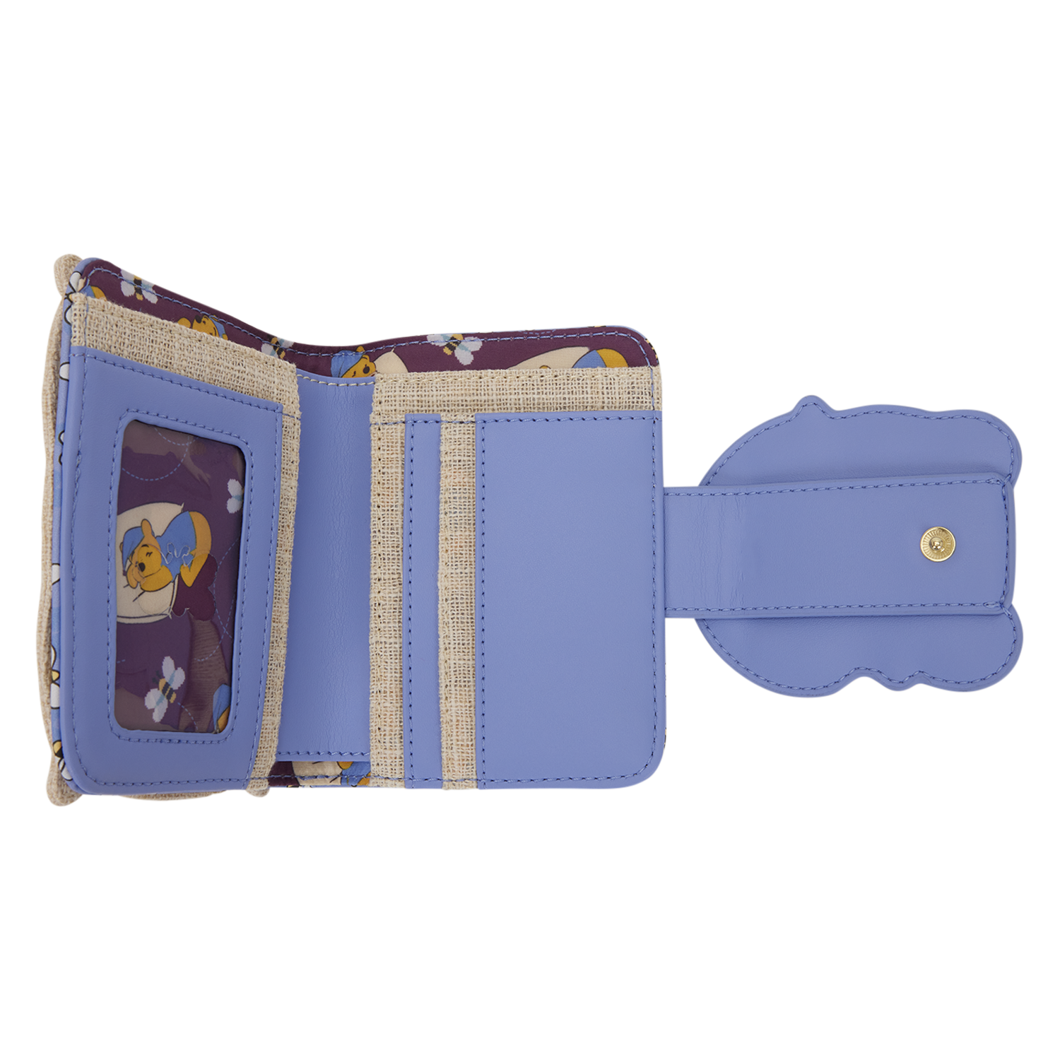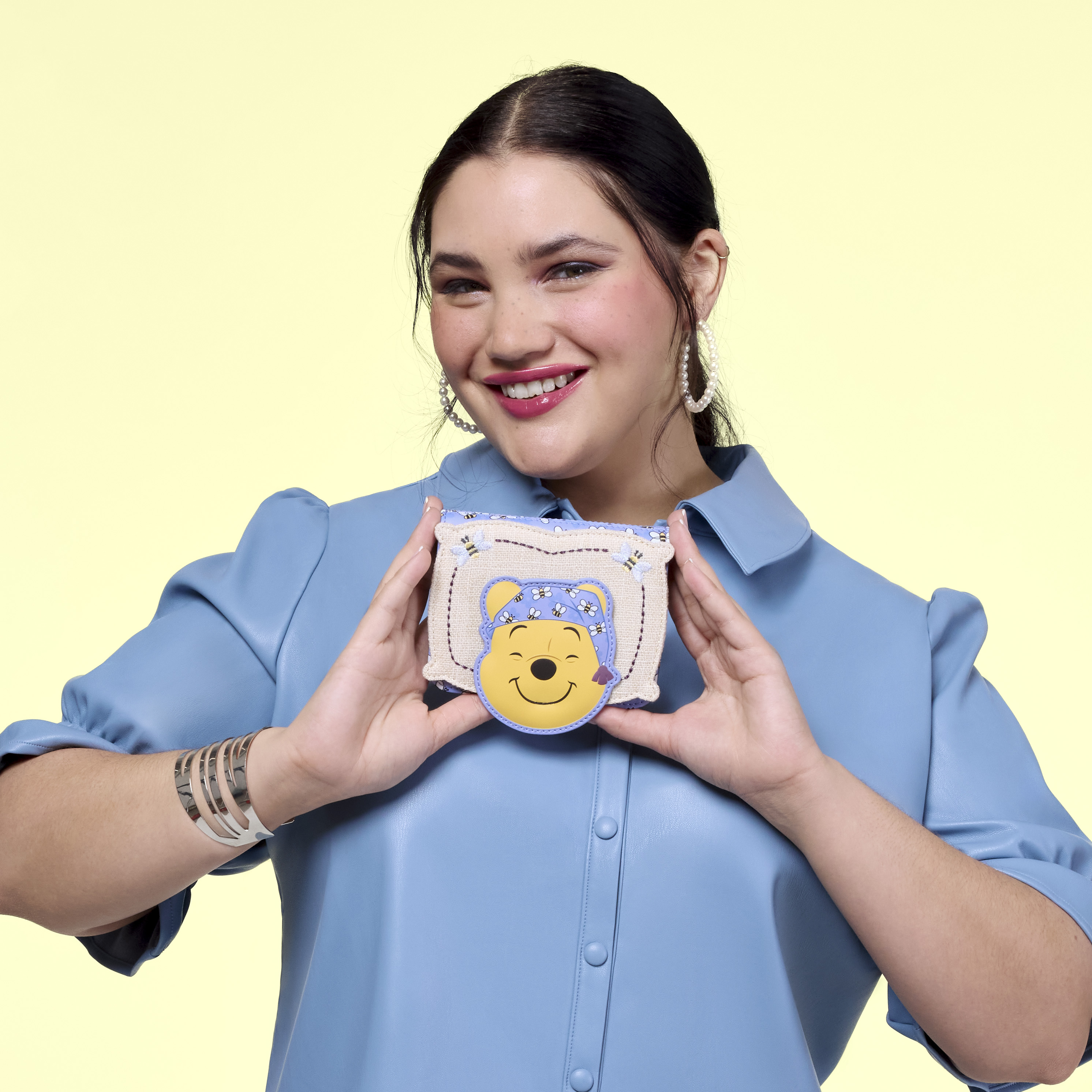 This wallet features Winnie the Pooh in his pajamas, sleeping with his head on a pillow. You'll find bees designed on his pajamas, and that pattern continues on the back of the wallet. You'll find woven fabric on the pillow, and embroidered details and bees on the pillow, too. Inside, there are four card slots and one clear ID slot.