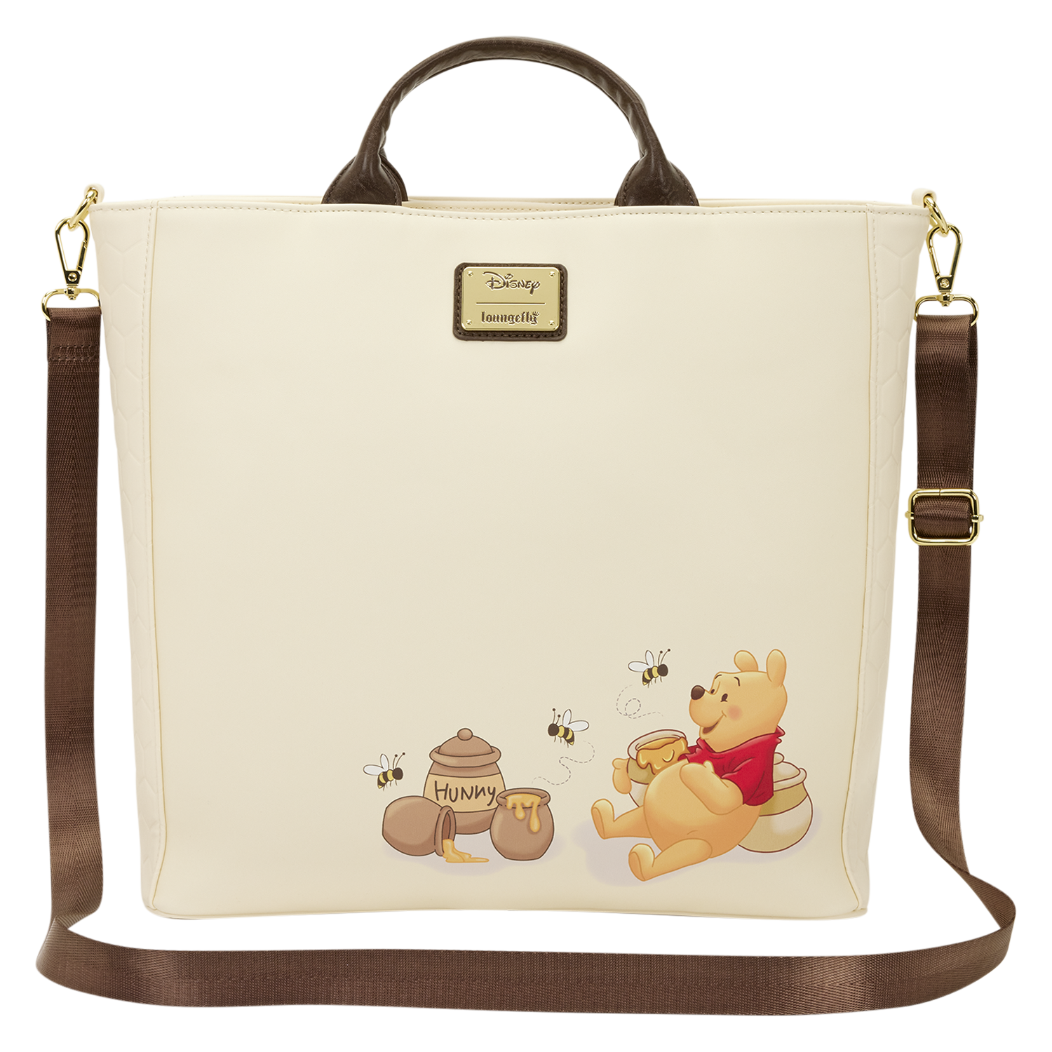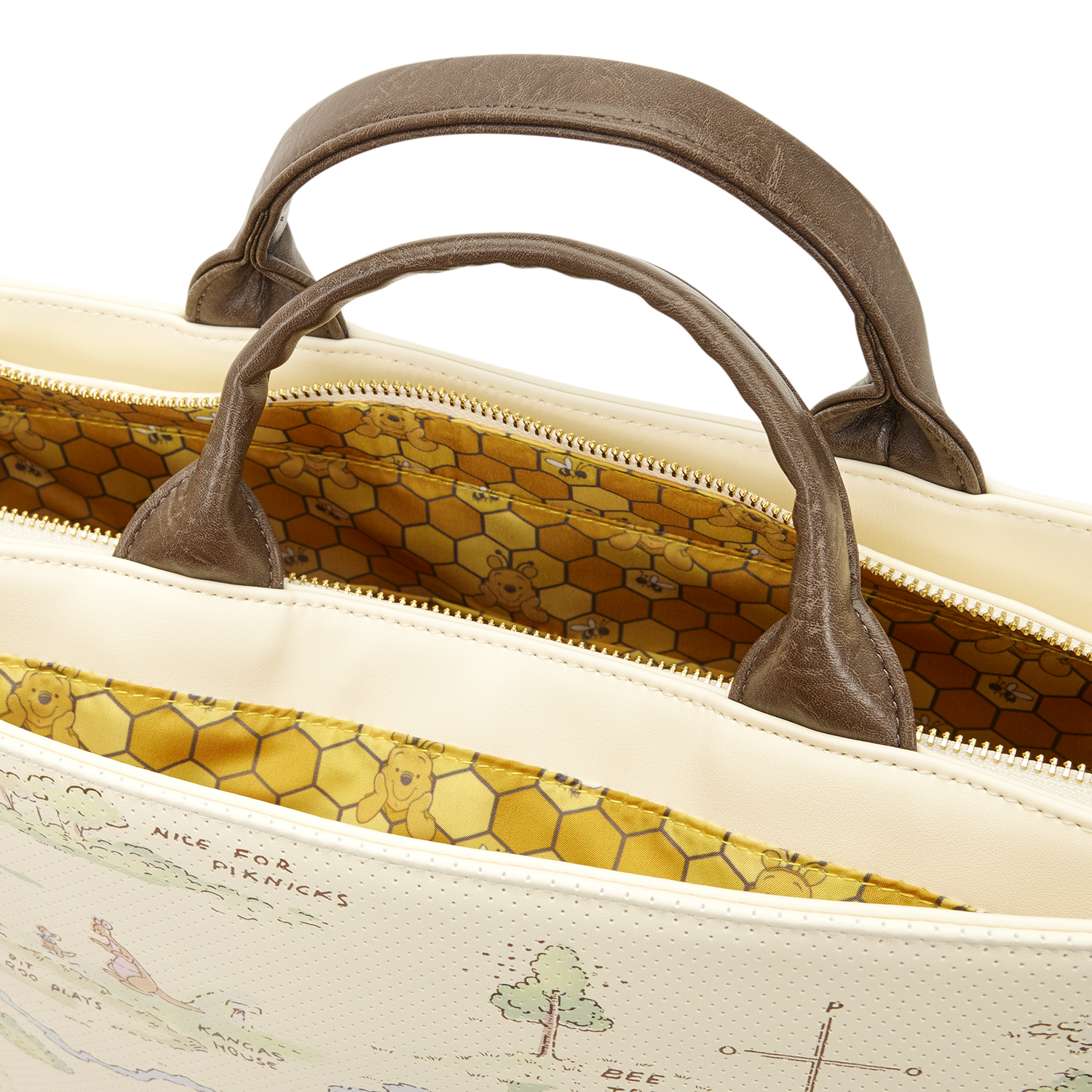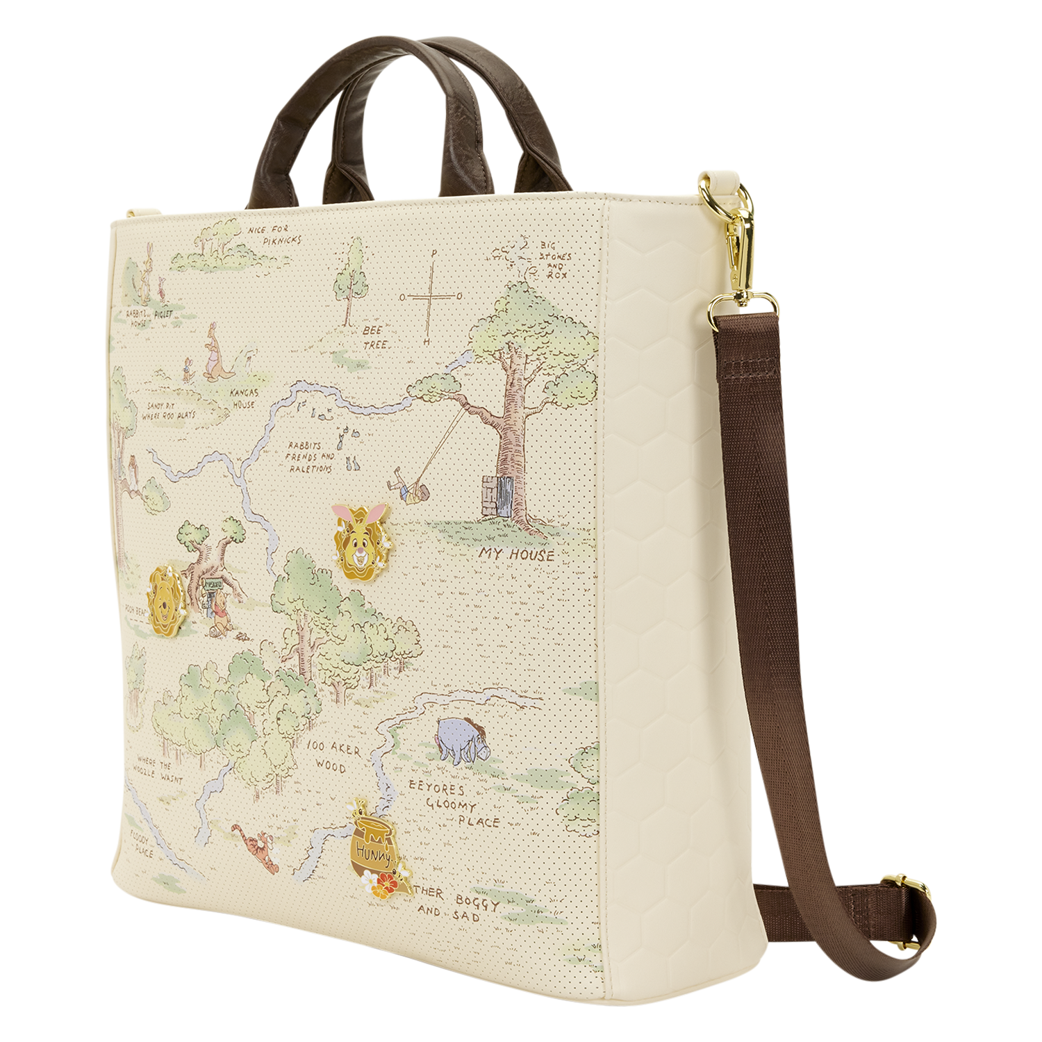 This tote bag makes every workday oh-so-cute! You'll find a map of the Hundred Acre Wood on the front. The material is perforated so you can put pins in it! Three enamel pins are included with this bag to get you started, and you can add whatever pins you already own! You'll find a debossed honeycomb pattern on the sides. Turn the bag around to find an image of Winnie the Pooh with a bunch of hunny pots and bees!
