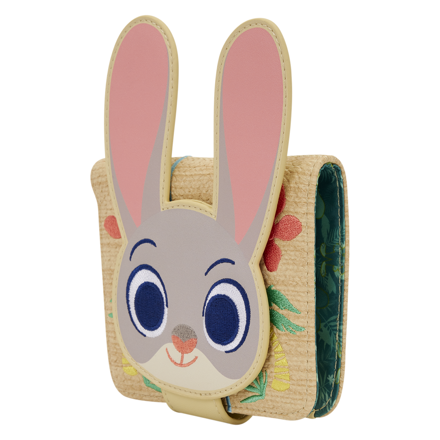 You'll find woven material all over the wallet. An applique of Judy's face appears on the front clasp. You'll also find embroidered details of flowers and palm trees on the front and back. Inside, there are four card slots and one clear ID slot. It's a must to show off your favorite character every day!