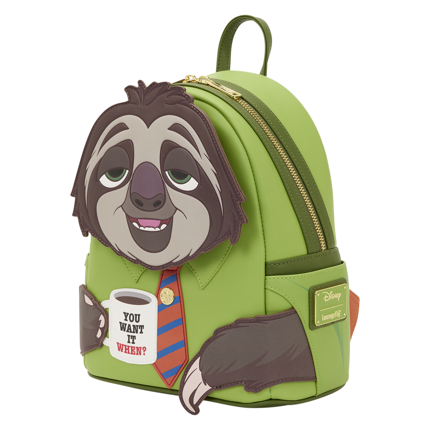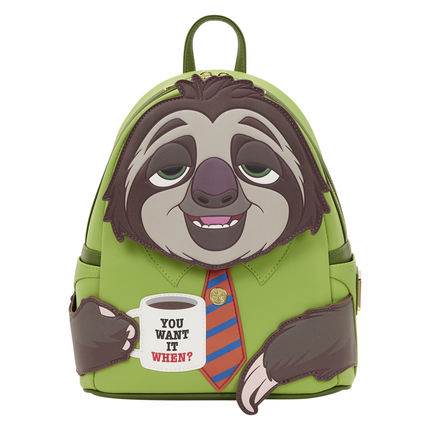 Flash comes to life in applique and debossed detail. He smiles out from the front of the bag and wears a tie and holds a cup of coffee that says "You Want It When?" on the mug. The straps of the bag match his tie!