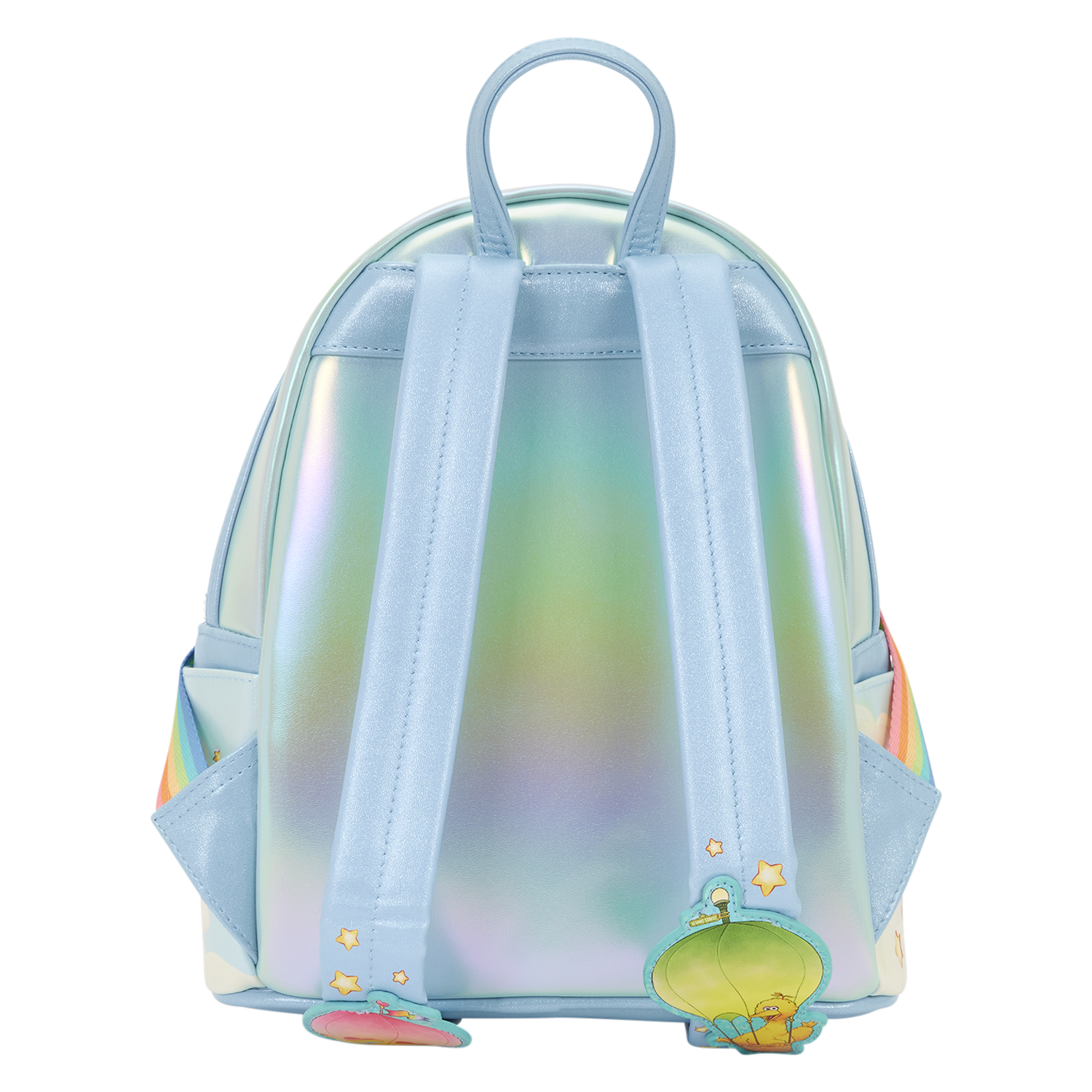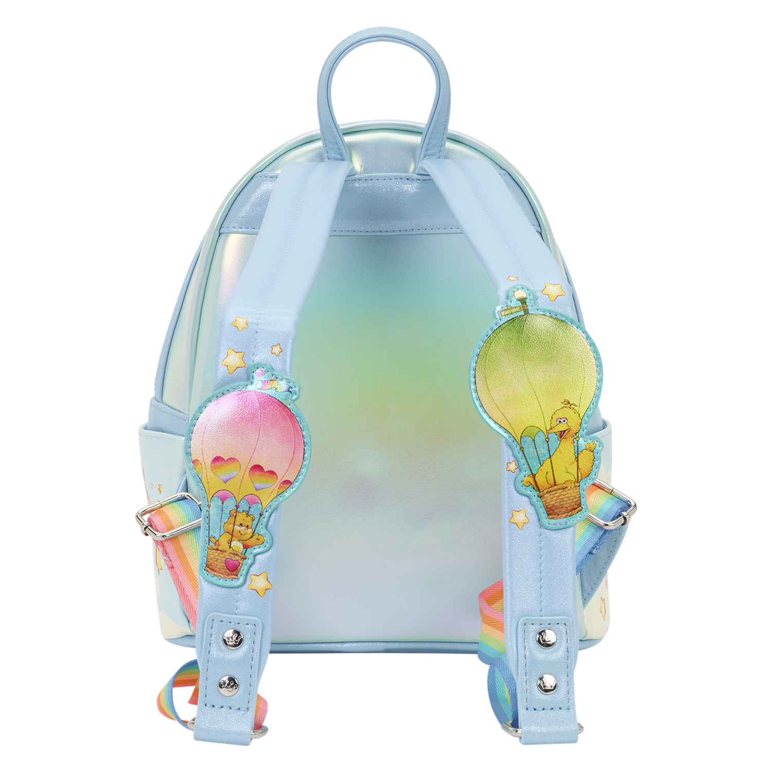 You'll find all your favorite characters hanging out together on this bag amongst the clouds and a rainbow! You'll find more characters on the side pockets and even a couple in hot air balloons on the straps! Iridescent and glitter details give this bag an extra special touch!