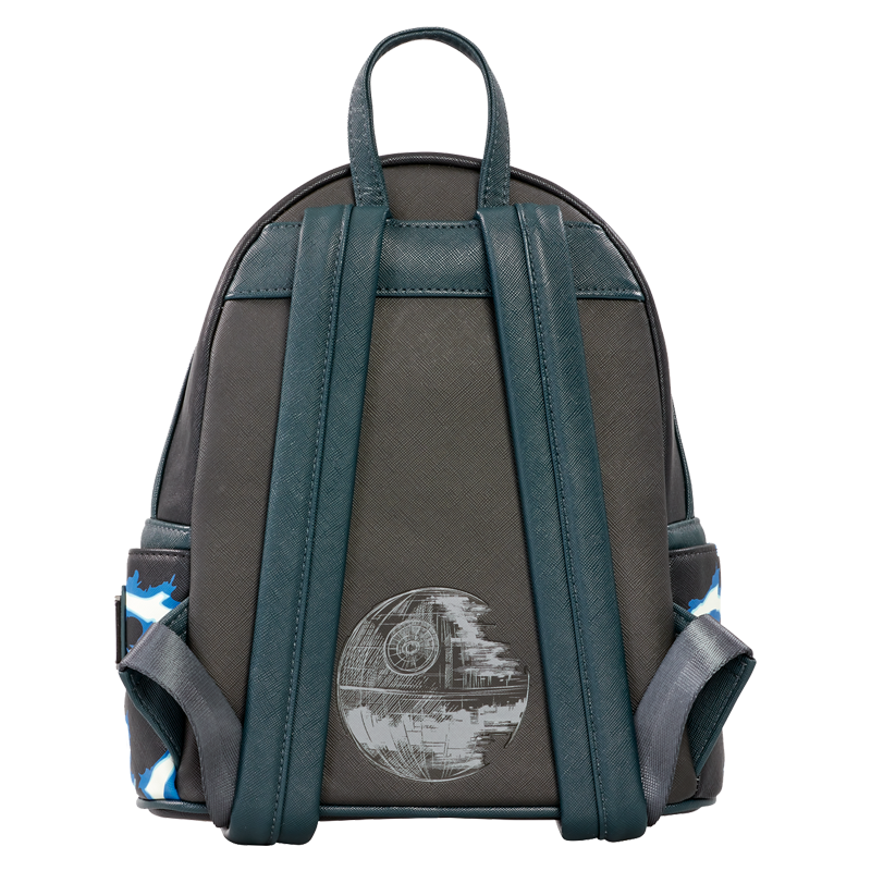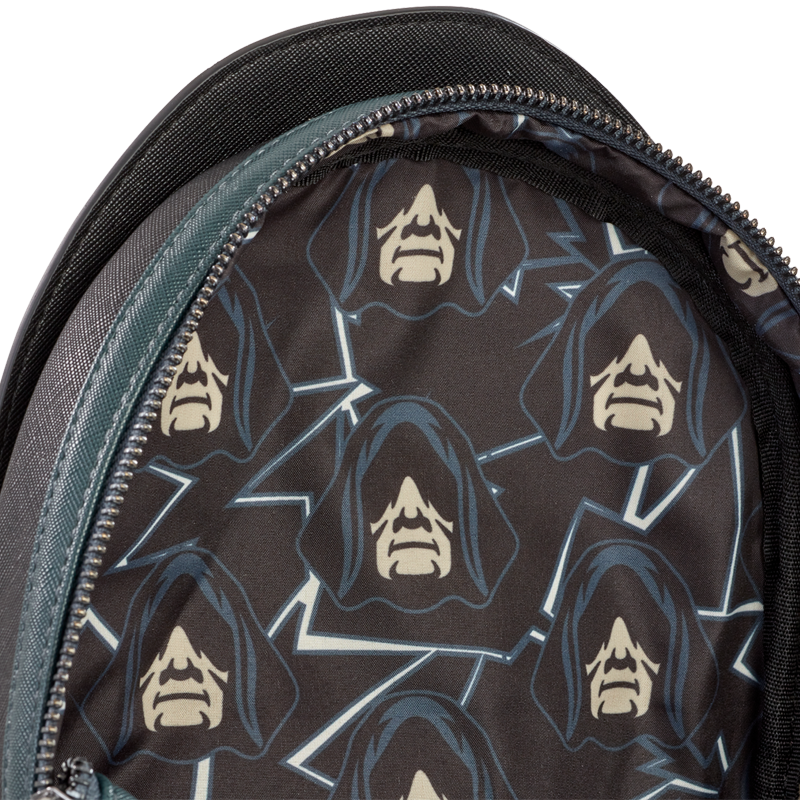 Palpatine appears on the front of the bag in applique form. He wears a black hood. His hands are appliques on the front pocket. He wields Force Lightning, which strikes over the front and side pockets. A zipper pull of the Empire’s symbol completes the look.