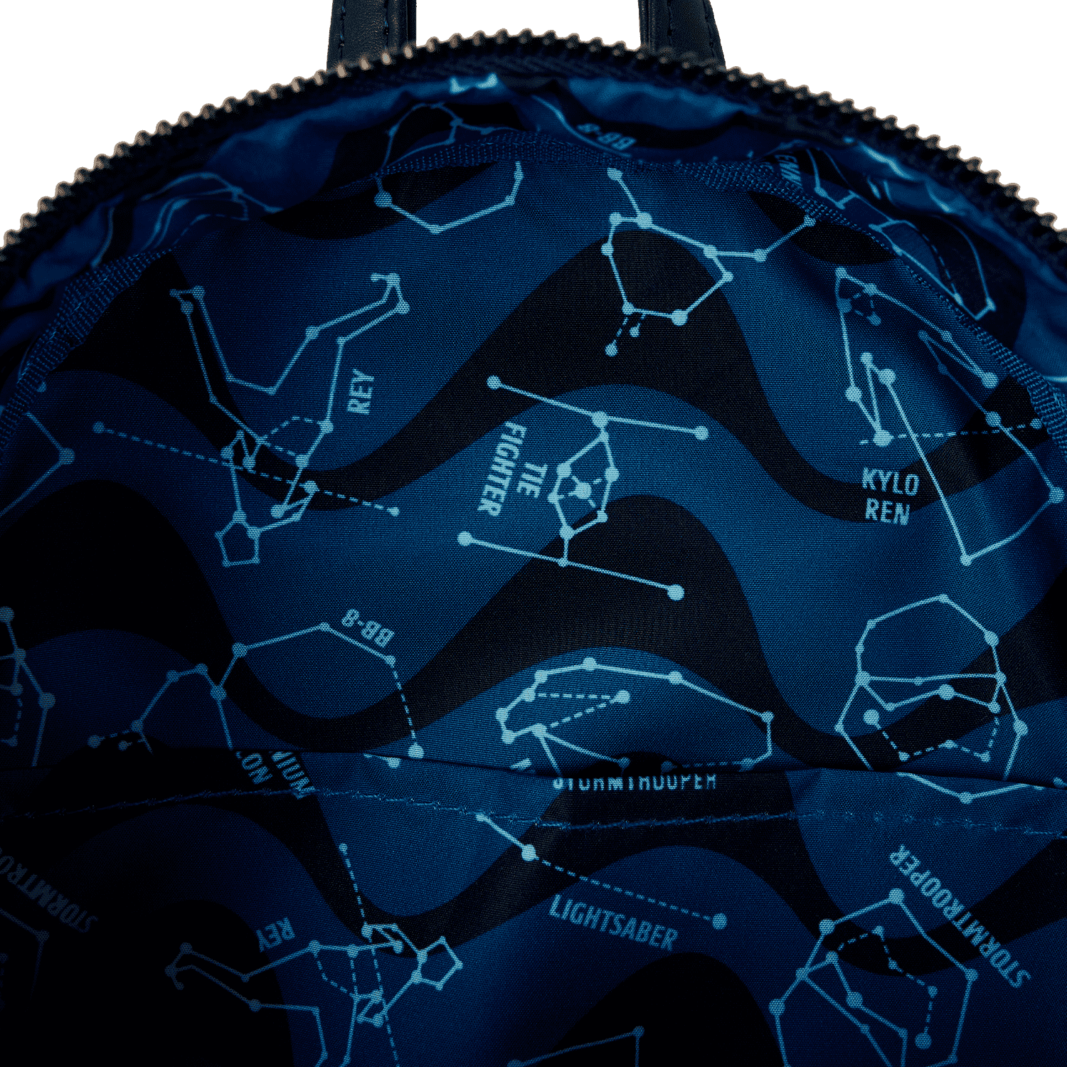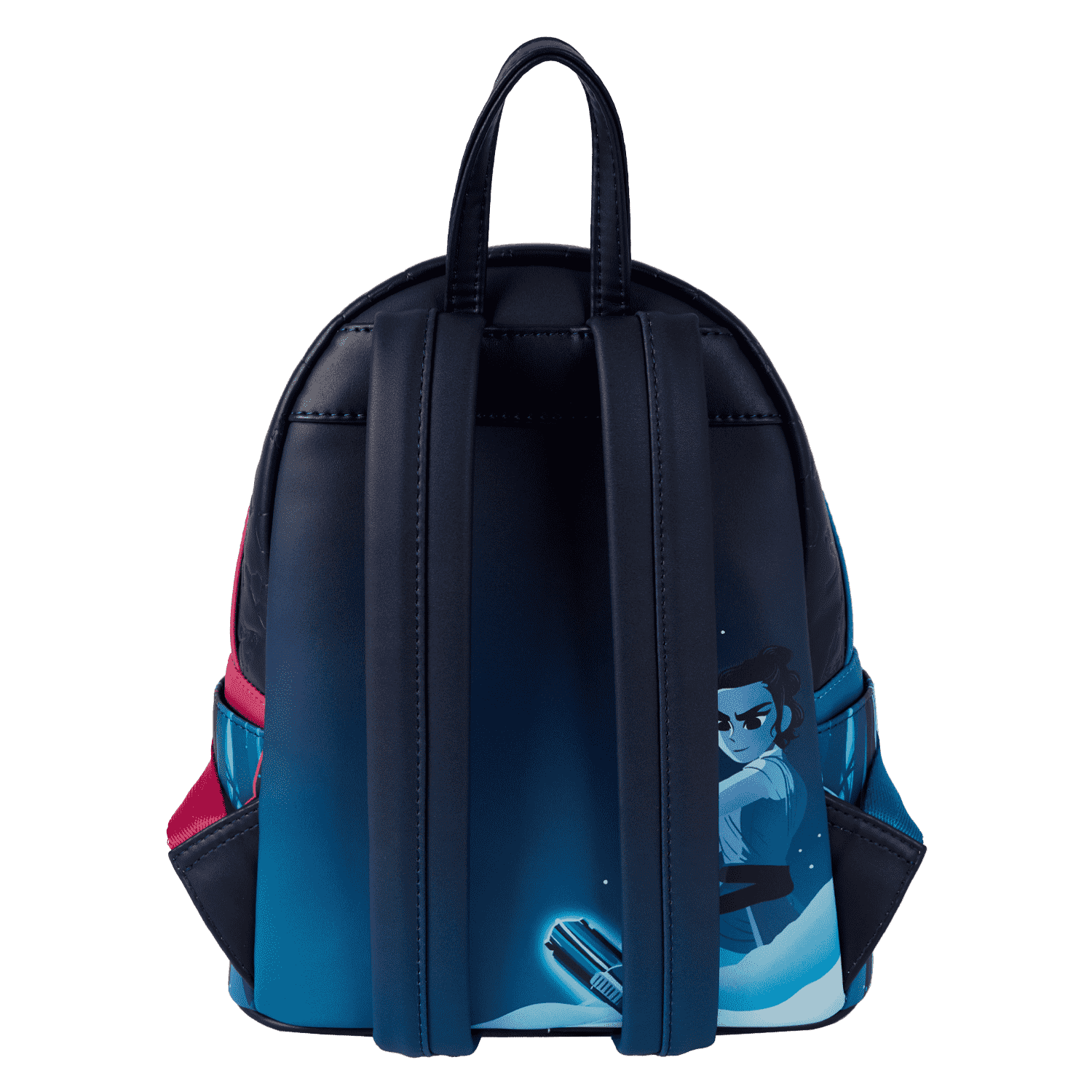 Destinies collide as darkness meets light! Bringing Rey™ and Kylo Ren™ face to face, this mini backpack paints a snowy scene from STAR WARS: THE FORCE AWAKENS™. Turn down the lights to see their lightsabers glow with LED lights! With plenty of storytelling details hidden in the design, this accessory makes a fated addition to any STAR WARS fan’s wardrobe.
