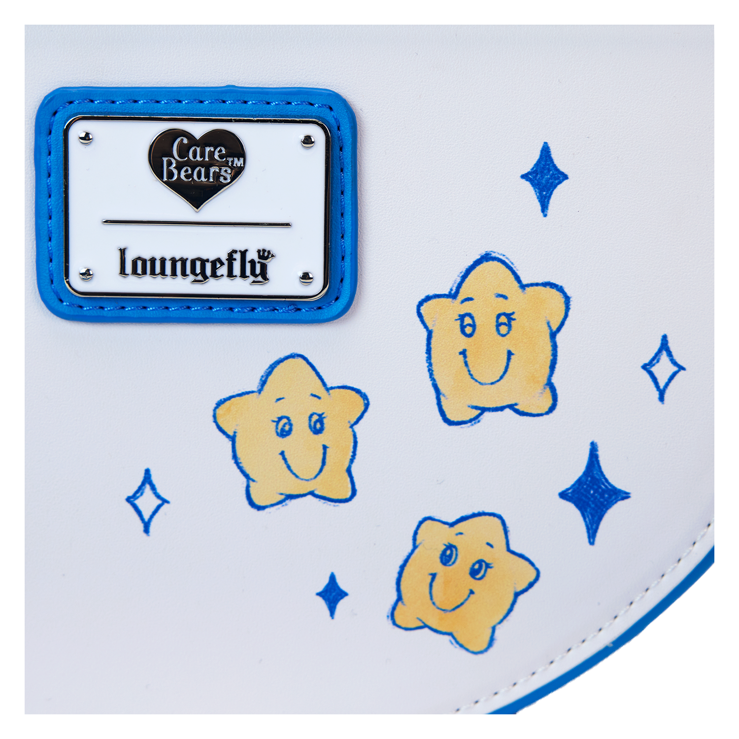 Prepare to stare! This Care Bears™ crossbody bag is carefully designed to bring so much joy. The front flap of this half-moon style bag features an applique of Cheer Bear™ standing on the shoulders of Grumpy Bear™, and they’re surrounded by other Care Bears who are playing among the clouds. Lift the flap, and you’ll find colourful print hearts. The handle is a padded applique in the shape and colours of a rainbow! Two applique clouds appear below, and a detachable vegan leather charm of a smiling sun tops off the look. Pack just what you need for the day to gather your friends and spread kindness wherever you go.