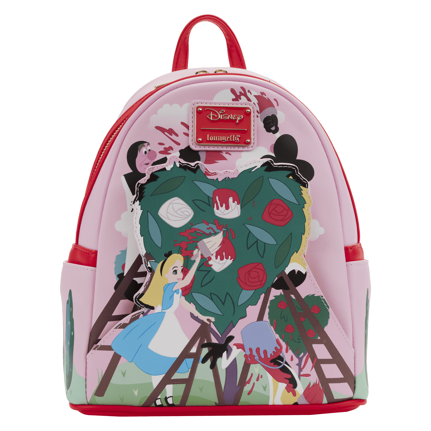 The Loungefly Disney Alice in Wonderland Painting the Roses Red Mini Backpack is made of vegan leather (polyurethane). Bag has adjustable shoulder straps, sturdy metal hardware, appliques, and printed details.