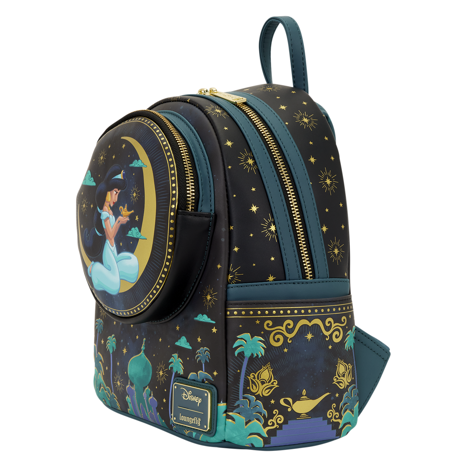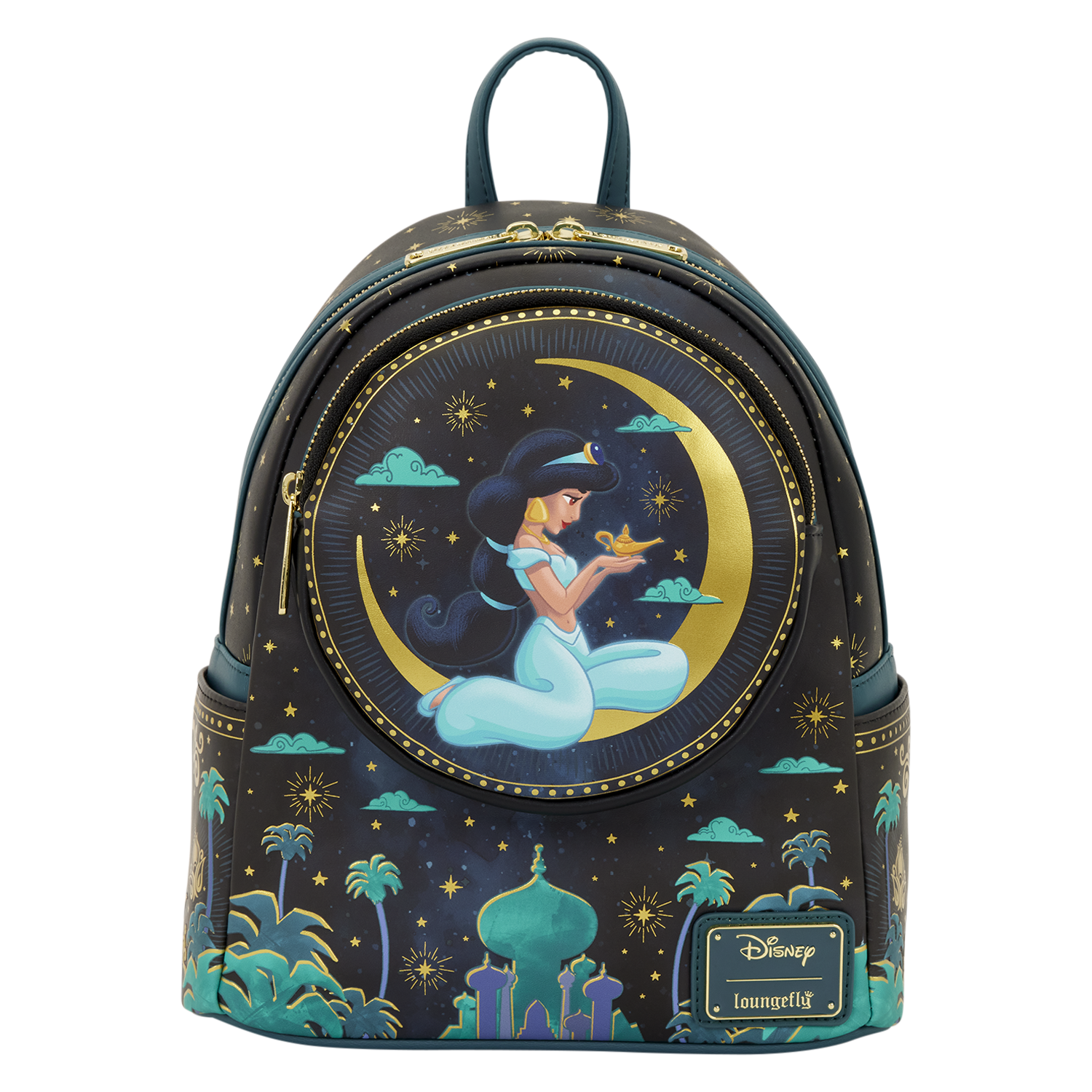 This mini backpack features Princess Jasmine sitting with the lamp on a circular front pocket. A golden crescent moon is displayed behind her. Below, you'll find details of the palace within a nighttime landscape. On the straps, you'll find details of the lamp!