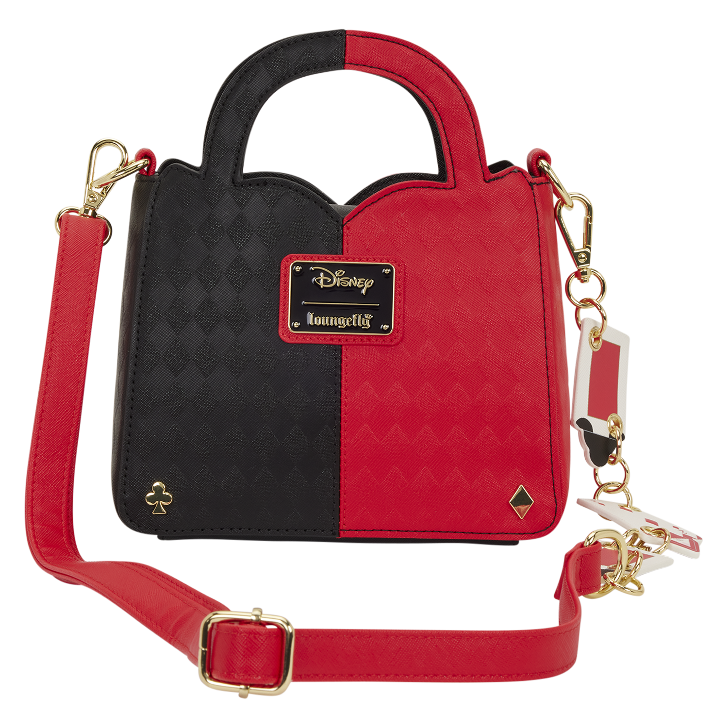 This crossbody bag is inspired by the Queen of Hearts from Disney's Alice in Wonderland. You'll find a debossed pattern of diamonds all over, and the bag is half red and half black. In the center, in a heart, you'll find the silhouette of the Queen of Hearts. Attached to the crossbody strap are card soldiers with gold foil details.