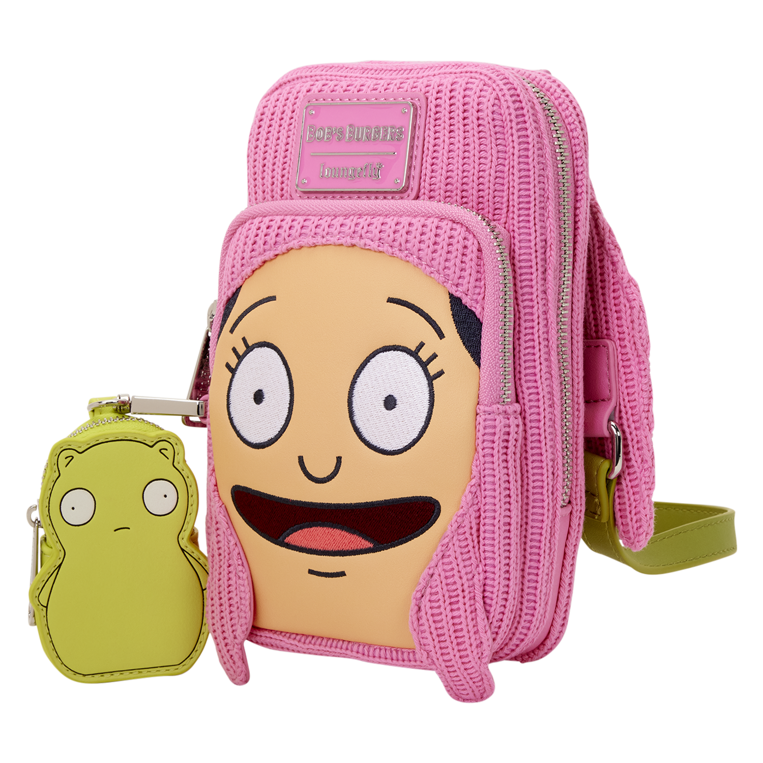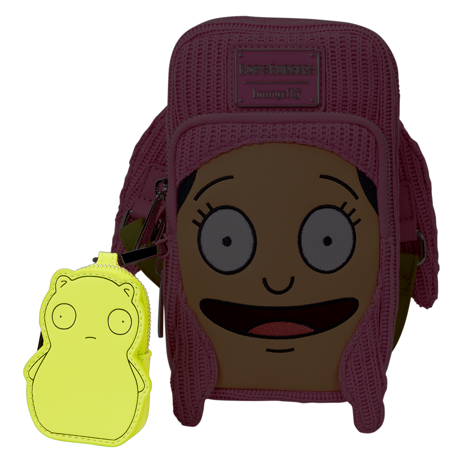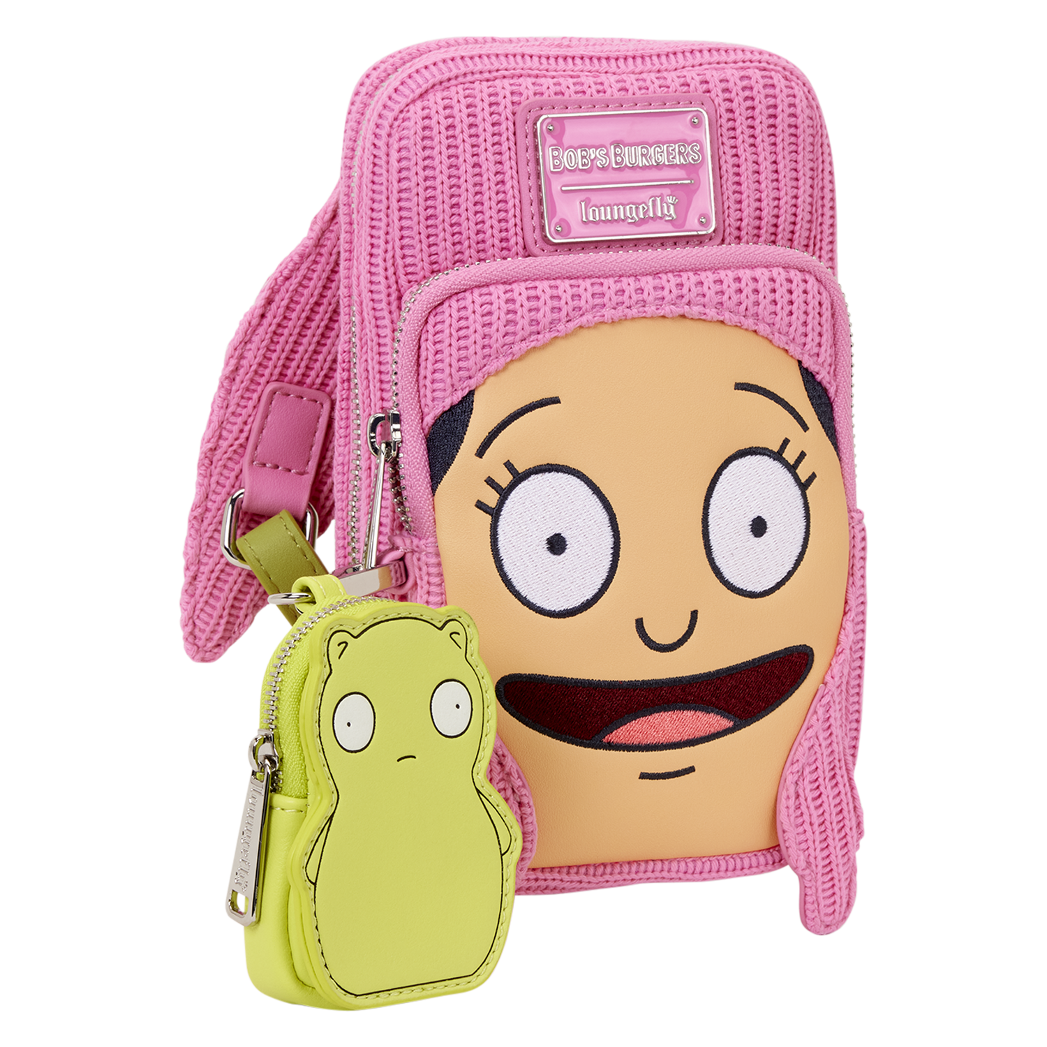 This crossbody bag features Louise from Bob's Burgers on the front with embroidered and debossed details. She wears her signature pink hat, and the ears attach to the crossbody strap. Turn the bag around to find an image of Louise sitting on the shoulders of Bob. The detachable coin bag glows in the dark!