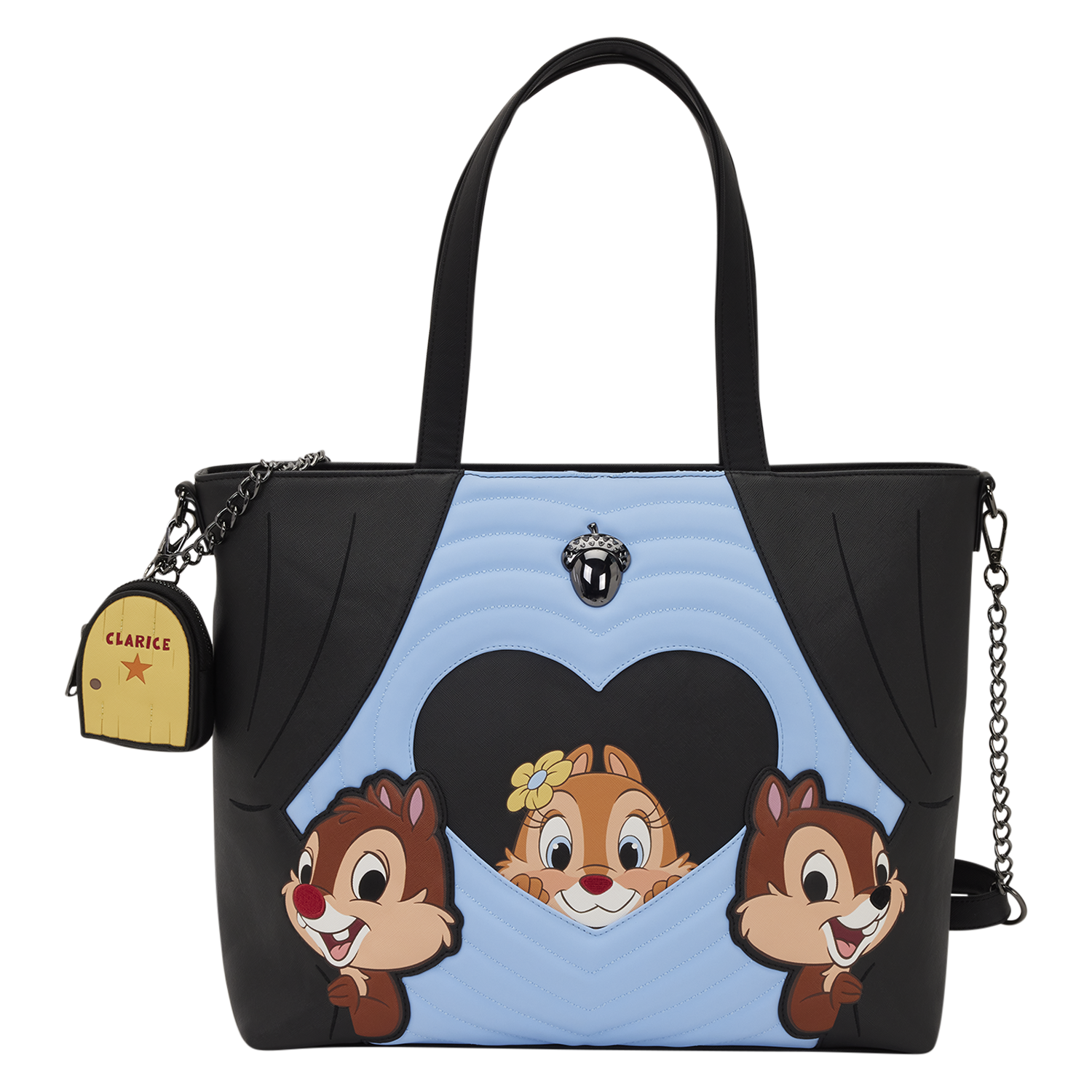 This tote bag is inspired by the short film, Two Chips and a Miss. You'll find Clarice front and center within a blue heart-shaped frame. Chip 'n' Dale appear on either side of her behind black theatre curtains. Turn the bag around to find another image of Clarice on the back. Quilted material, padded appliques, soft polyurethane, and embroidered details really make this bag stand out. Attached to the crossbody strap, you'll find a coin bag in the shape of Clarice's dressing room door.