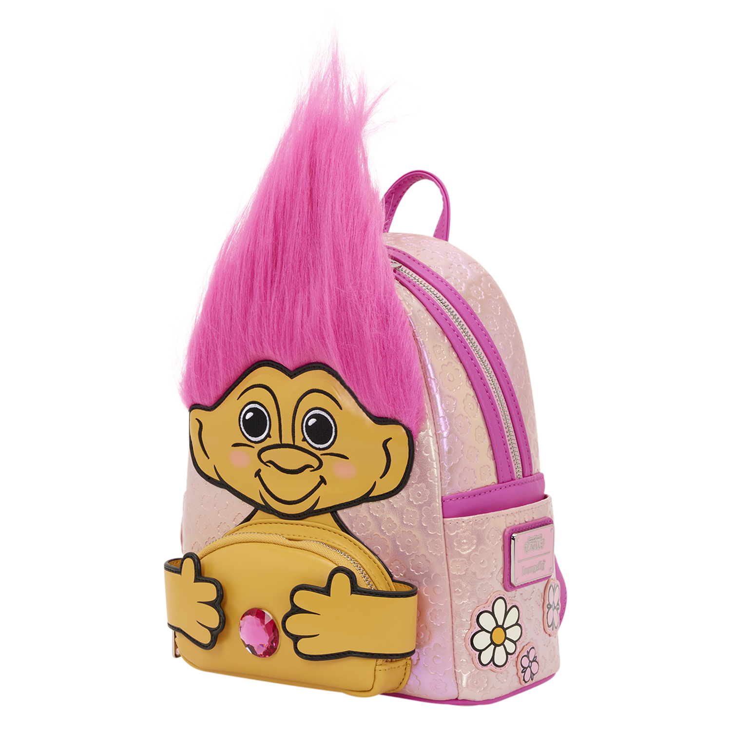You'll find a Good Luck Troll front and center on the bag with pink hair sticking up from its head. Embroidered and padded applique details bring the troll to life. Behind it, you'll find a debossed pattern of flowers against a pink background. On the side pockets and straps, you'll find more floral details!