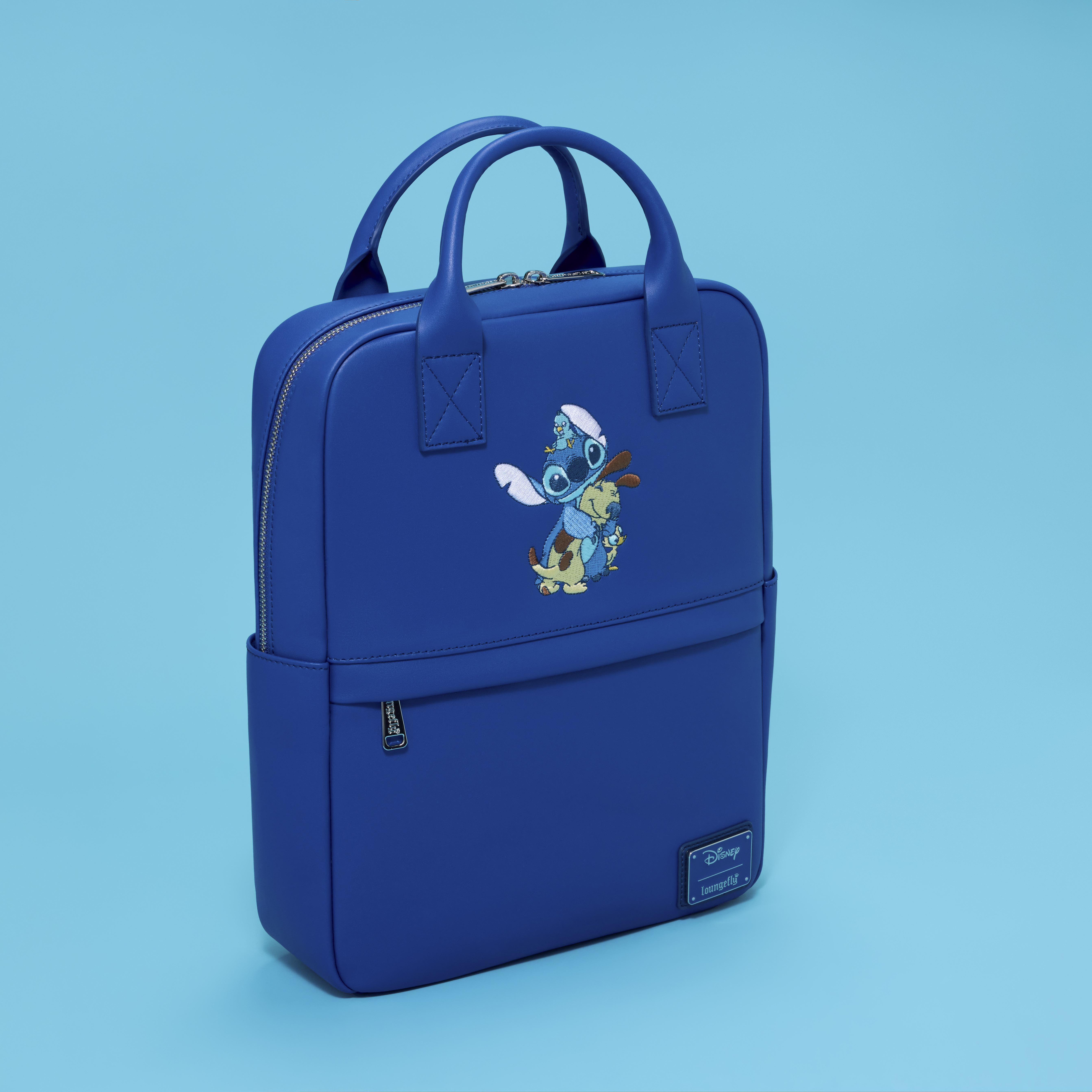 This mid-size backpack is blue and features printed details of Stitch hugging some animal friends, like a dog, a duckling, and a bird. You'll find a zippered front pocket and side drop pockets in addition to the main zippered compartment. It's ready to hold your essentials on any adventure!
