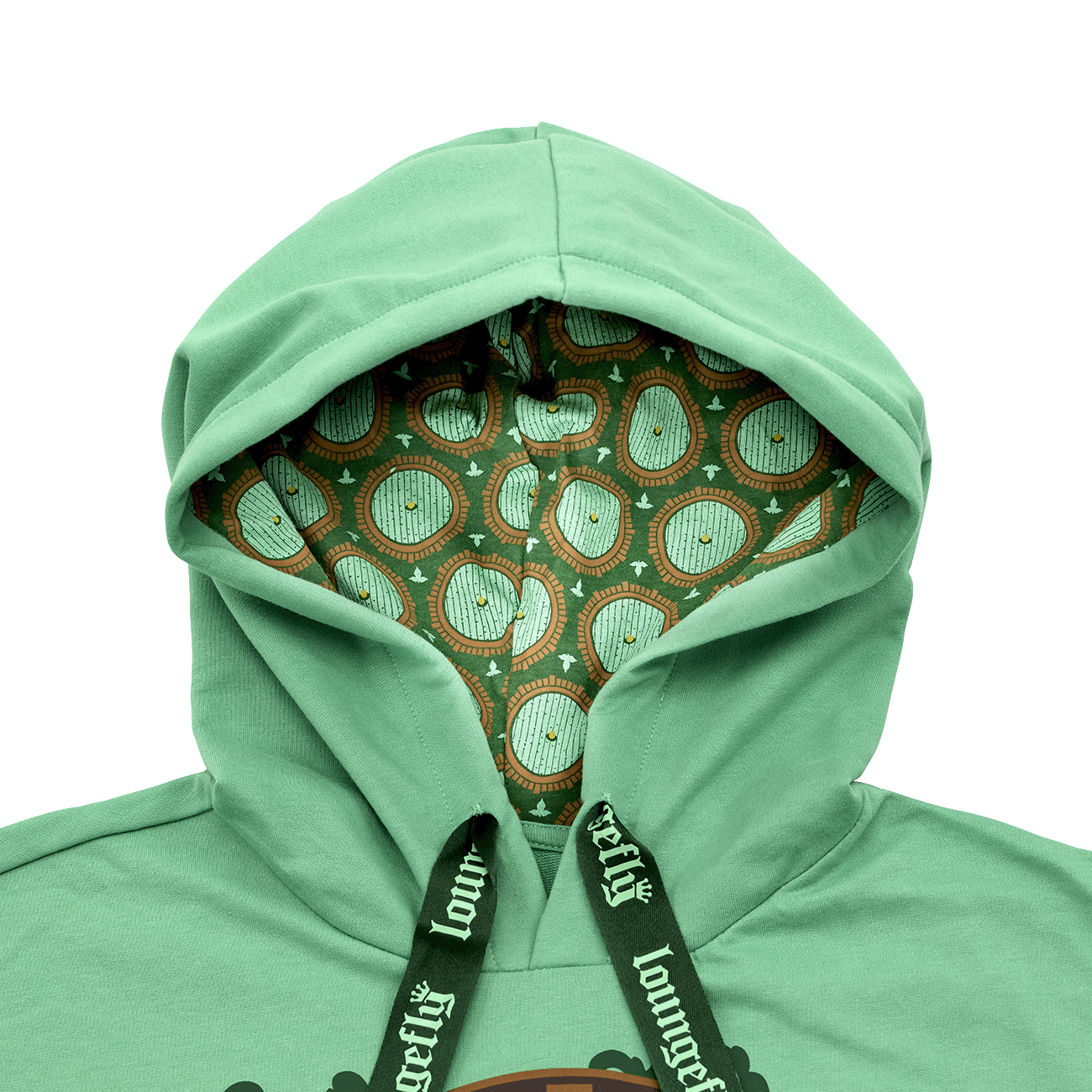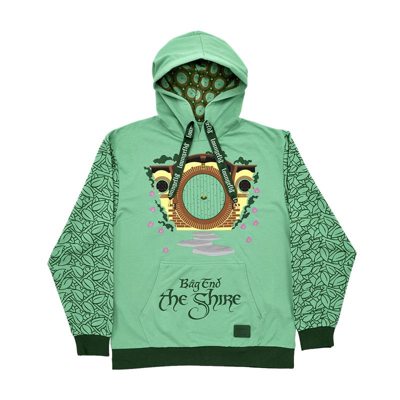 Stop by Bag End™ for a bite to eat in style with this exclusive Loungefly The Lord of the Rings™ The Shire™ Hoodie! Featuring a print of Bag End and a leaf motif down both sleeves, this hoodie is sure to add a dash of Hobbiton™ charm to your favourite outfit. Pink flowers embroidered around the Hobbit Hole™ add a pop of contrast to this vibrant green garment. “Bag End, The Shire” is also printed in elegant, spiraling lettering across the front pocket. Whether you’re bringing a piece of home with you on your next adventure or getting cozy at your own Hobbit Hole, this comfortable hoodie will make the perfect addition to your wardrobe!