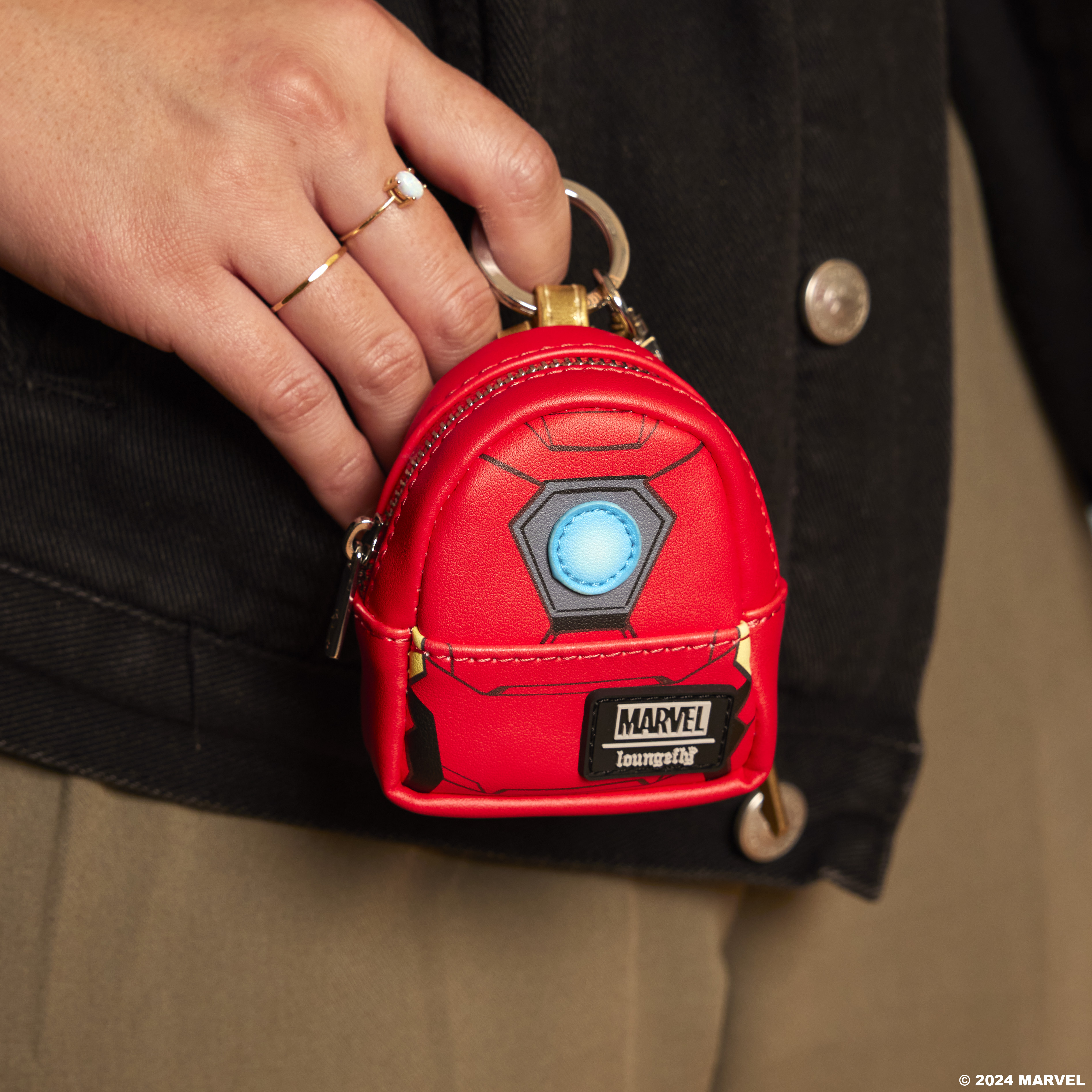 The Loungefly Marvel Avengers Cosplay Mini Backpacks Mystery Box Keychains are made of vegan leather (polyurethane) and come with detachable lobster hooks, so you can attach them to other Loungefly accessories. Other features include silver-colored metal hardware, applique, and printed details. Note the inside lining featuring the Loungefly logo.