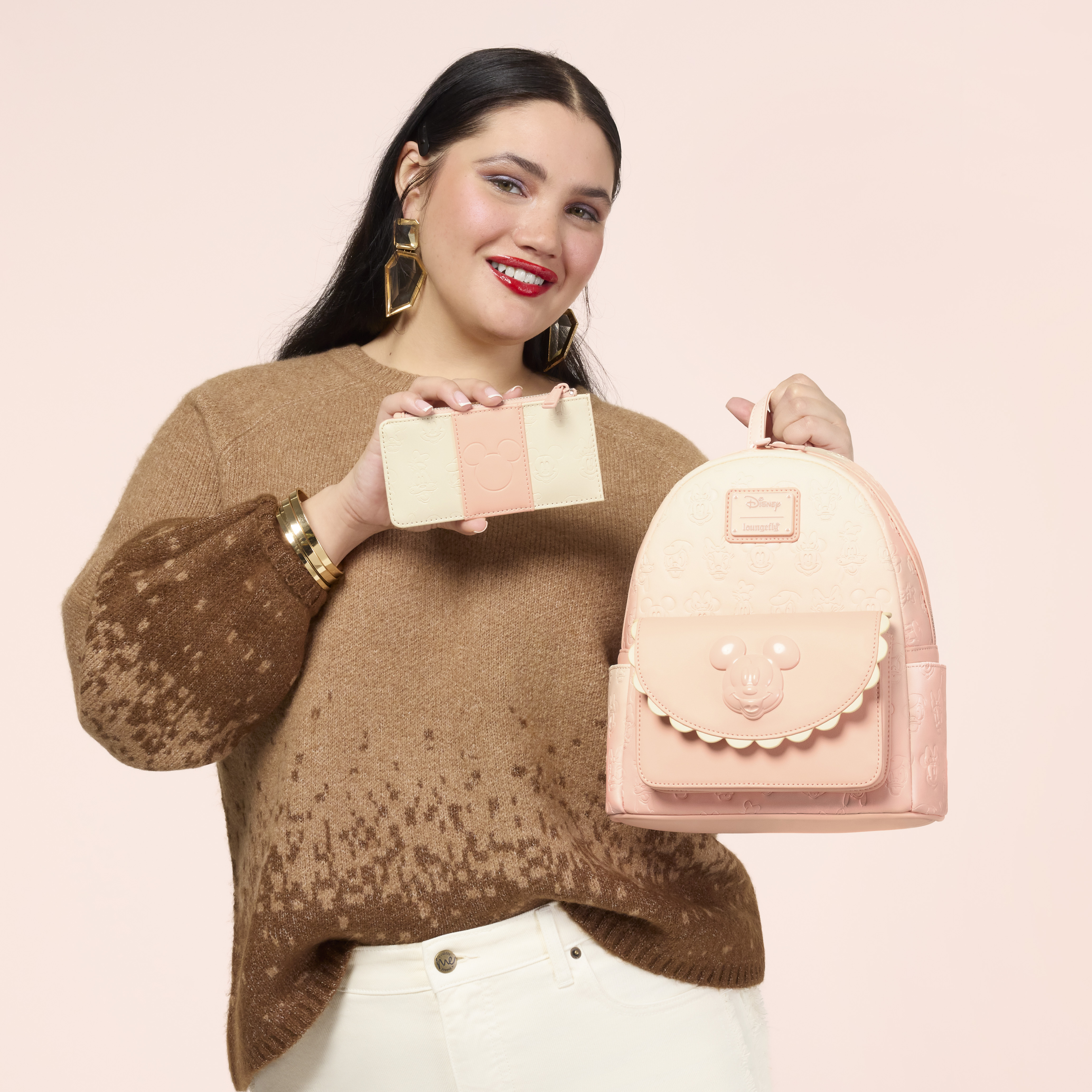 This mini backpack features a pink ombre design with debossed details of Mickey Mouse and all his friends! You'll find a painted molded metal rivet of Mickey Mouse on the front pocket, which also features a flap with a super cute scalloped edge. Pink straps bring the whole look together!